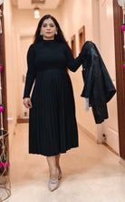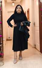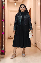 BLACK AND BROWN WRINKLE FABRIC DRESS WITH PREMIUM LEATHER JACKET