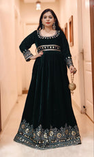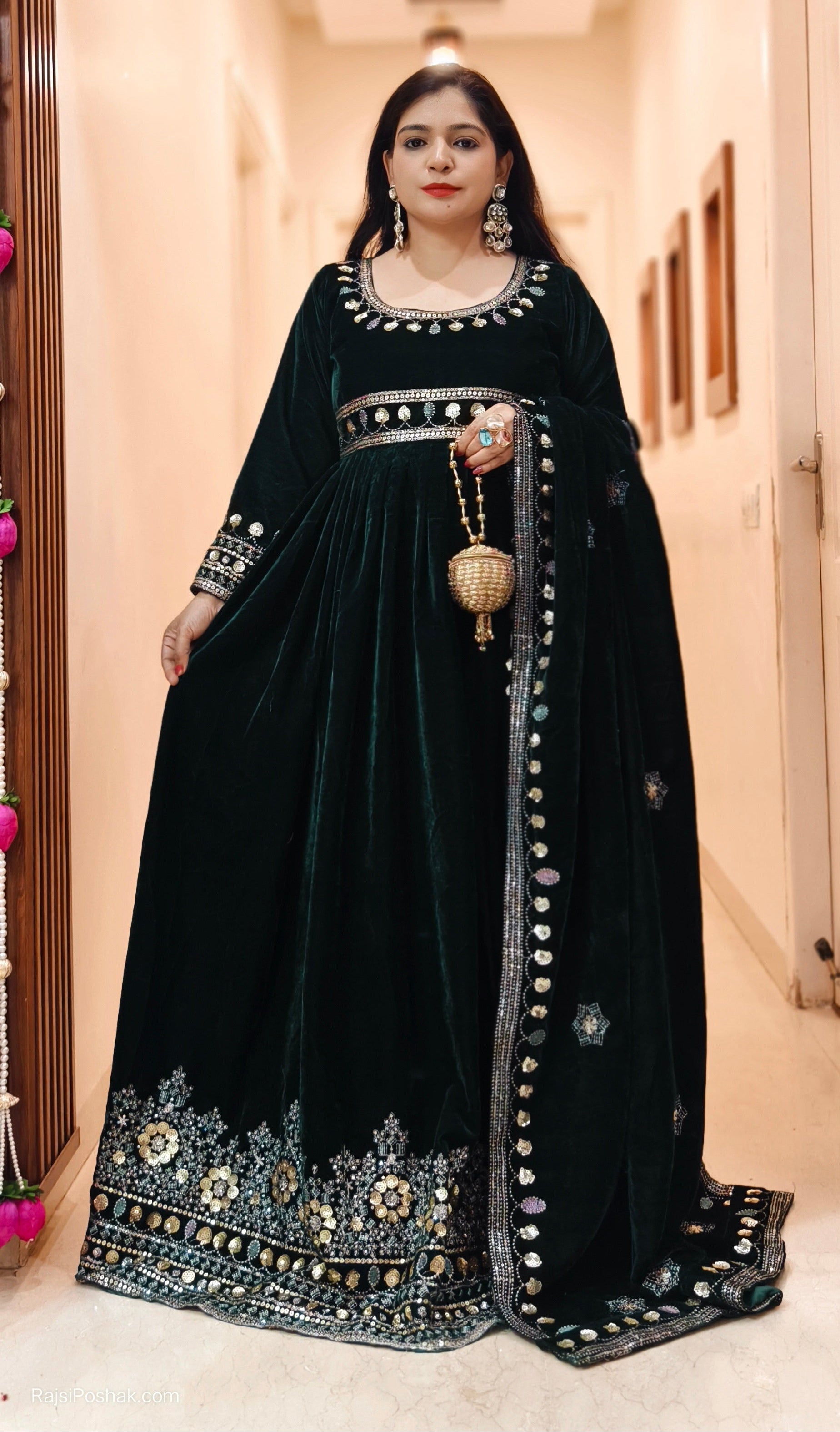 GREEN EXCLUSIVE VELVET ANARKALI WITH LACE WORK AND HEAVY DUPATTA