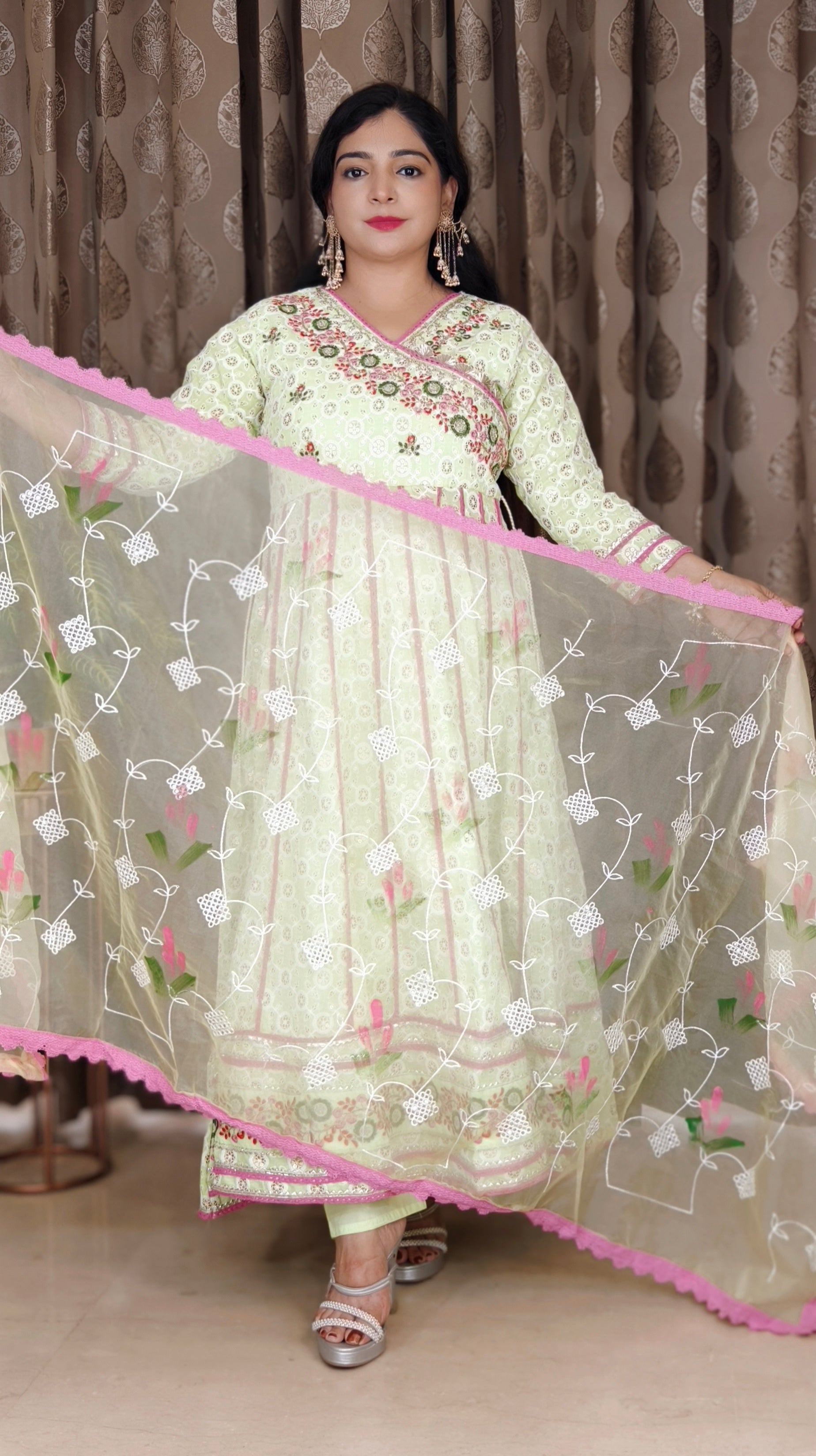 A GREEN SHIFALI COTTON ANARKALI WITH COTTON DUPATTA is a perfect blend of elegance and comfort. The outfit features a soft, breathable cotton fabric, offering all-day comfort while maintaining a refined look. The adds a modern twist to the traditional Anarkali silhouette, enhancing its flow and movement. The delicate around the edges provide a feminine, intricate touch, elevating the overall design. Paired with matching afghani pants, this ensemble combines traditional elements with contemporary style, making it ideal for casual outings, festive events, or semi-formal occasions.