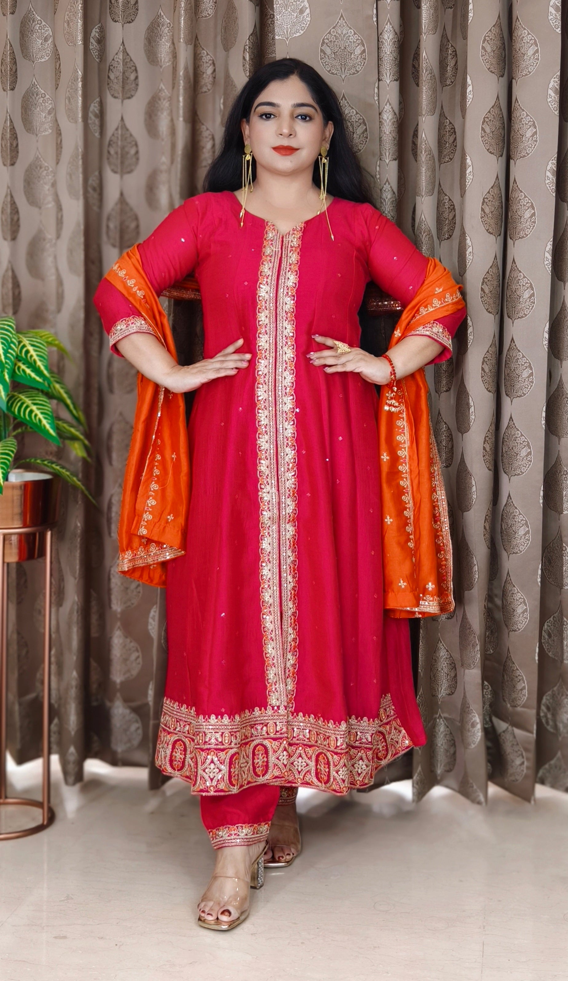 HOT PINK SILK ANARKALI WITH CONTRAST DUPATTA