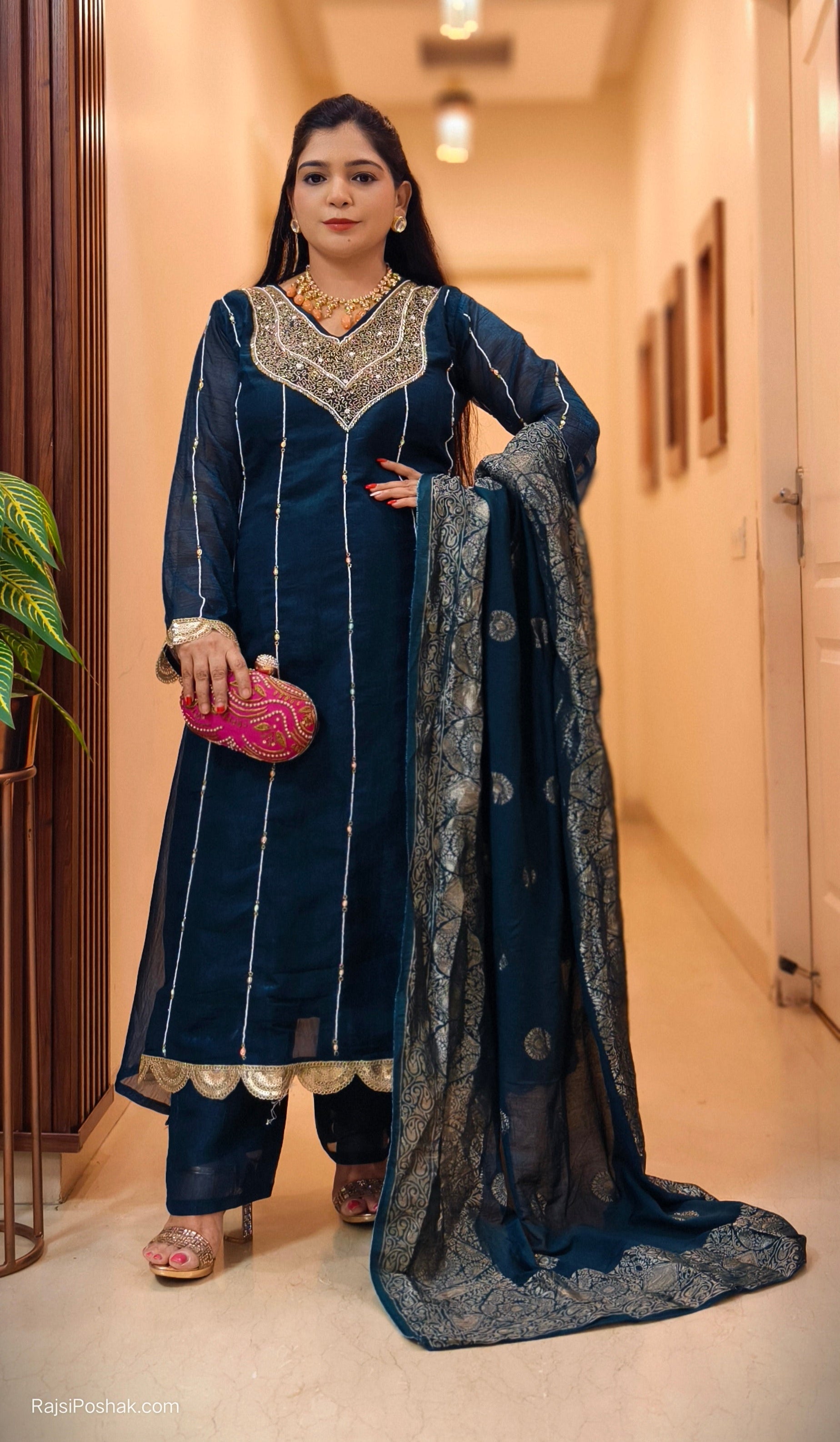 A must have PEACOCK BLUE TISSUE ANARKALI WITH DISIGNER PANT AND BANARSI DUPATTA in your wardrobe. It comes with Printed dupatta.