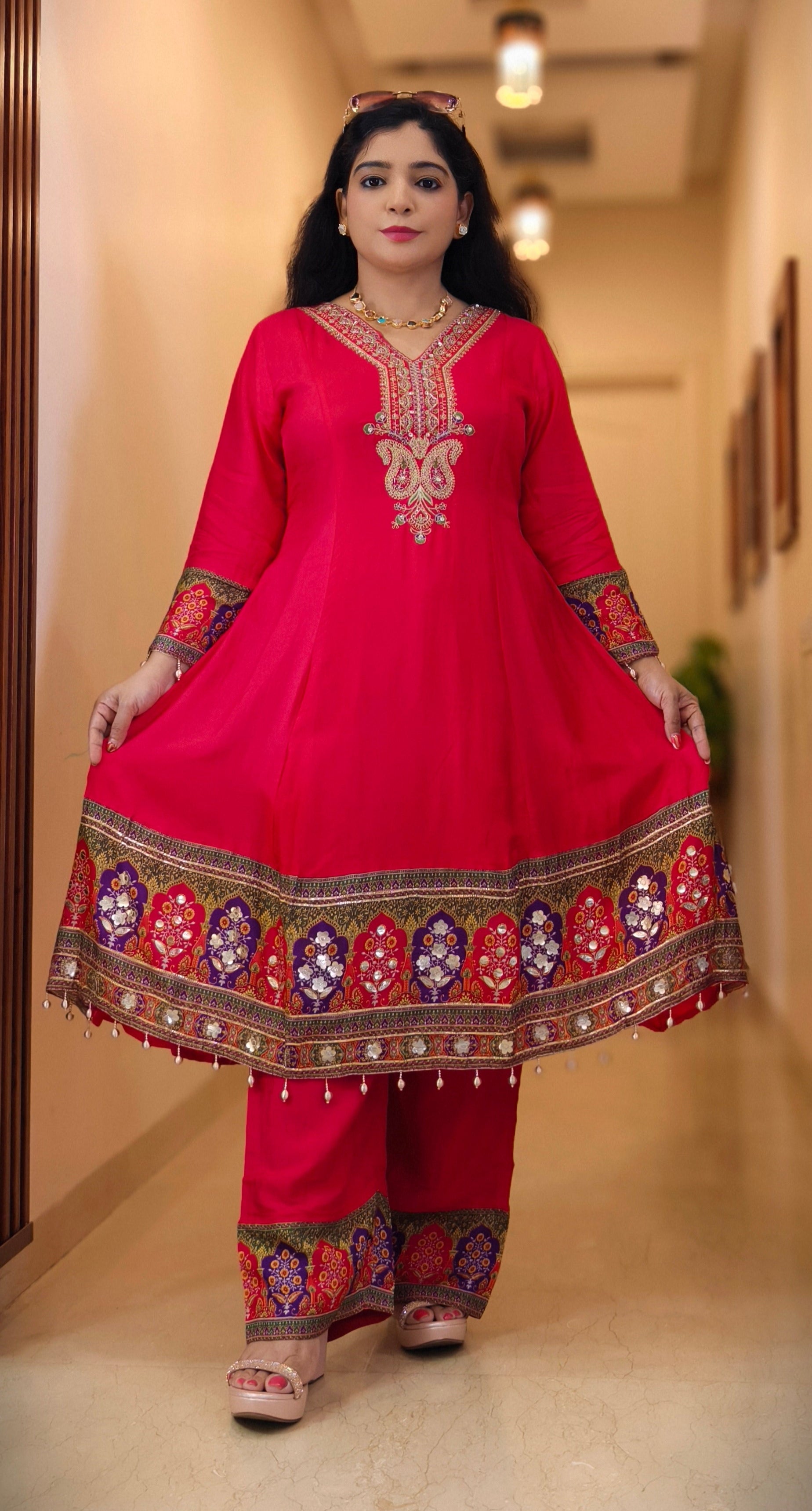 This elegant RED COTTON MUSLIN FULL FLAIRED SHORT ANARKALI WITH DUPATTA features intricate floral embroidery, adding a touch of sophistication to your wardrobe. The suit comes with a matching dupatta, completing the look with a cohesive and stylish ensemble. Perfect for special occasions or formal events, this outfit is sure to make a statement and turn heads wherever you go.