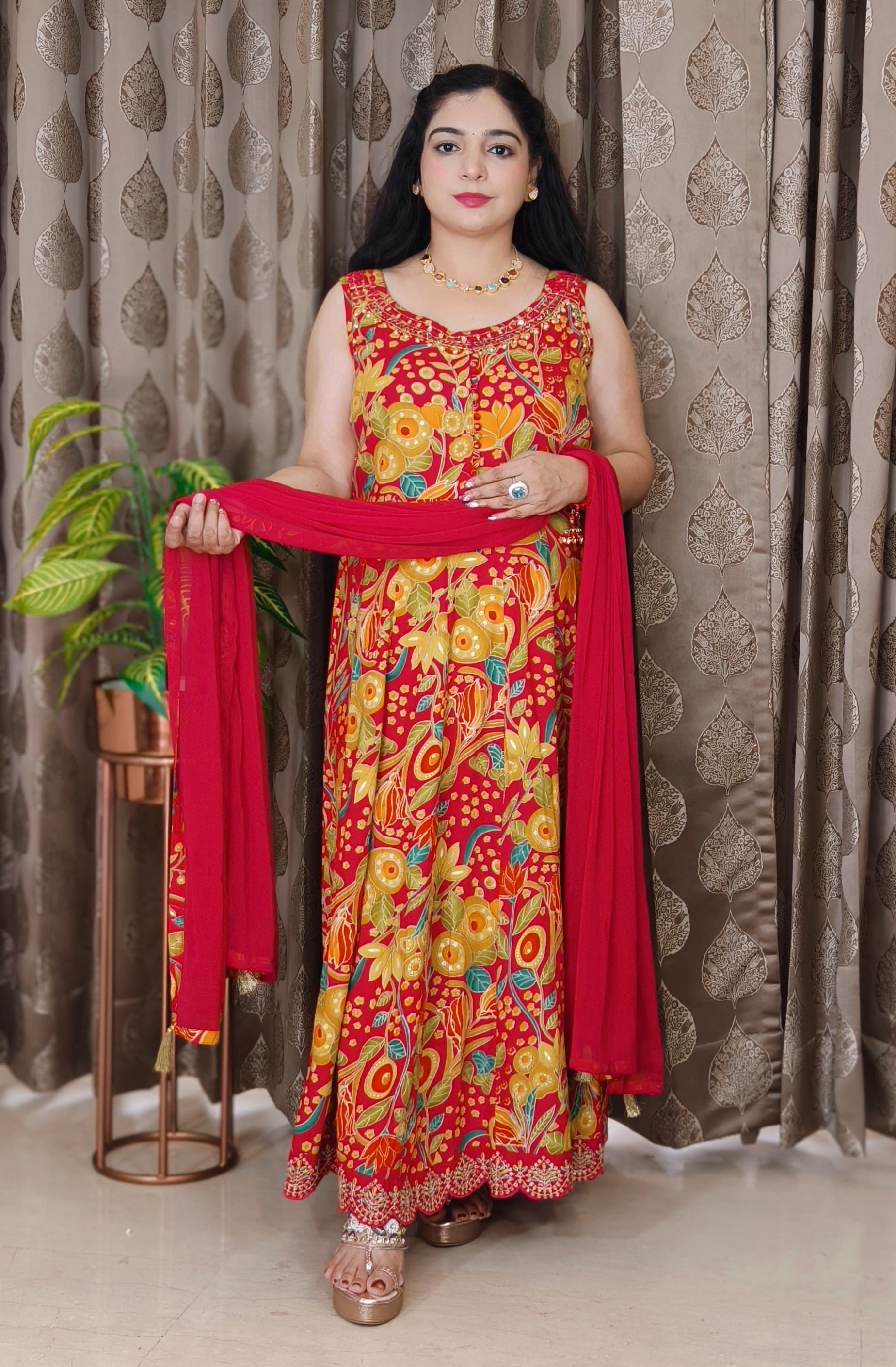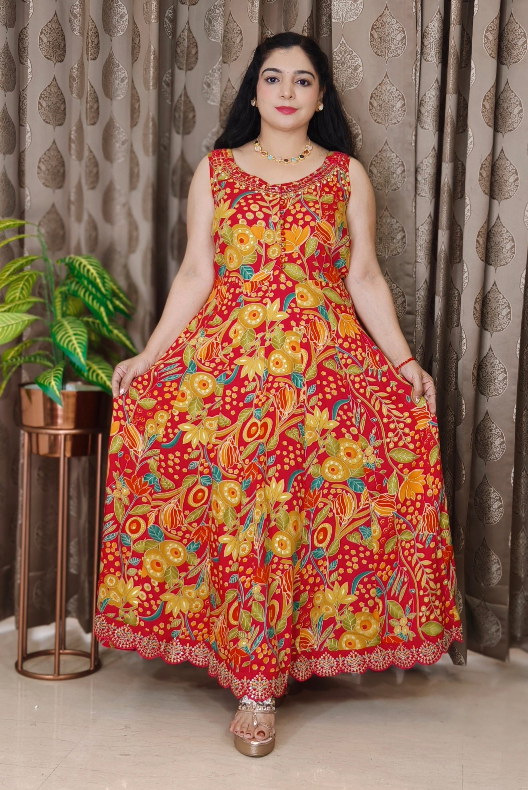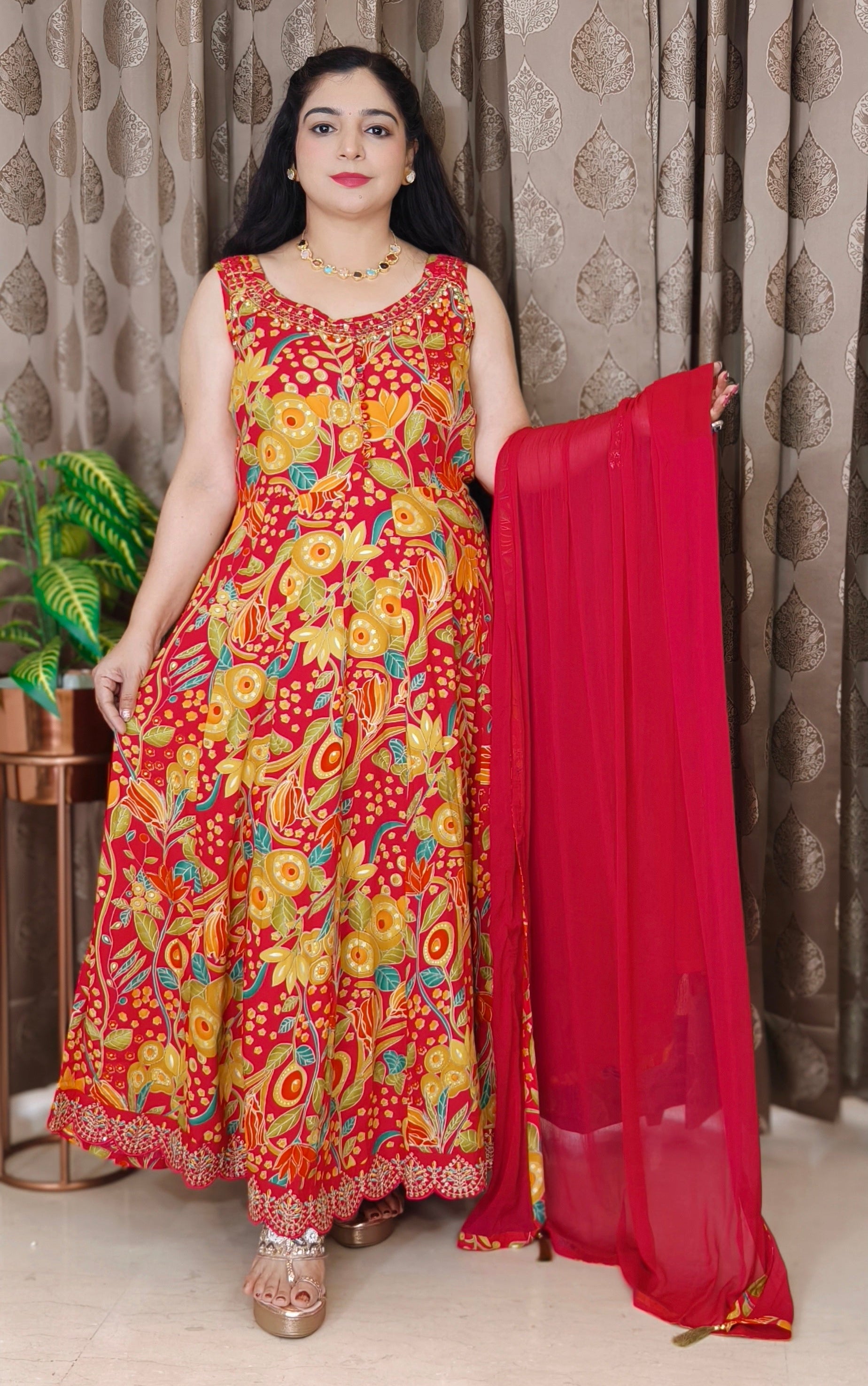 RED/YELLOW PREMIUMREYON ANARKALI WITH FULL FLAIR AND HEAVY DUPATTA