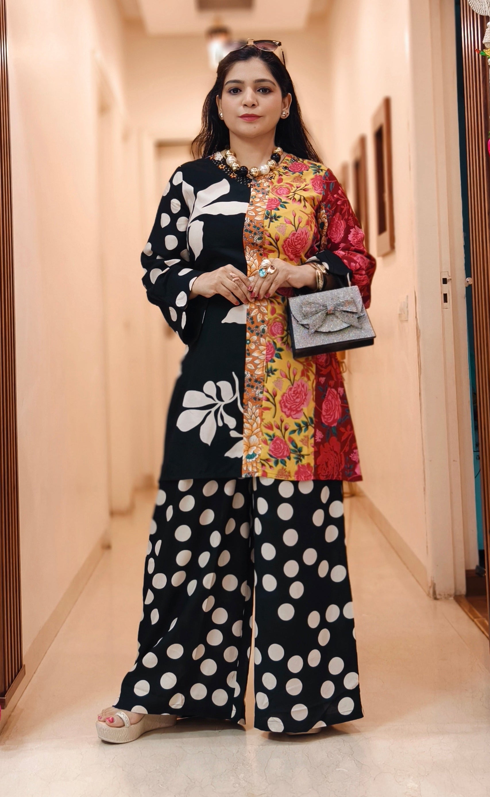 This BLACK PREMIUM REYON COTTON LONG COORDSET WITH PLAZO coordinated set offers a fresh, vibrant look with its clean, crisp design. Perfect for casual outings or a laid-back day, the set features a comfortable, breathable cotton fabric that ensures all-day ease. The contrasting yellow accents add a pop of color, making it both stylish and effortlessly chic. Ideal for warm weather, this set combines comfort with modern flair, making it a versatile addition to any wardrobe.