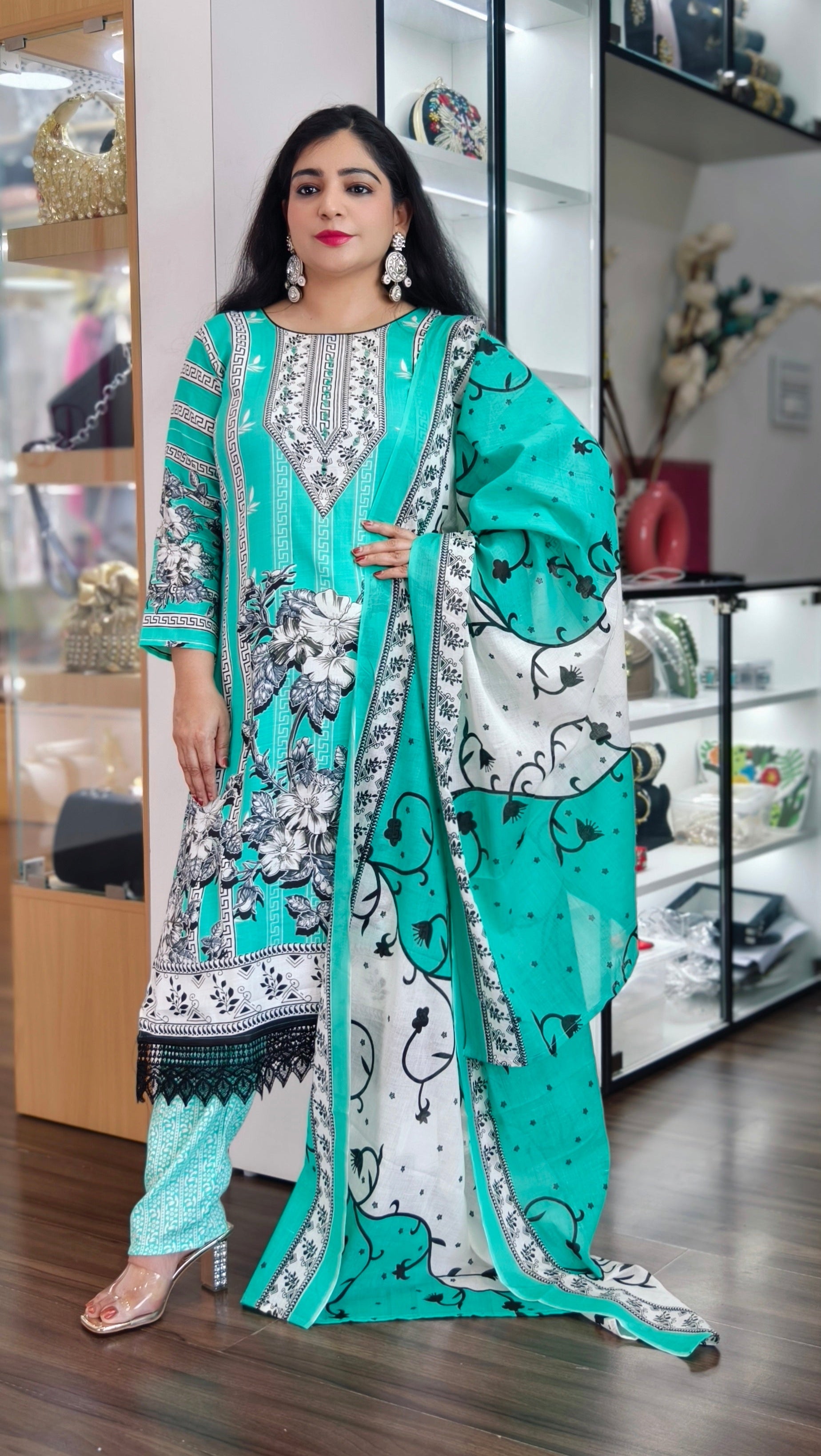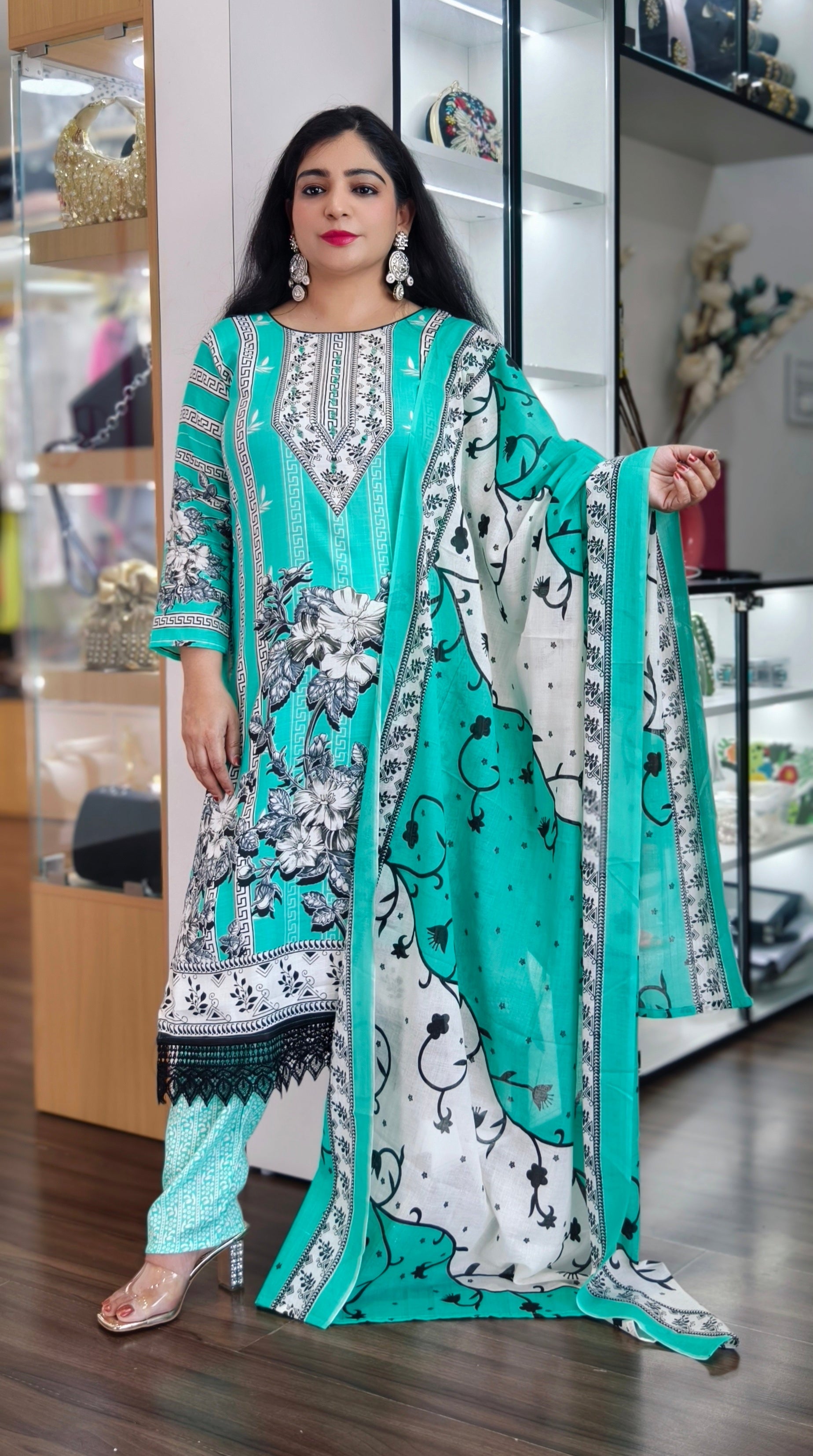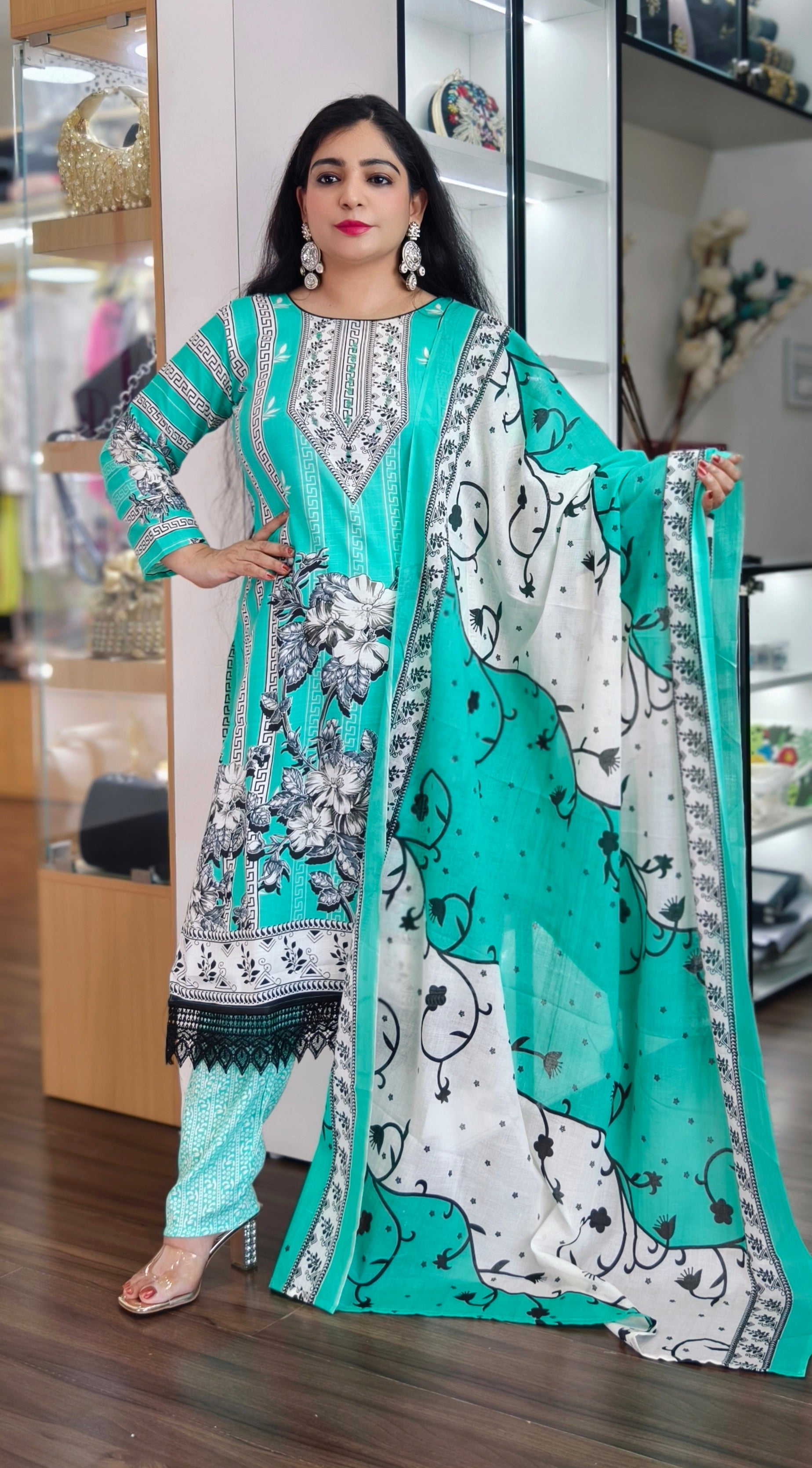 This exquisite Cotton suit is crafted from 100% pure Georgette fabric, known for its light, airy texture and graceful drape. The vibrant colors and intricate embroidery make it a perfect choice for festive occasions, weddings, or special gatherings. Featuring a combination of traditional and contemporary design elements, this suit offers a sophisticated and elegant look. The breathable fabric ensures comfort throughout the day, while the fine craftsmanship showcases the beauty of Pakistani textile artistry. Step into a world of luxury and tradition with this authentic Georgette Pakistani suit.