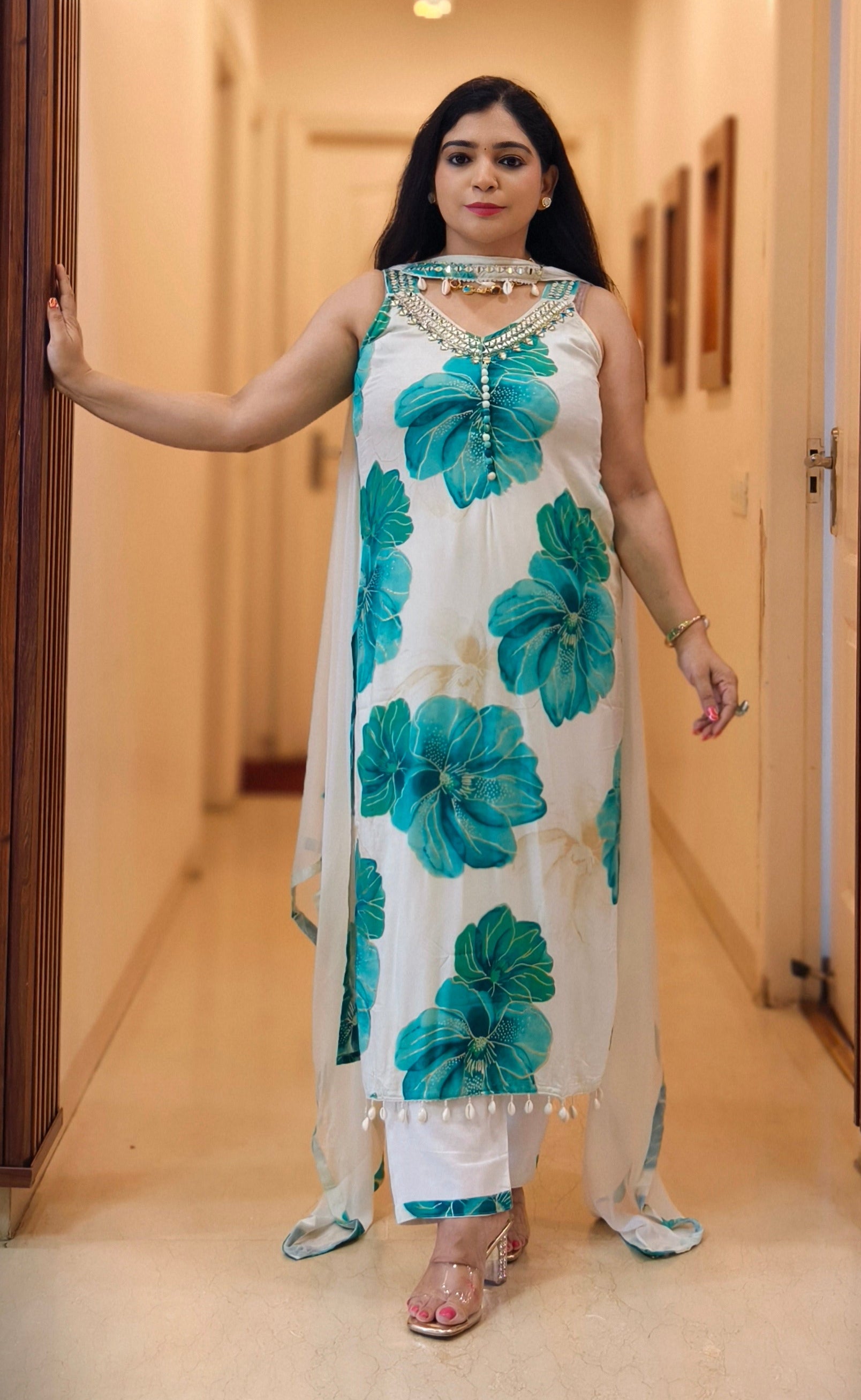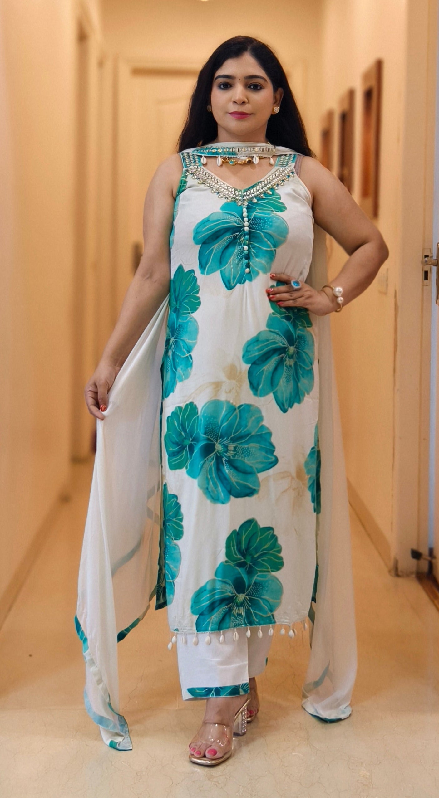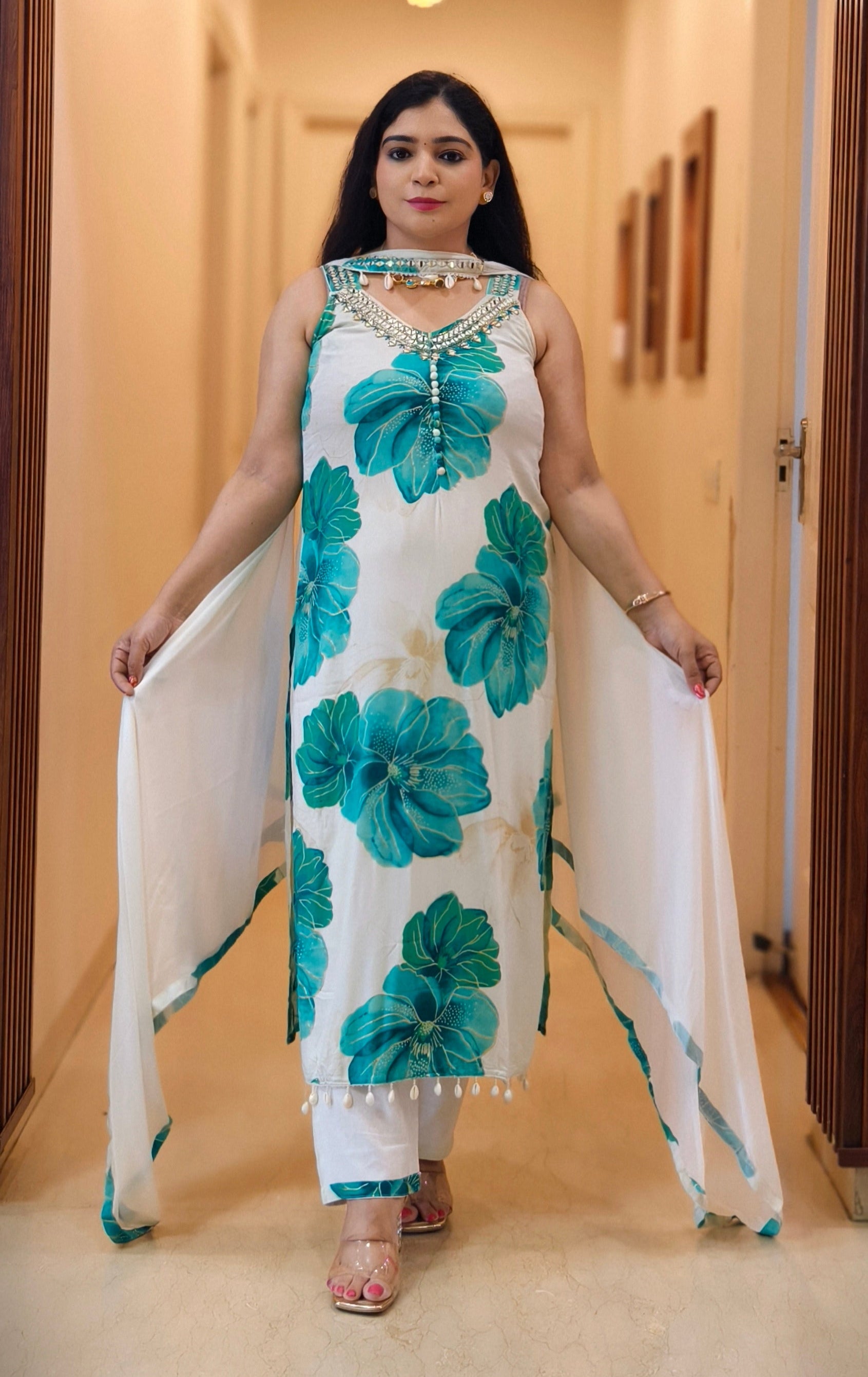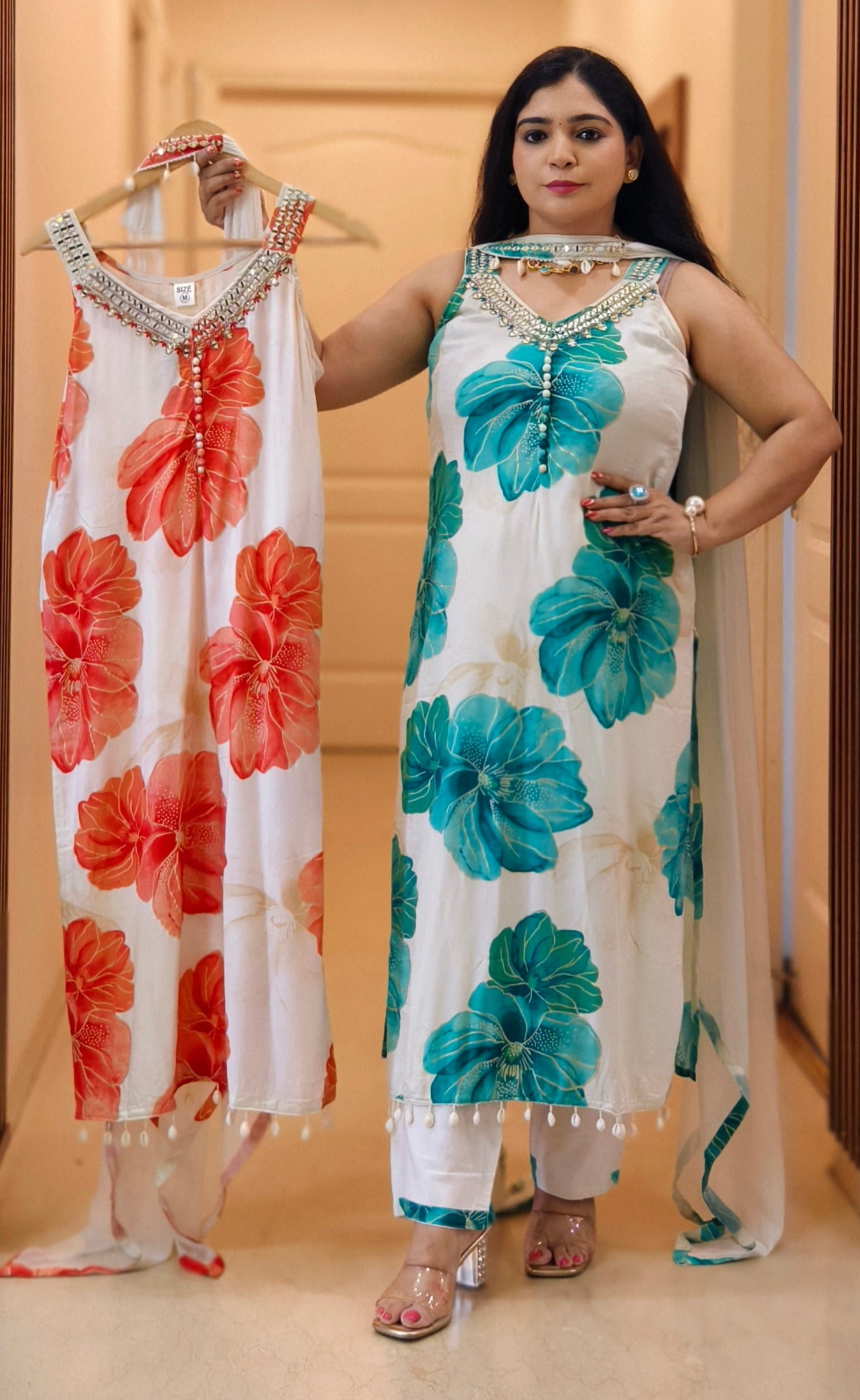 GREEN AND RED PREMIUM REYON SLEEVELESS SUIT WITH HANDWORK & FLORAL PRINT