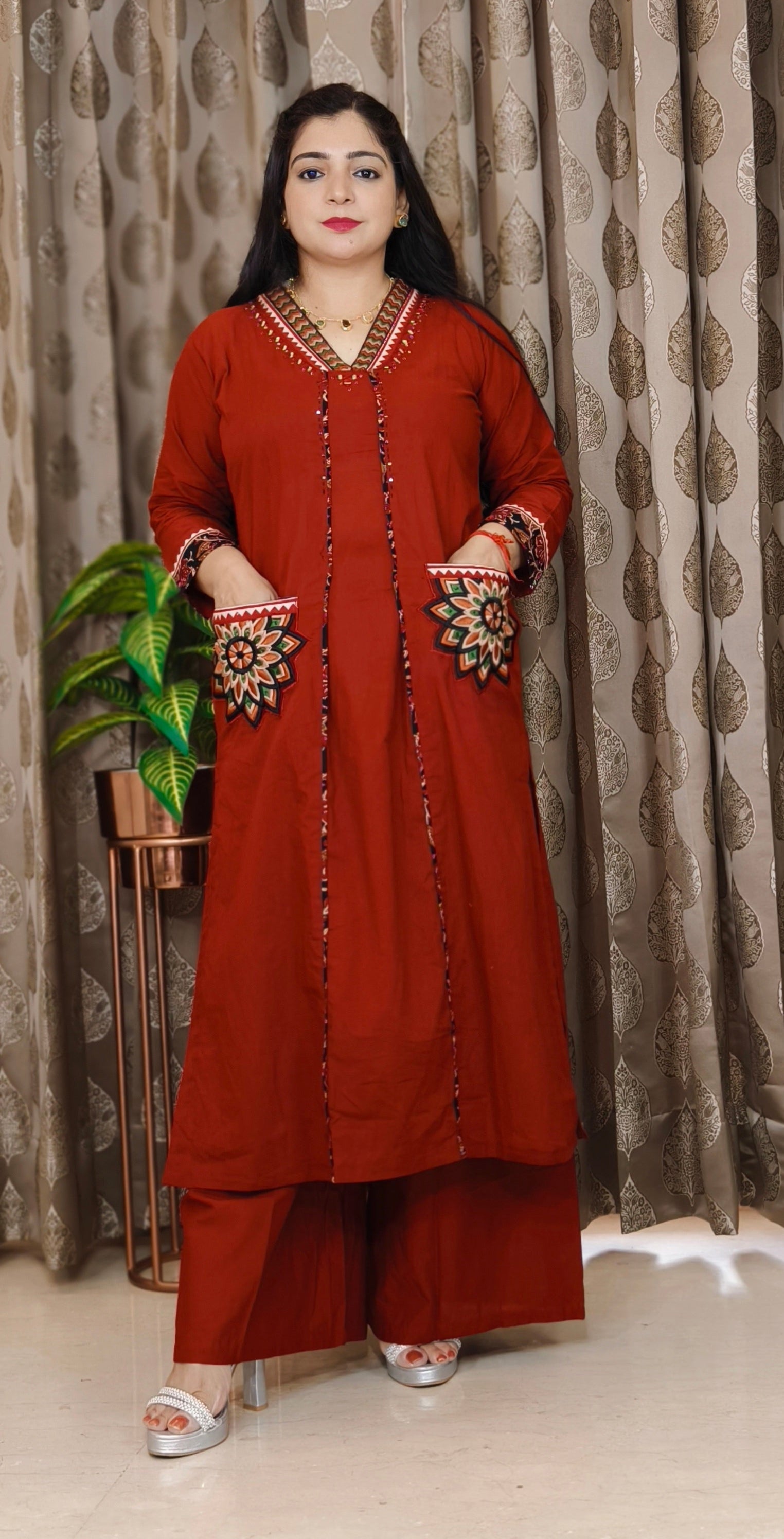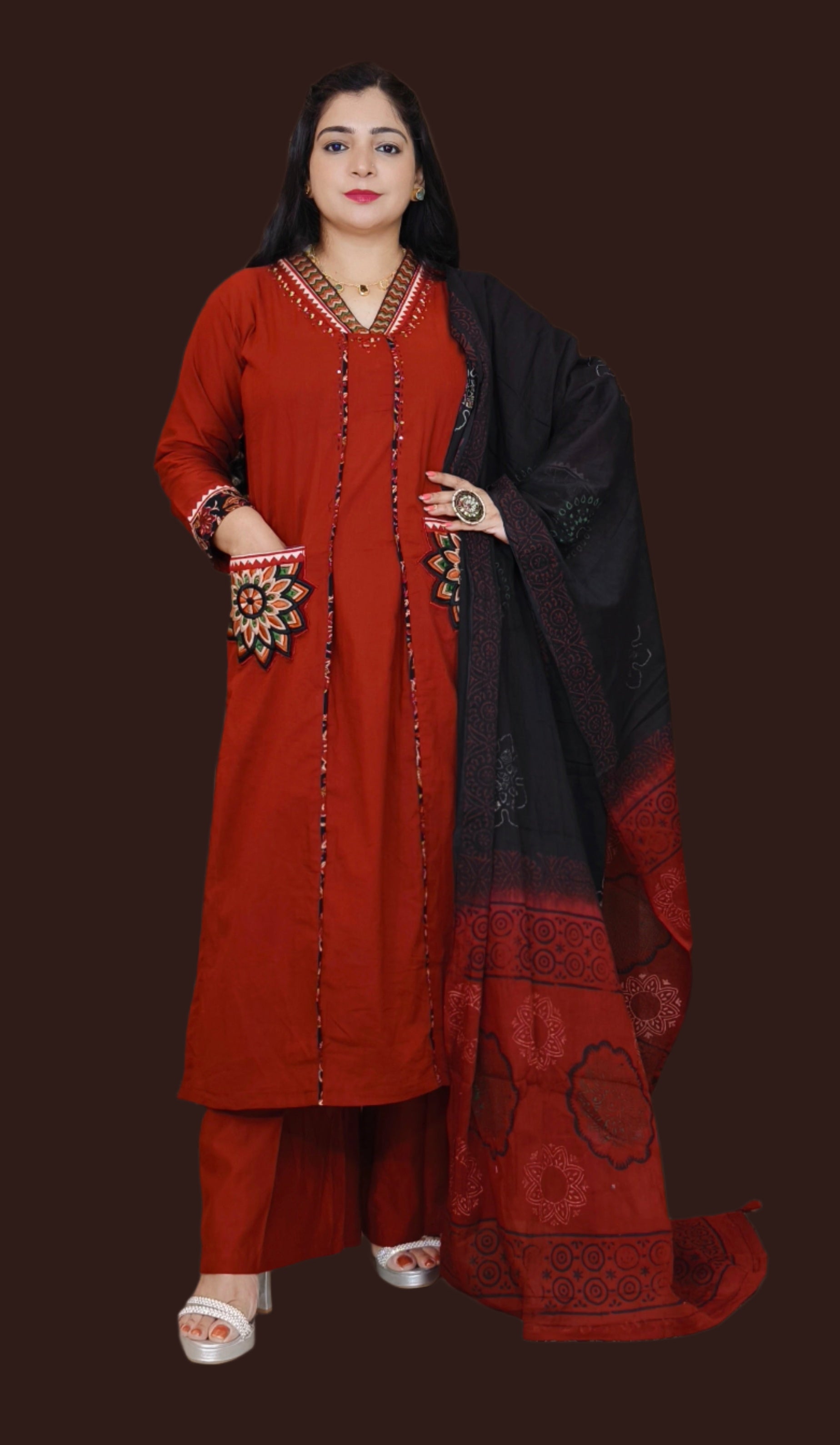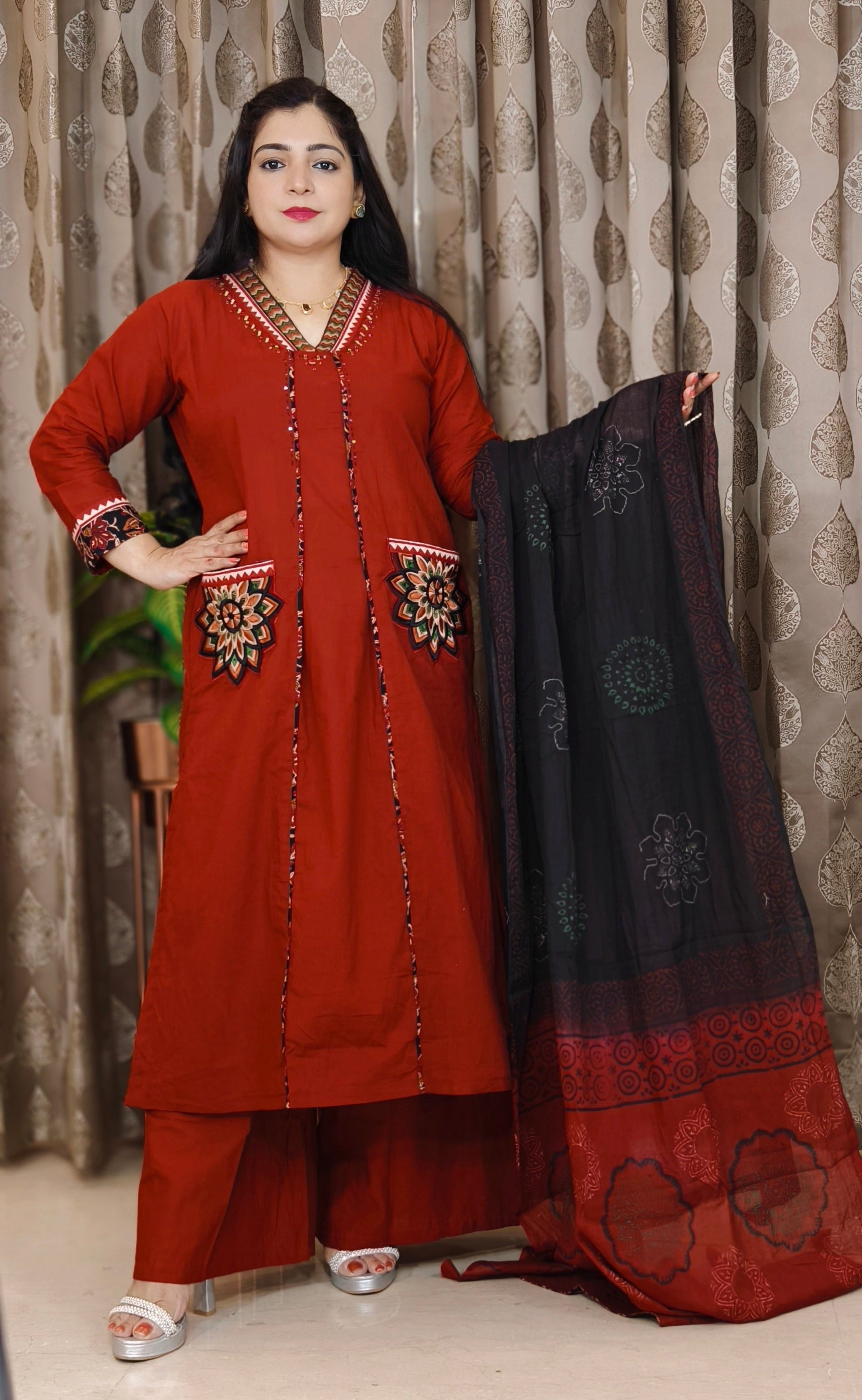 A must have MAROON AJRAKH PRINT COTTON SUIT WITH DISIGNER PANT in your wardrobe. It comes with Printed dupatta.