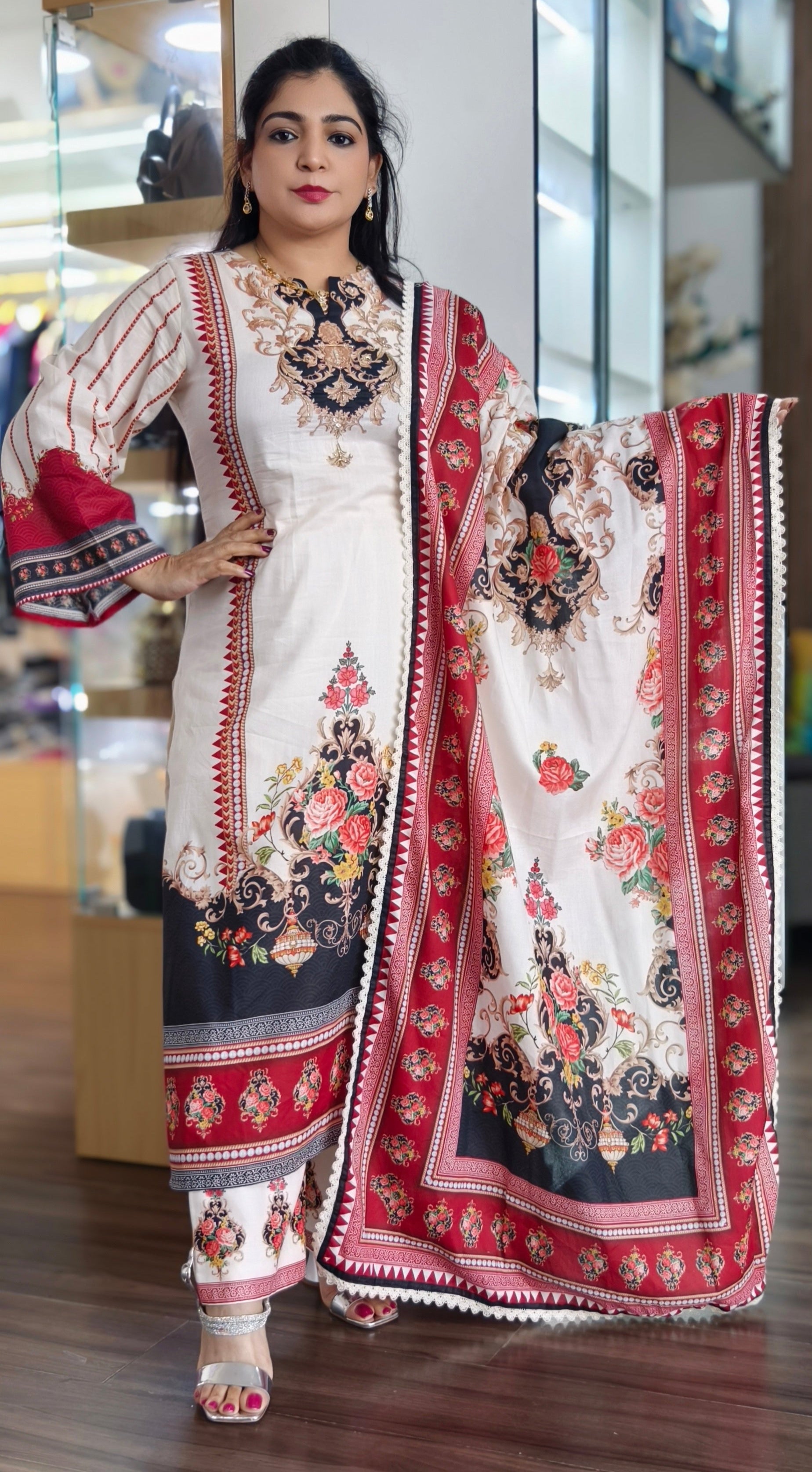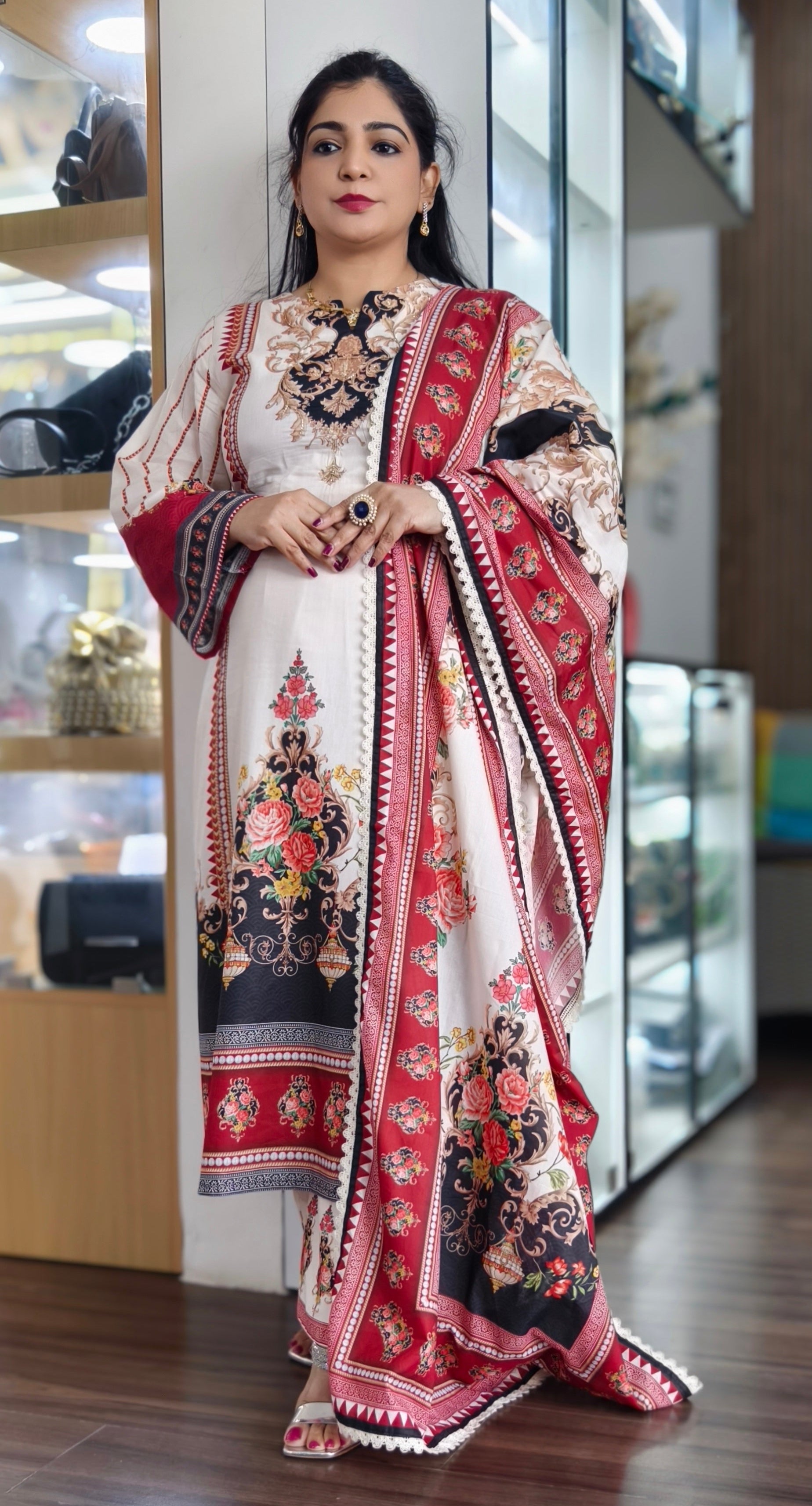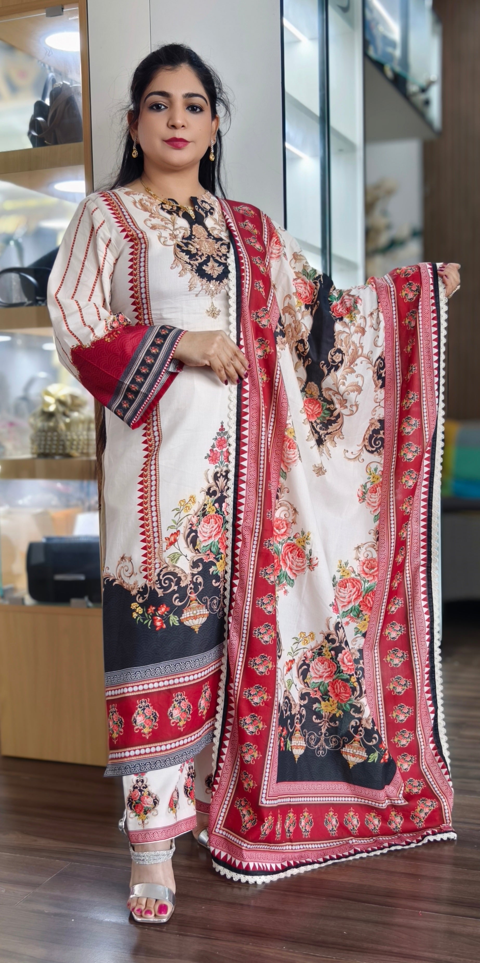 Brighten up your wardrobe with this vibrant Multicolor Lawn Cotton fabric, adorned with a stunning digital print. The soft, breathable cotton fabric ensures comfort, while the rich, eye-catching colors and intricate digital design bring a modern twist to traditional patterns. Perfect for casual outings or a day of relaxation, this versatile piece offers both style and comfort in one beautiful package.