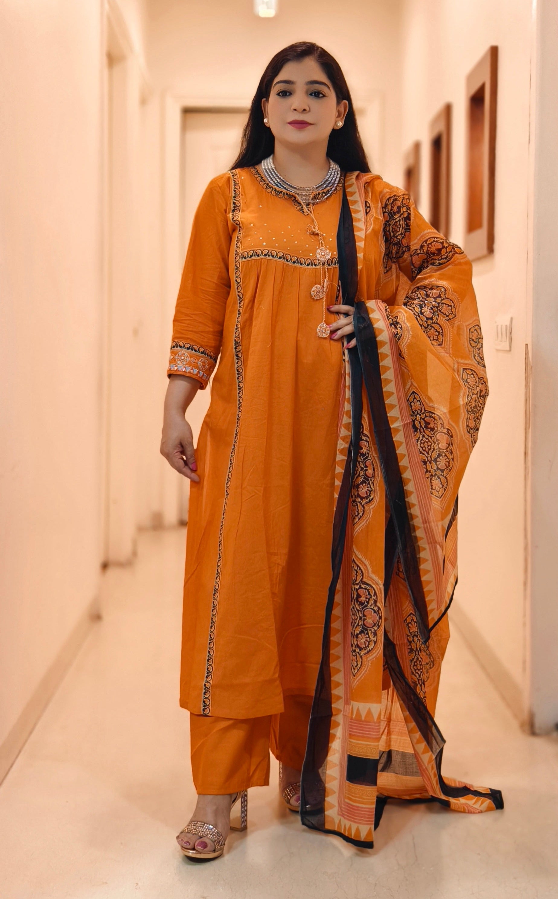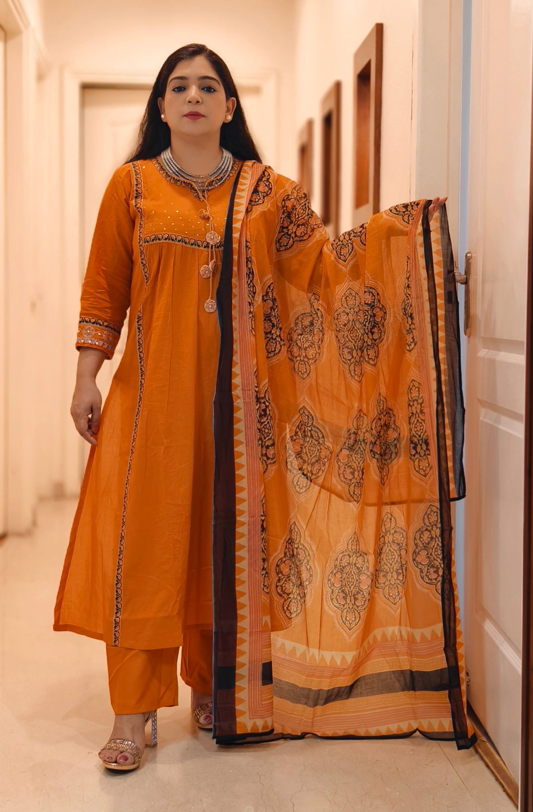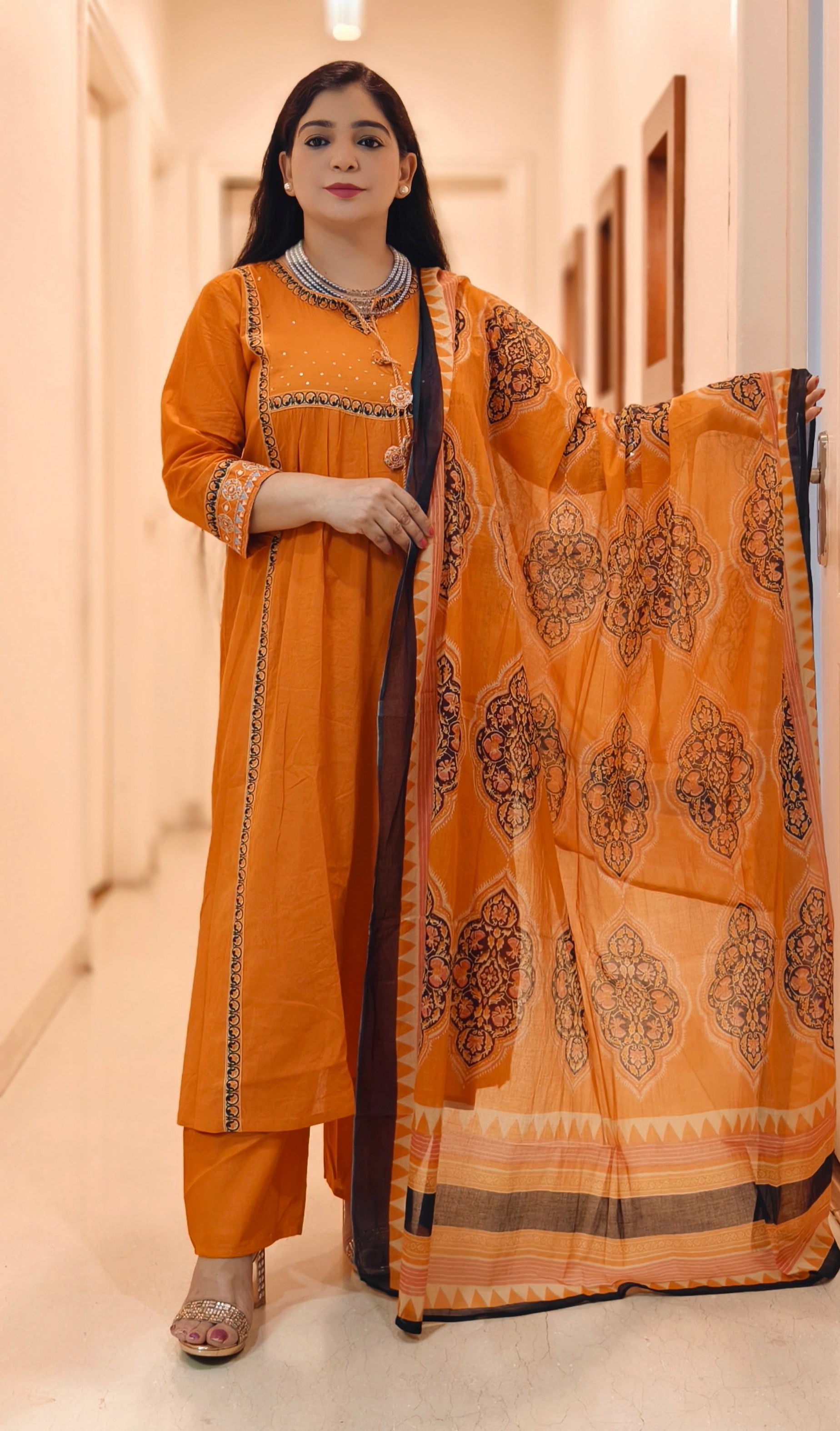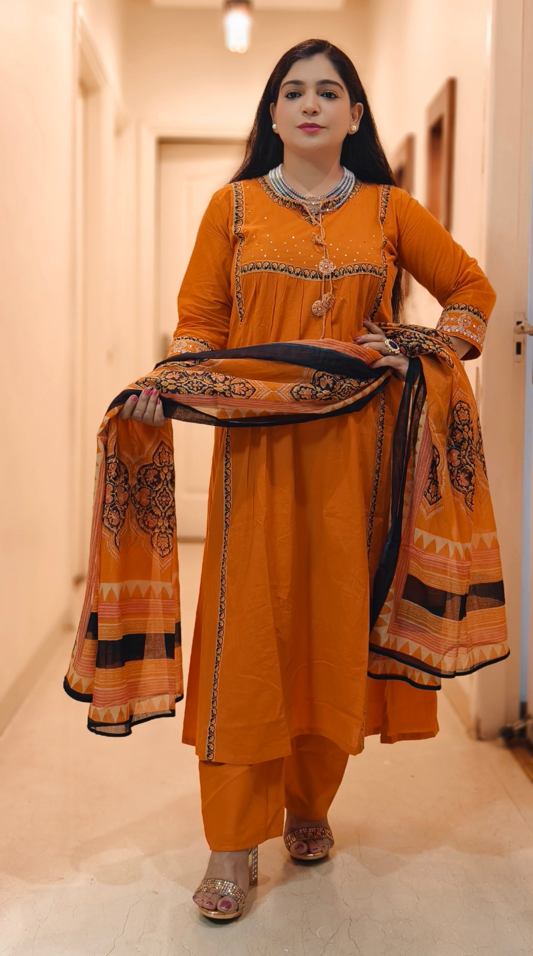 ORANGE PRINTED COTTON SUIT WITH DISIGNER PANT