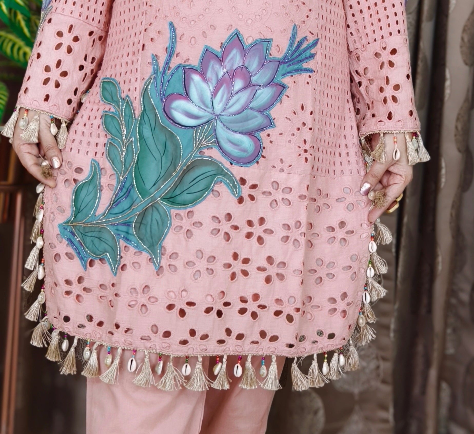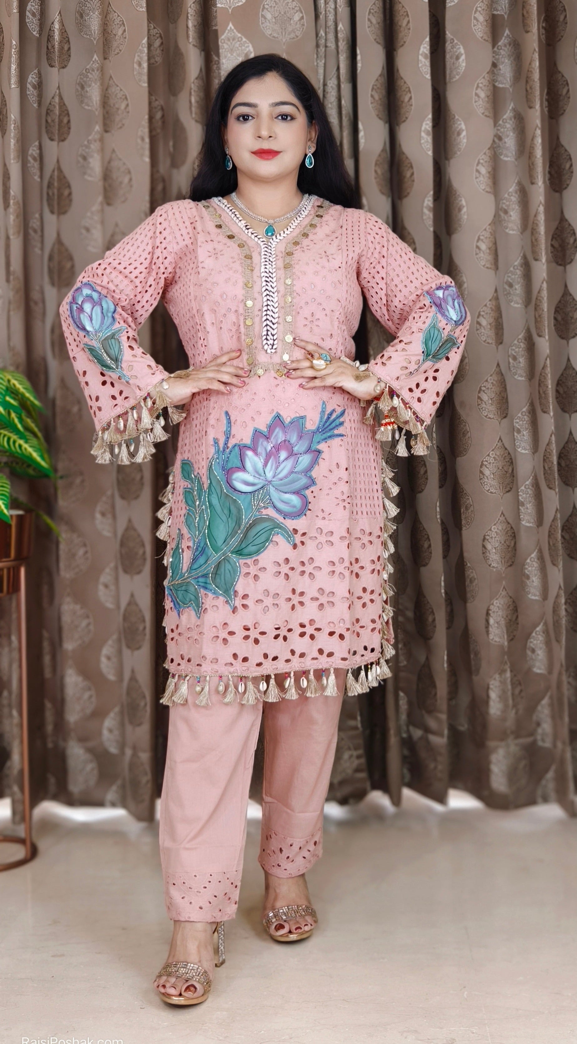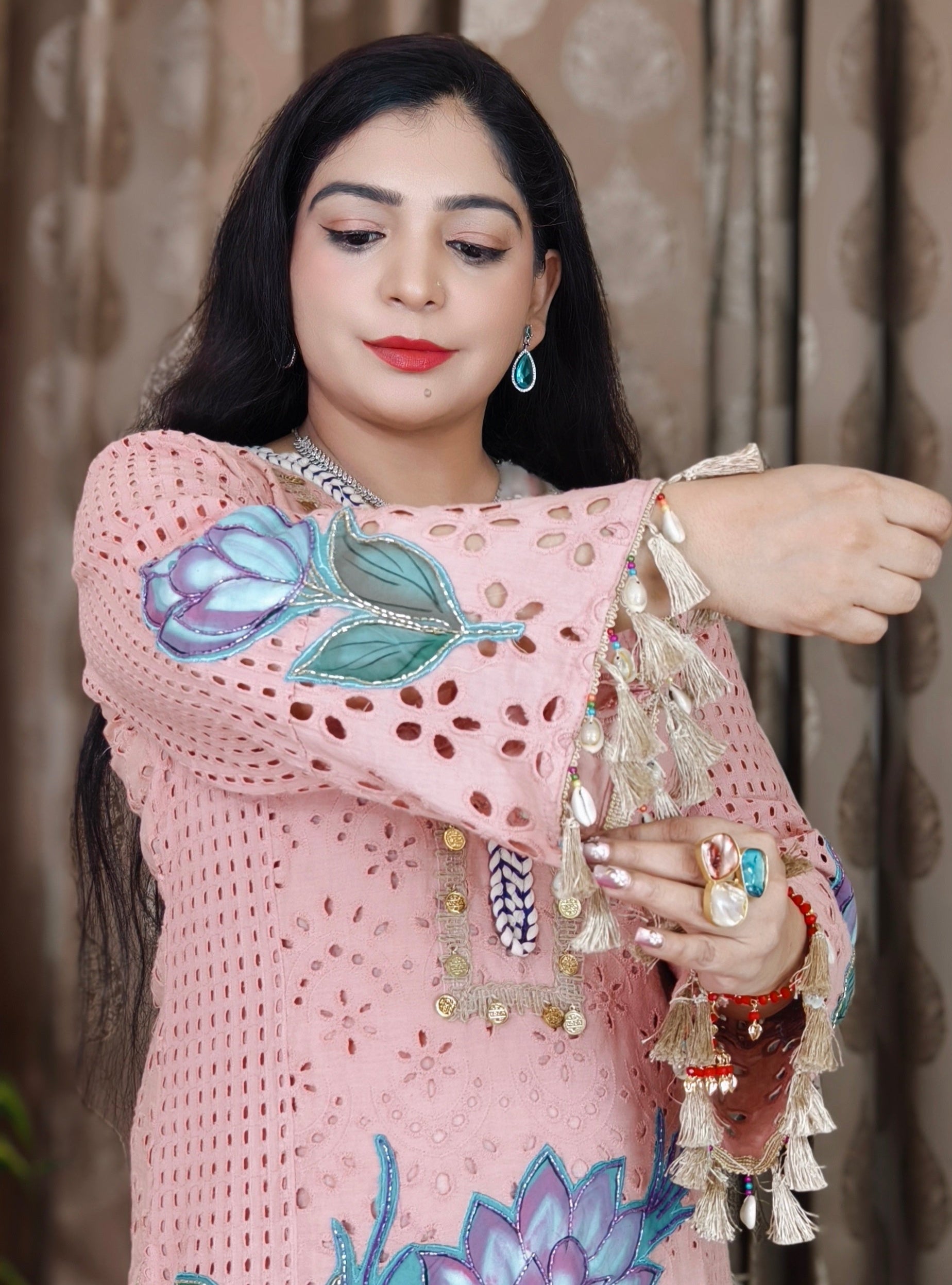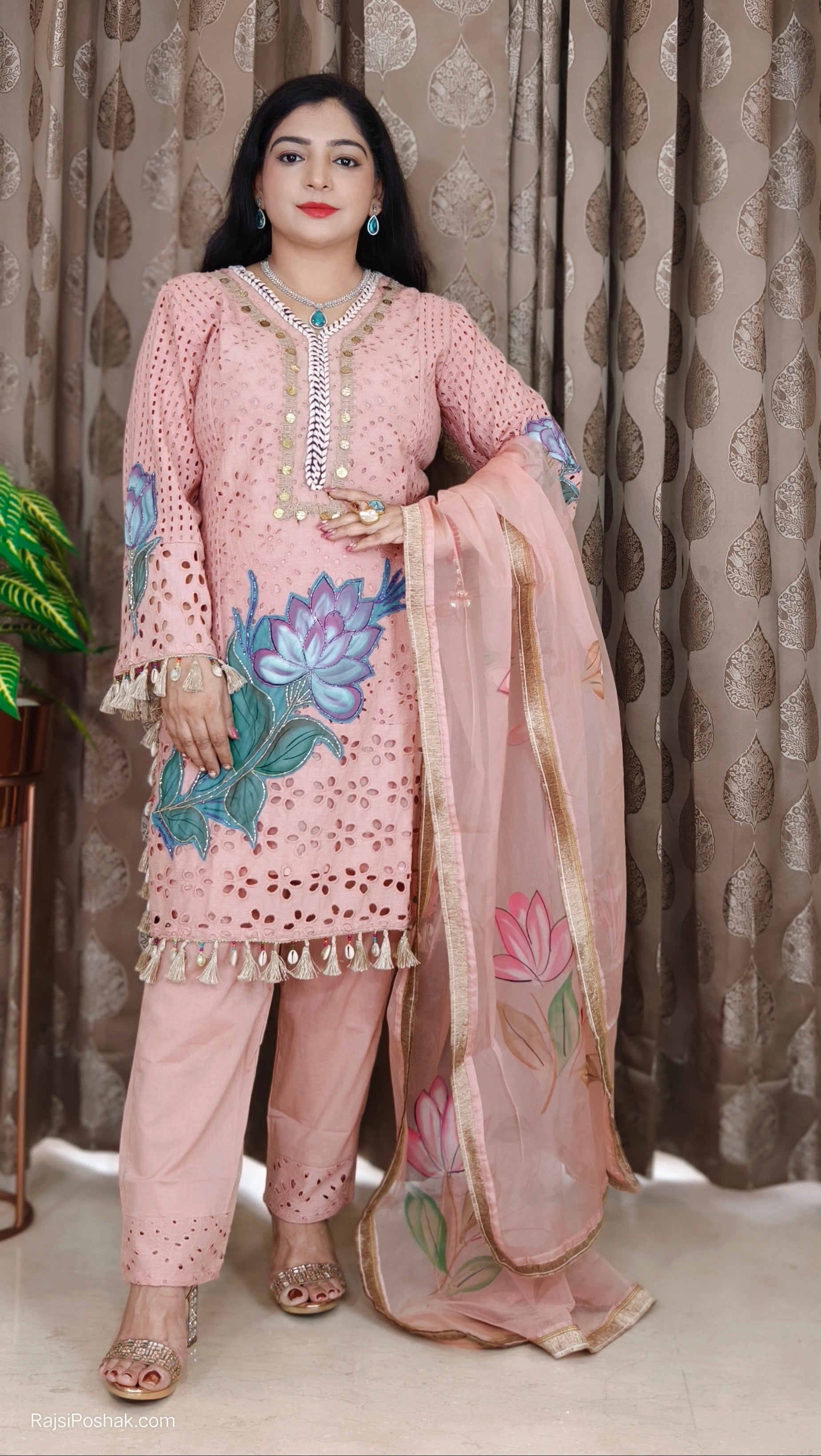 PEACH PREMIUM SHIFALI COTTON EMBRORAIRED SUIT WITH COTTON PANT & FULL BRUST PRINT DUPATTA
