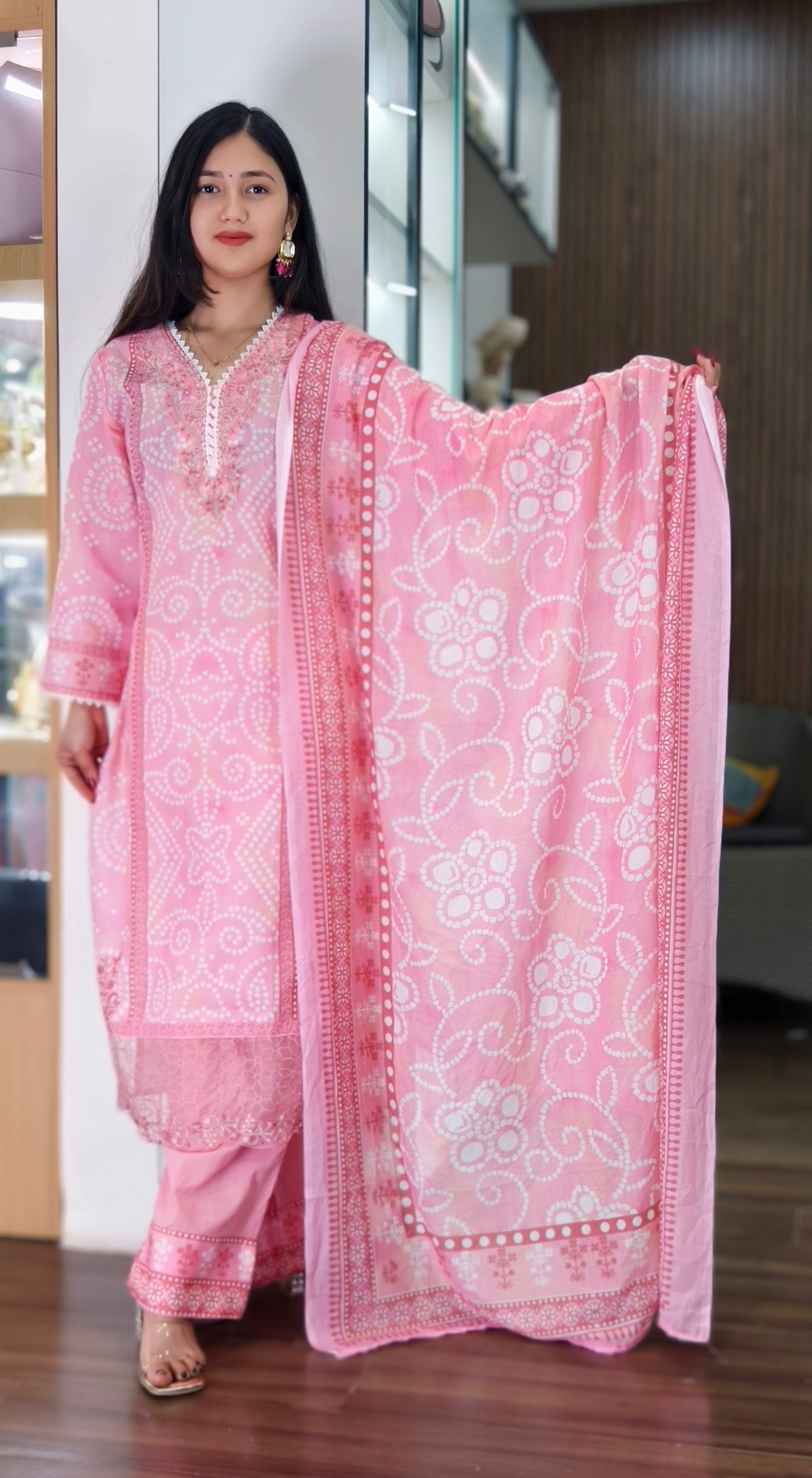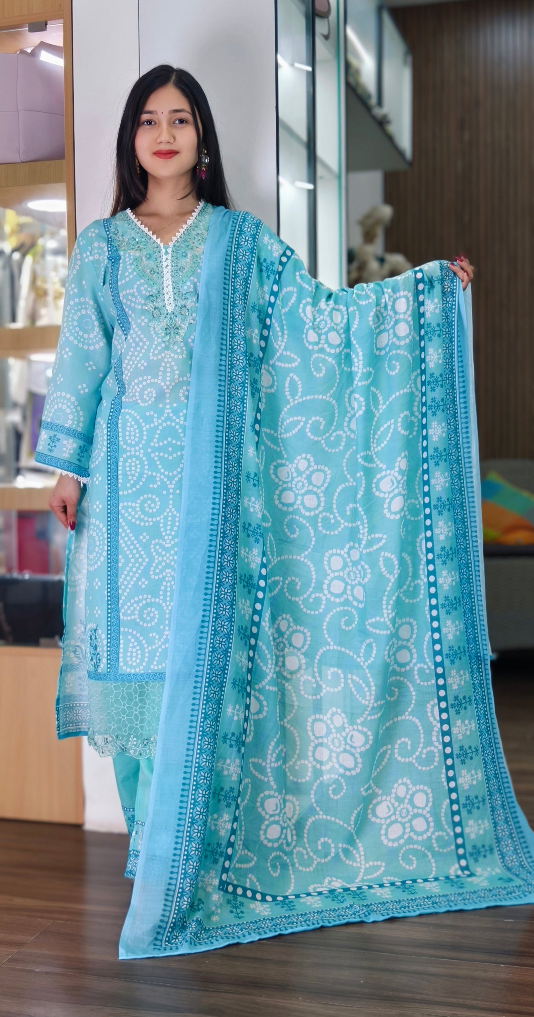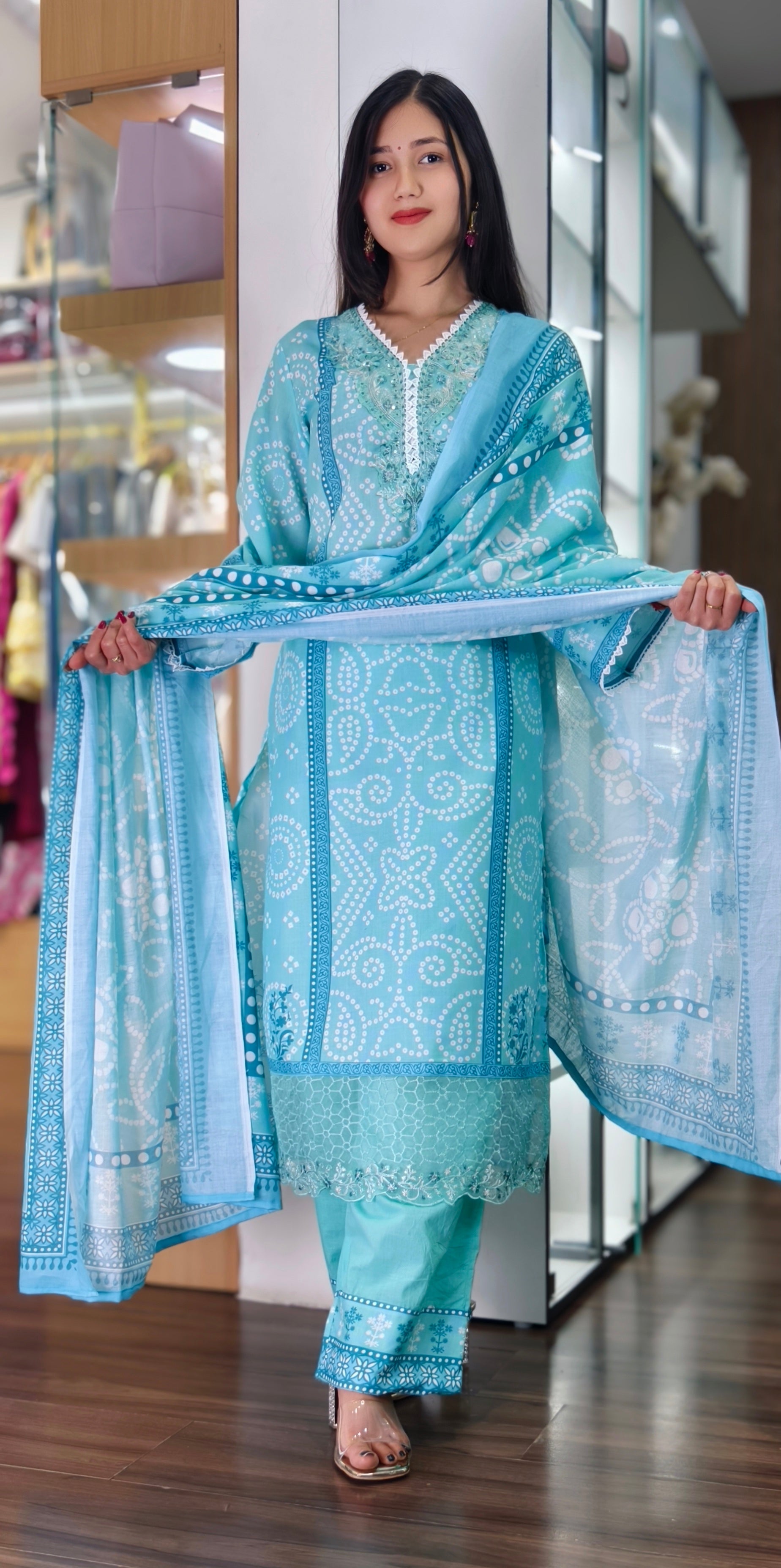 A must have PINK AND FIROZI PRINTED COTTON SUIT WITH DISIGNER PALLAZO in your wardrobe. It comes with Printed dupatta.