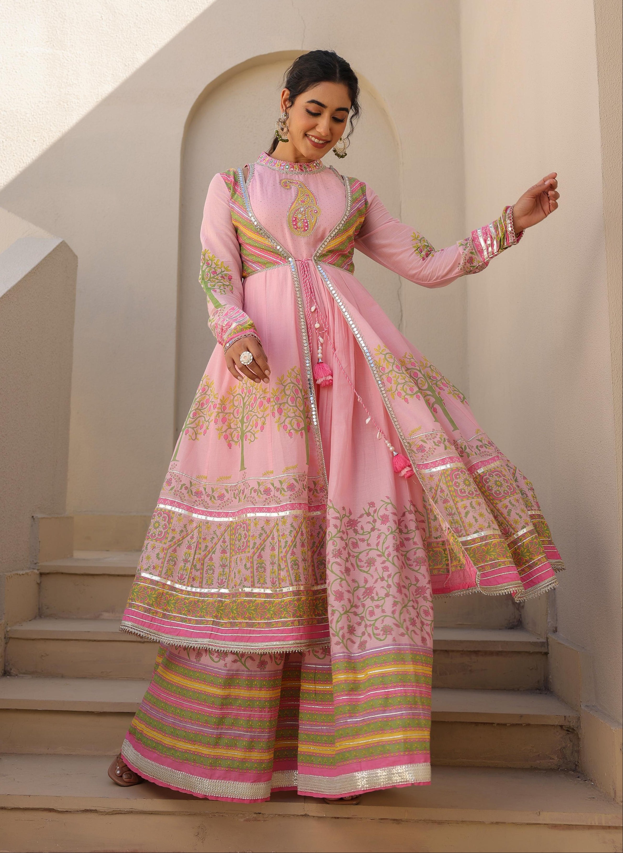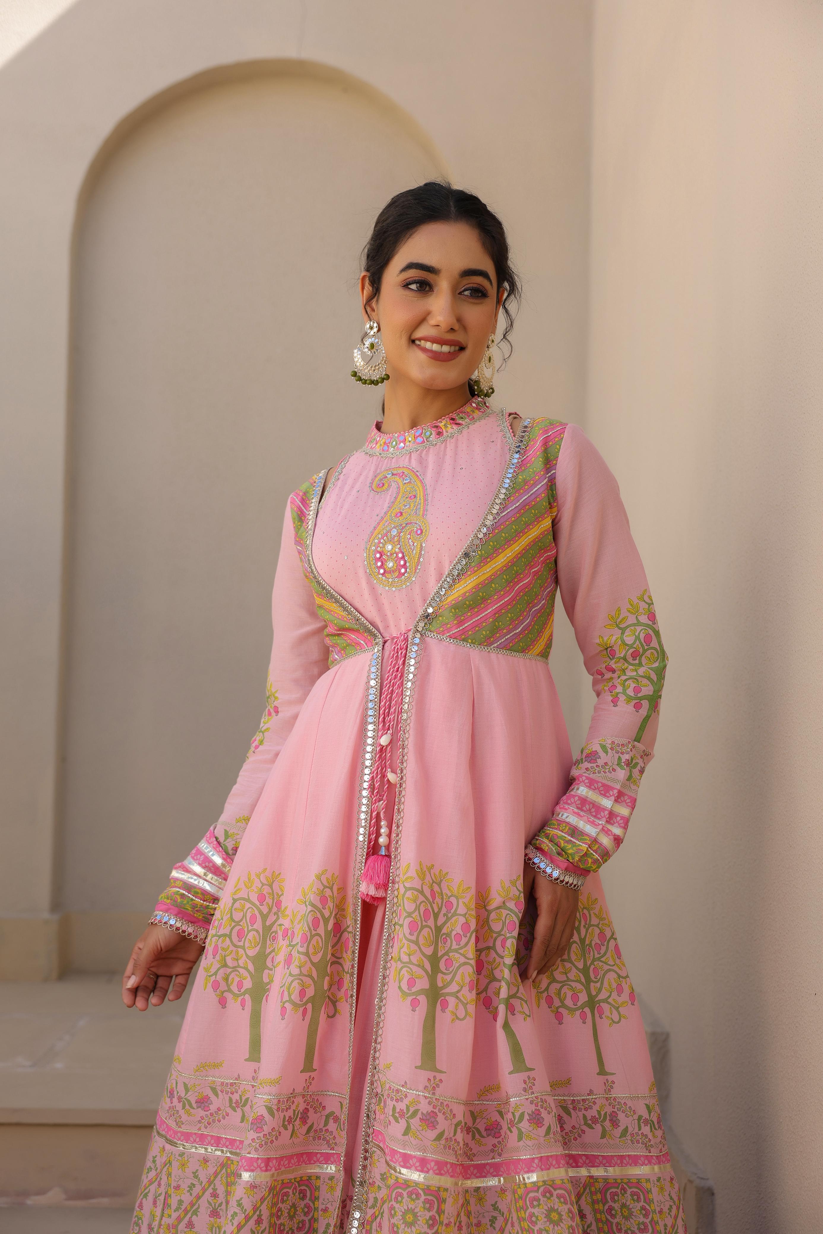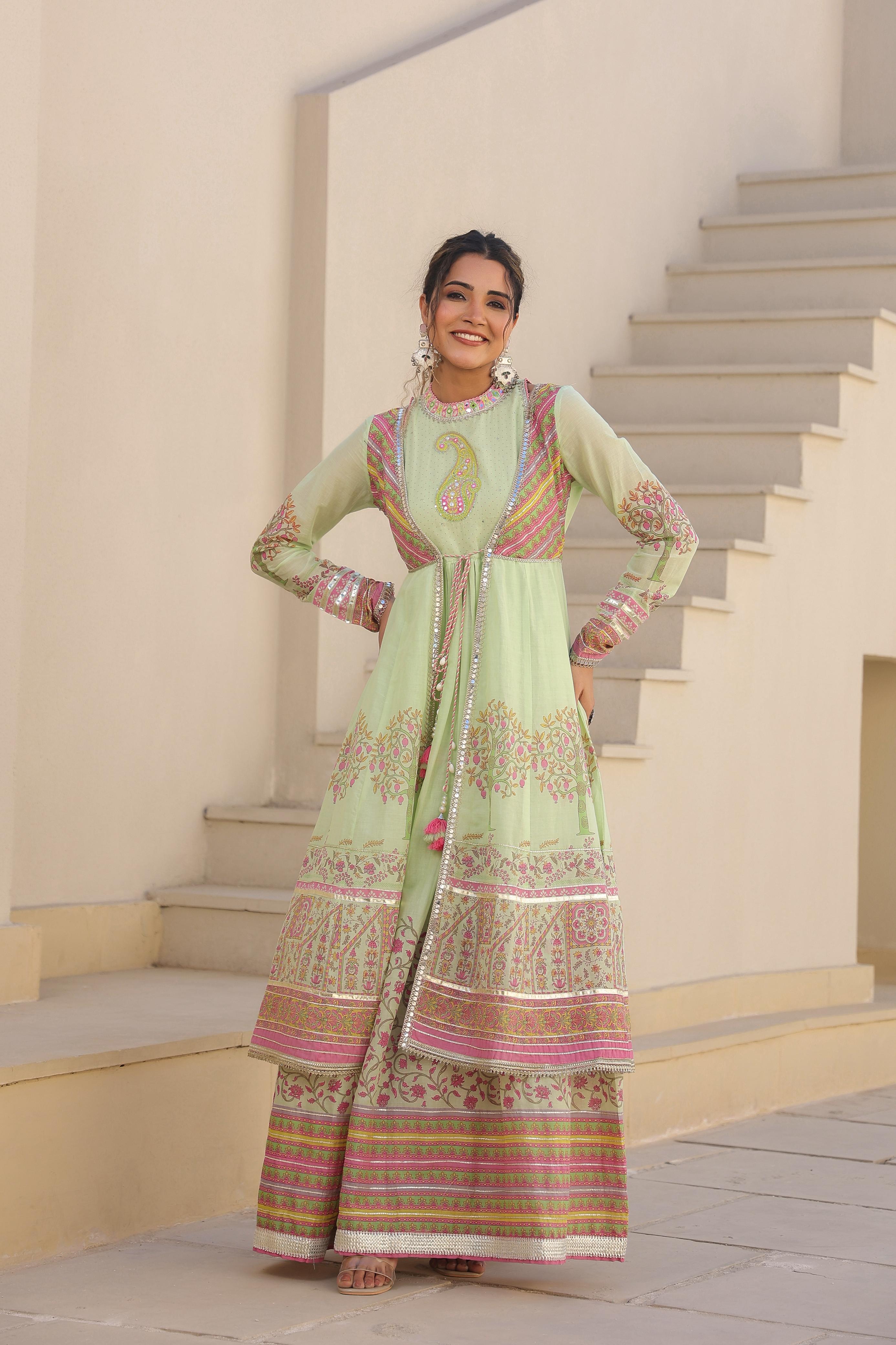 PINK AND PISTA GREEN COTTON ANARKALI DRESS WITH SKIRT.Double layer printed cotton ankle length dress, graced up with mughal print and gota detailing. 2. Anarkali patterned jacket to go with it.