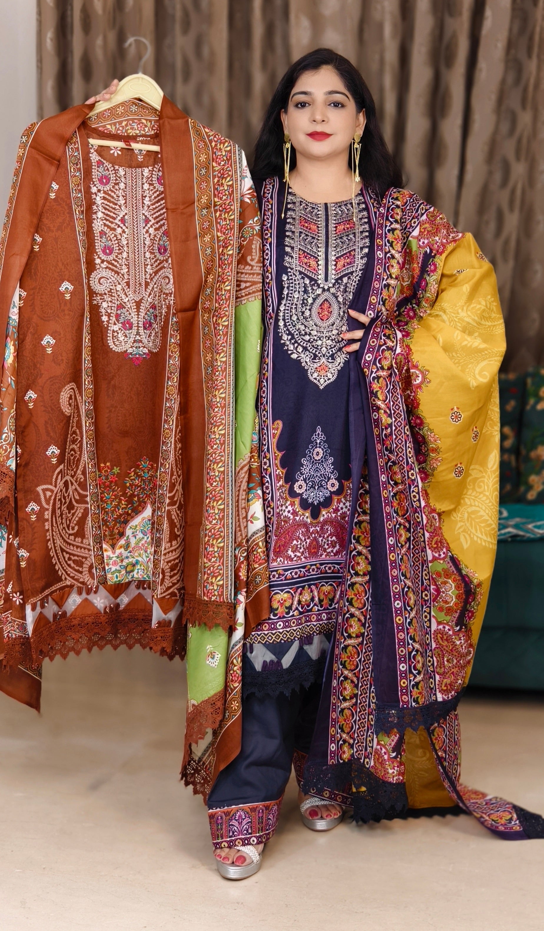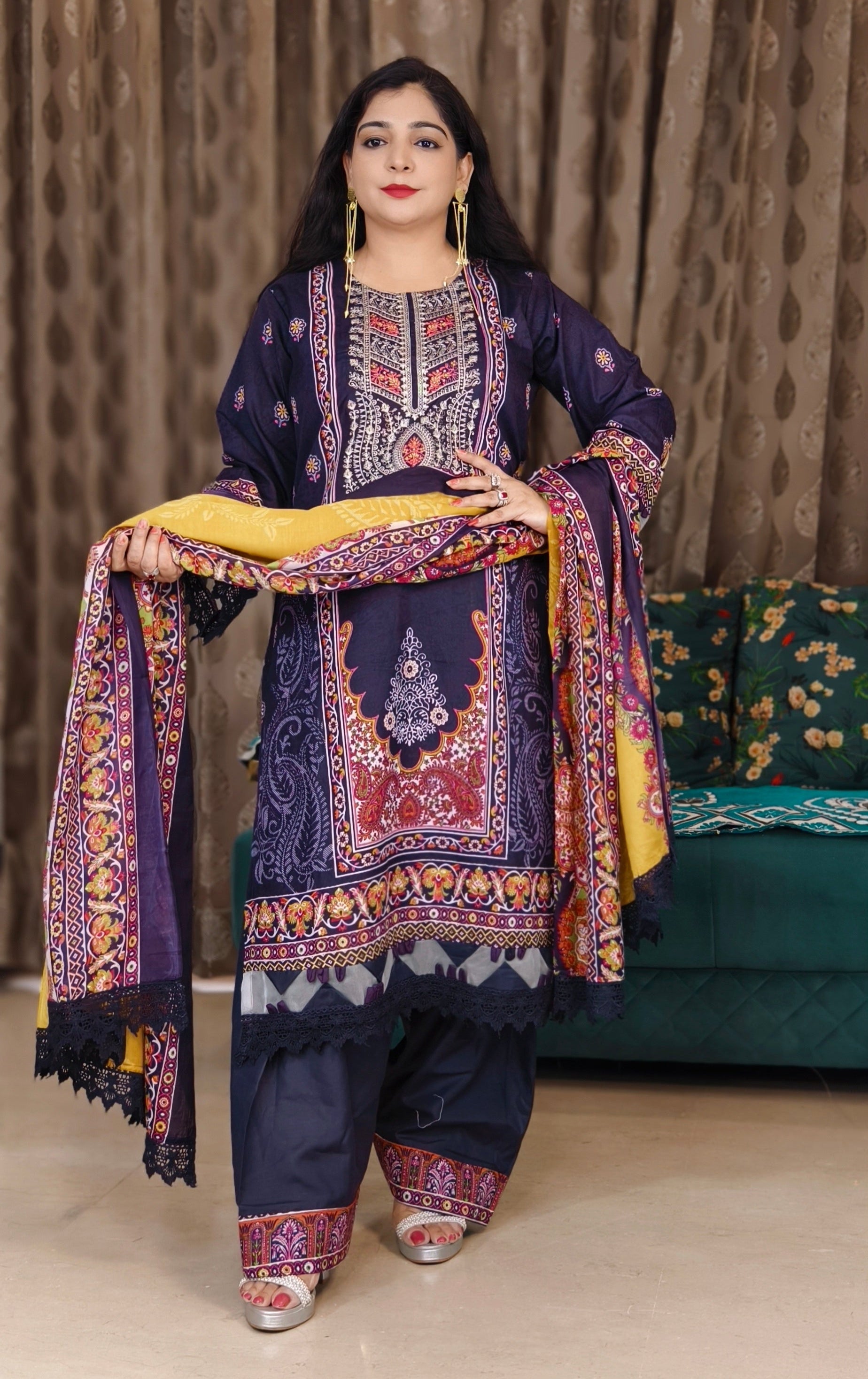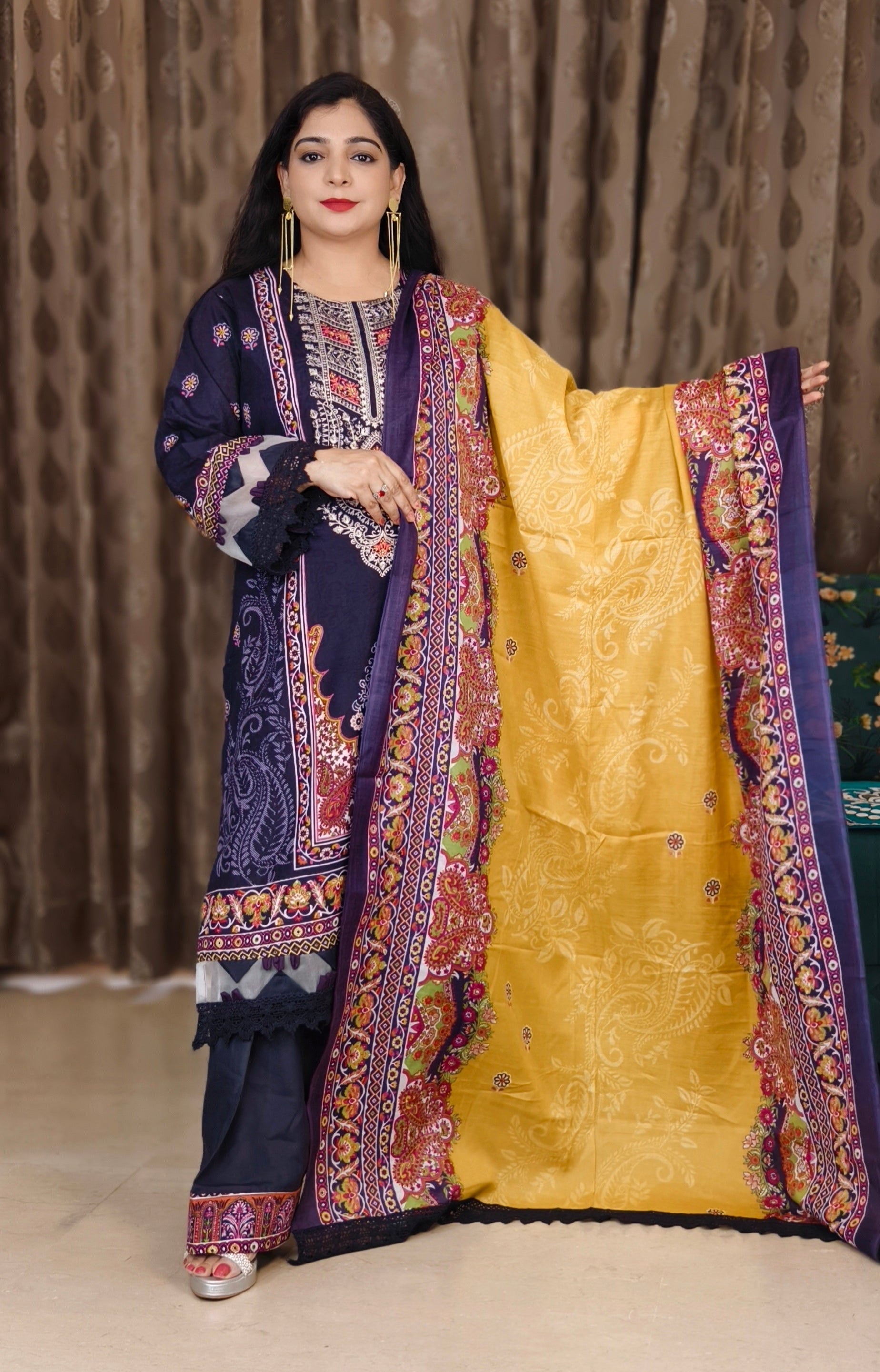A must have PURPLE AND RUST PRINTED LAWN COTTON SUIT WITH CONTRAST DUPATTA AND FARSI PANT in your wardrobe. It comes with Printed dupatta.