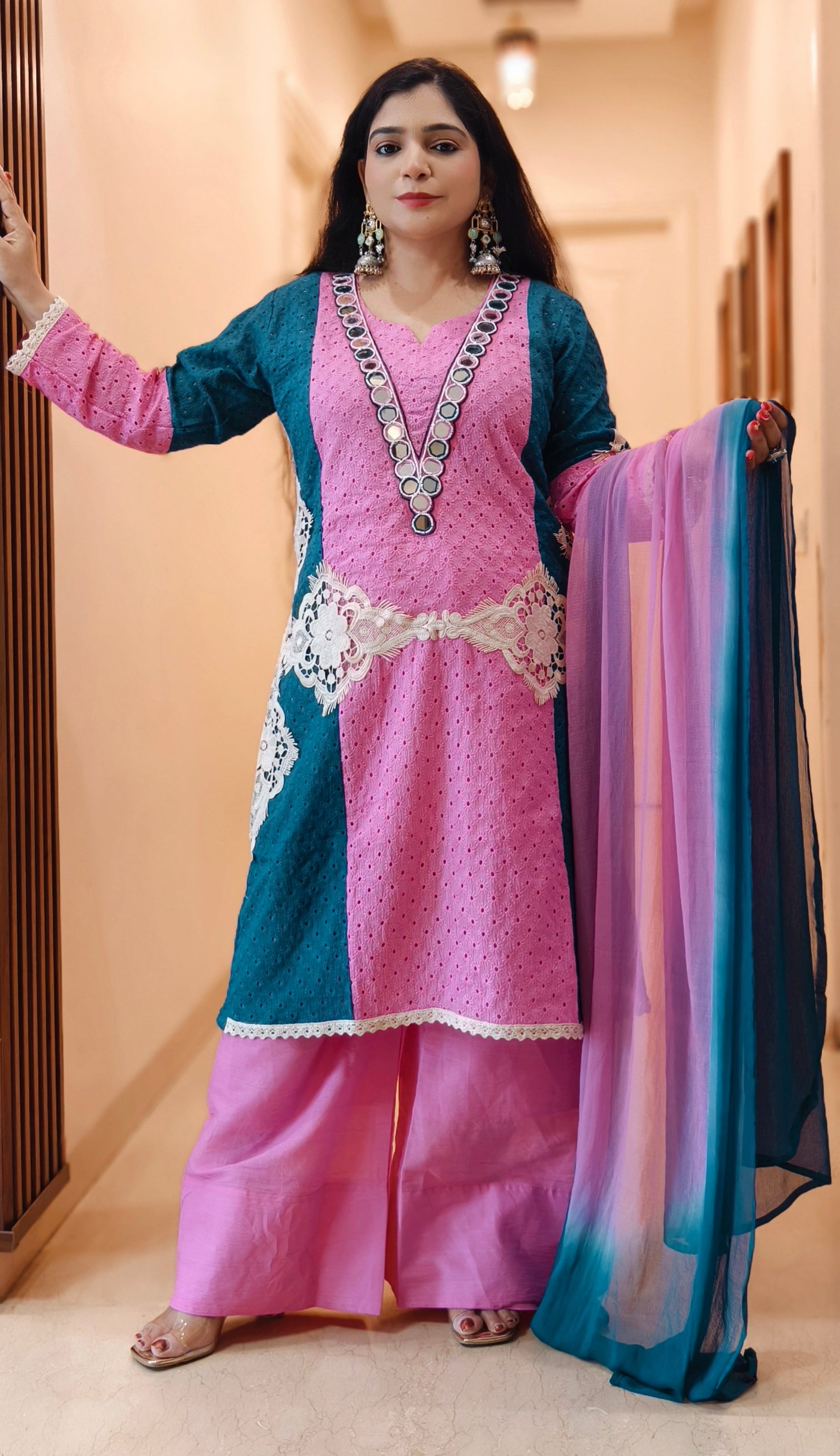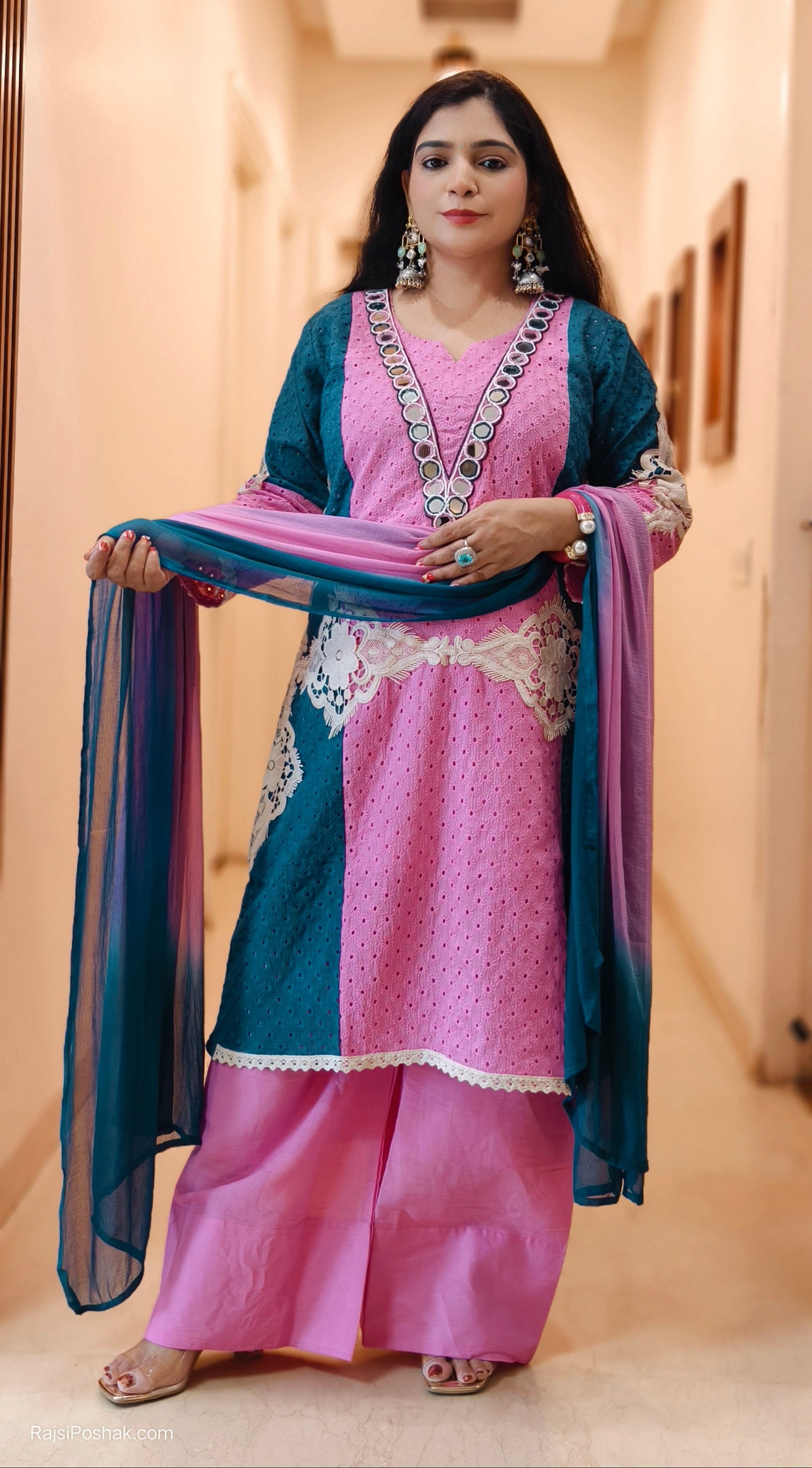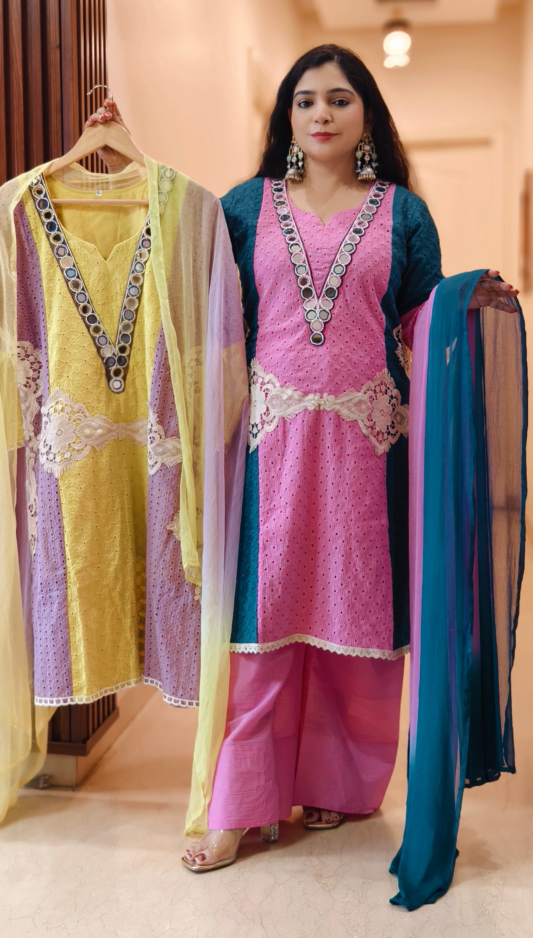 PURPLE/BLUE AND PURPLE/YELLOW PREMIUM SHIFALI COTTON EMBRORAIRED SUIT WITH COTTON PANT