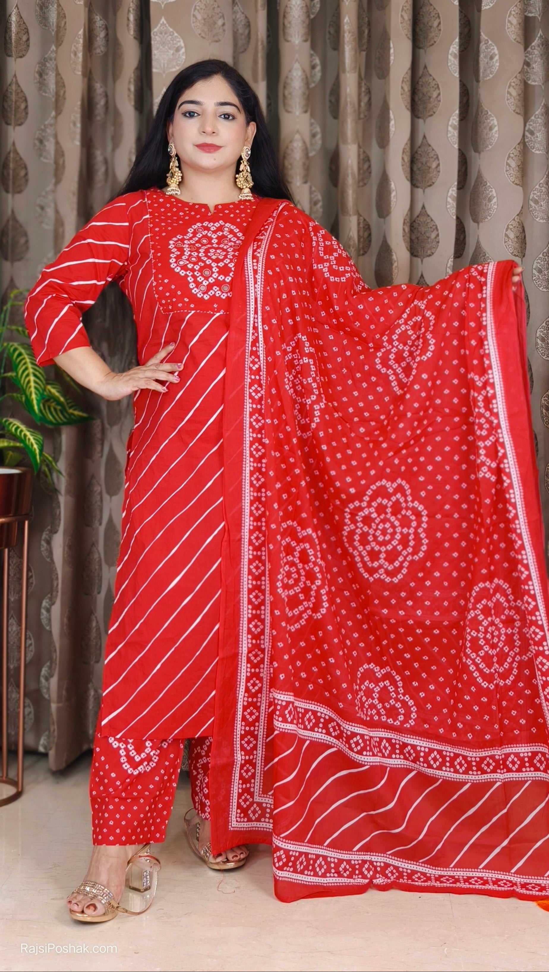 A must have RED LEHRIYA PRINT COTTON SUIT WITH DISIGNER PANT in your wardrobe. It comes with Printed dupatta.