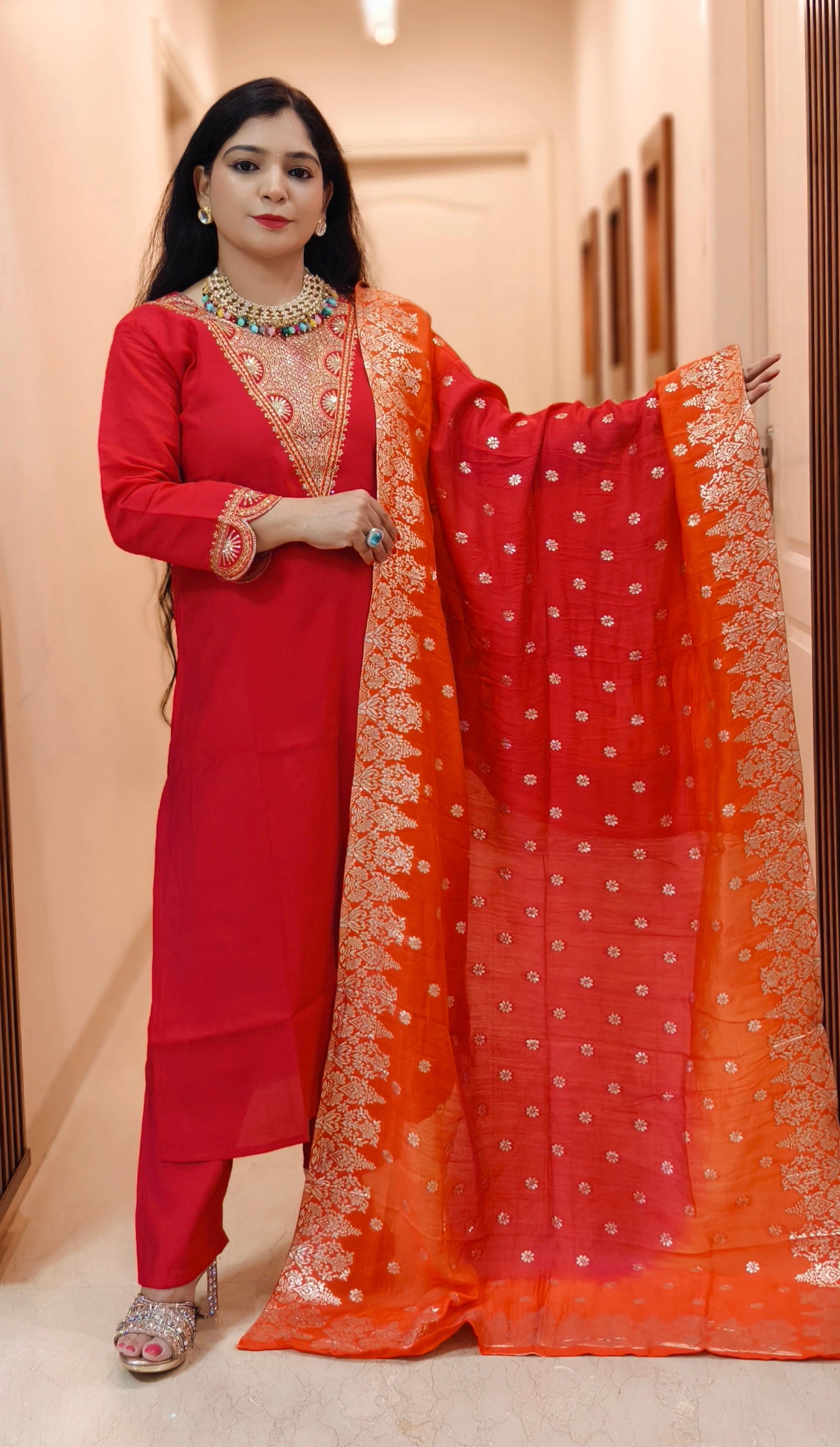 A must have RED RUSSIAN SILK SUIT WITH PANT AND BANARSI DUPATTA in your wardrobe. Perfect for any occasion in this Summer Season