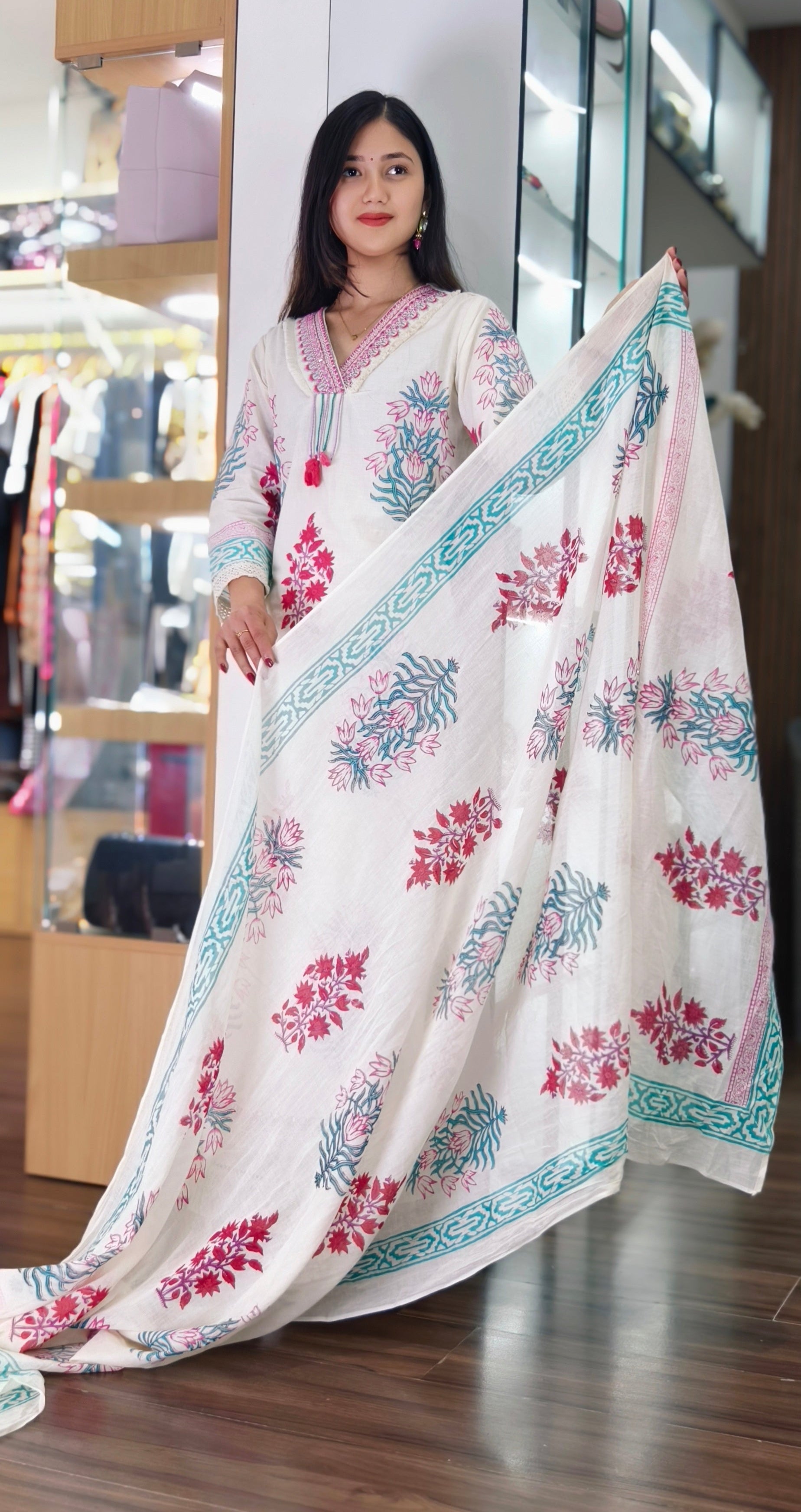 A must have WHITE IKAT PRINT COTTON SUIT WITH DISIGNER PANT in your wardrobe. It comes with Printed dupatta.