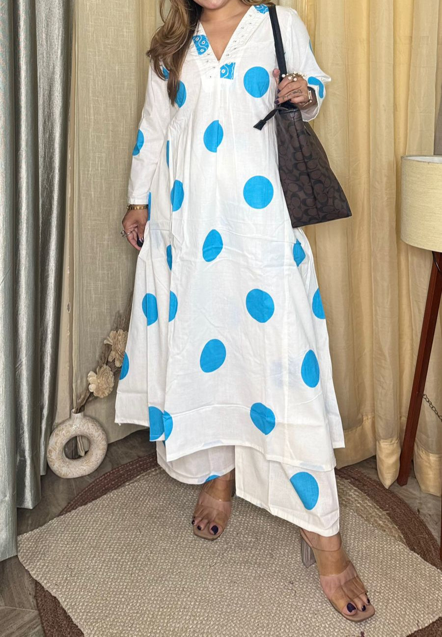 WHITE POLKA DOT 2 PC A LINE SUIT WITH PLAZO