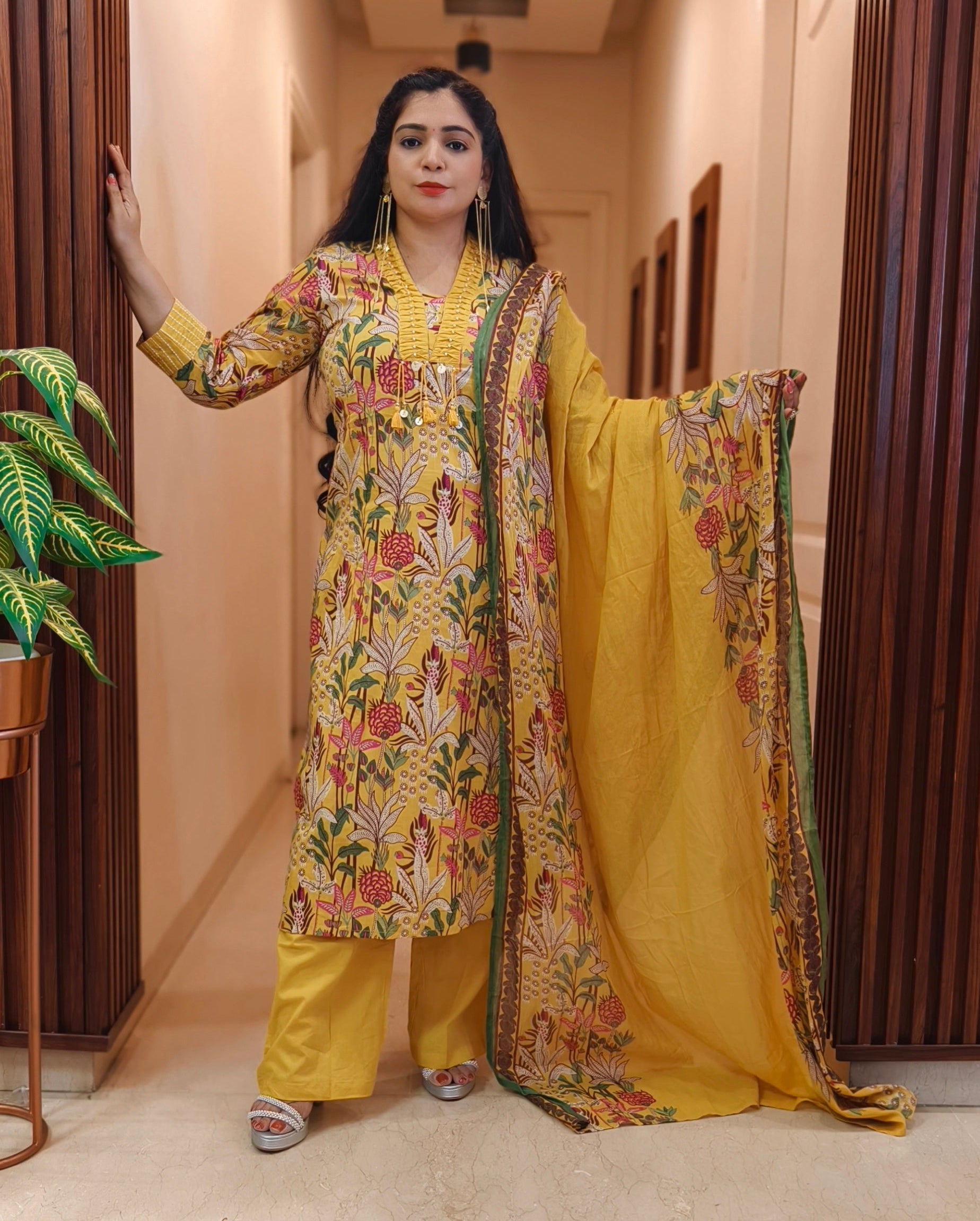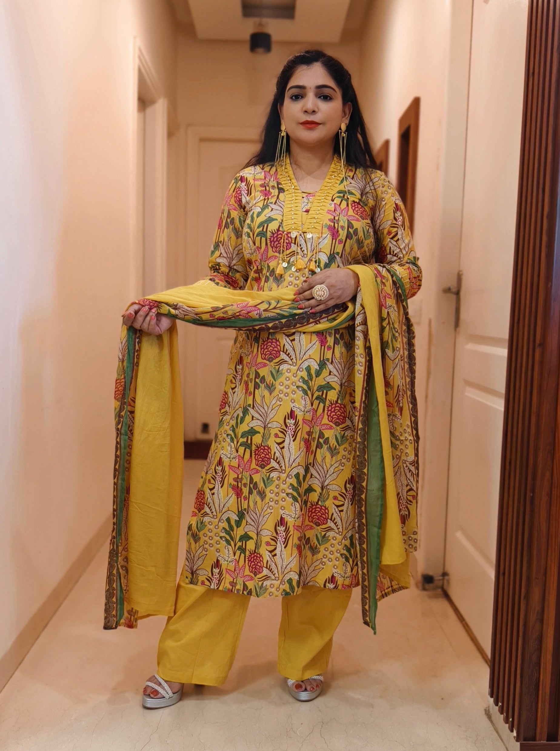 YELLOW AJRAKH PRINT COTTON SUIT WITH DISIGNER PANT