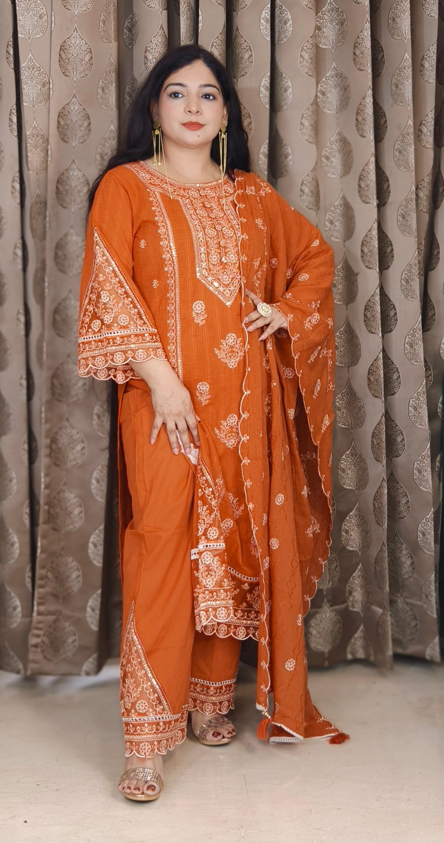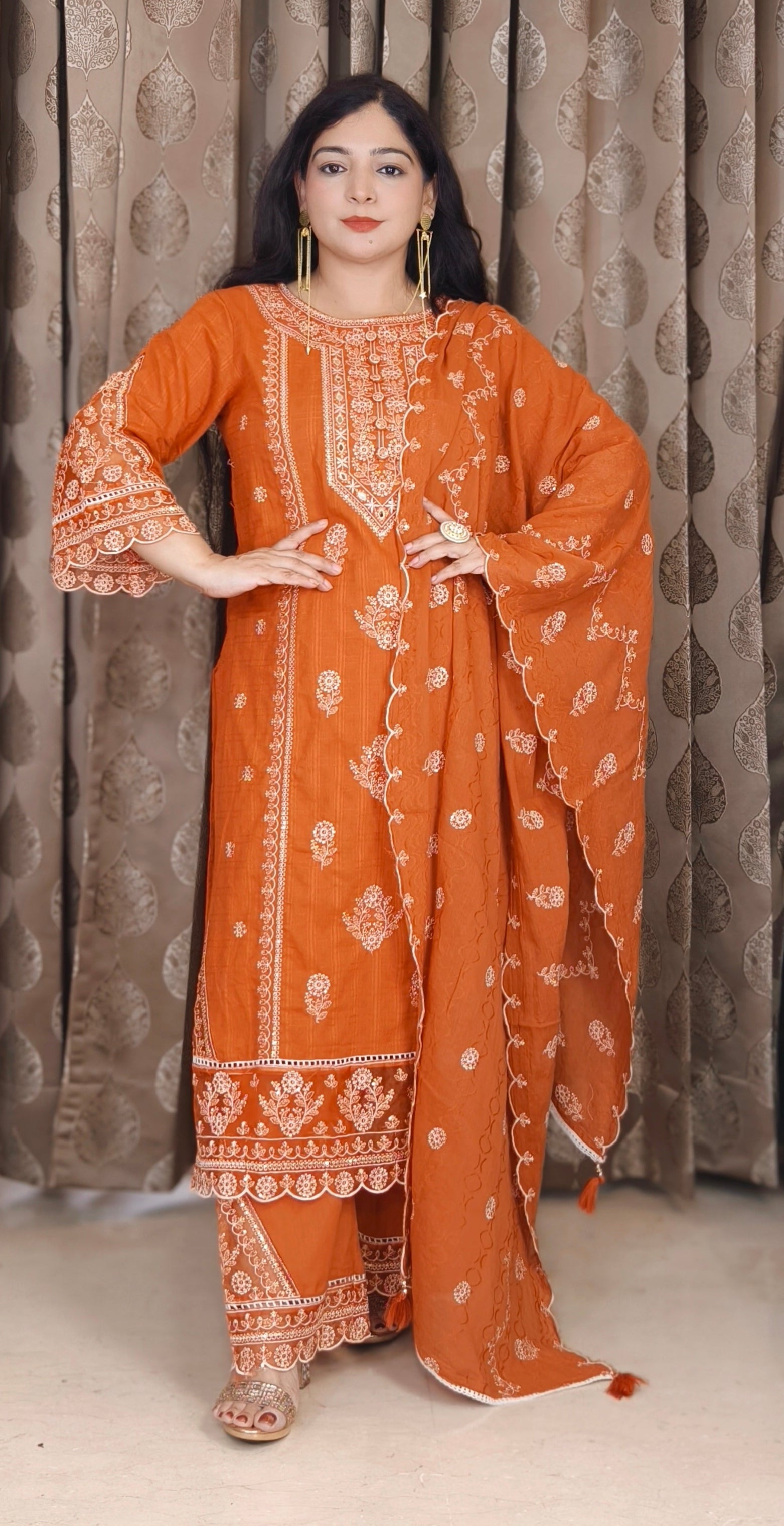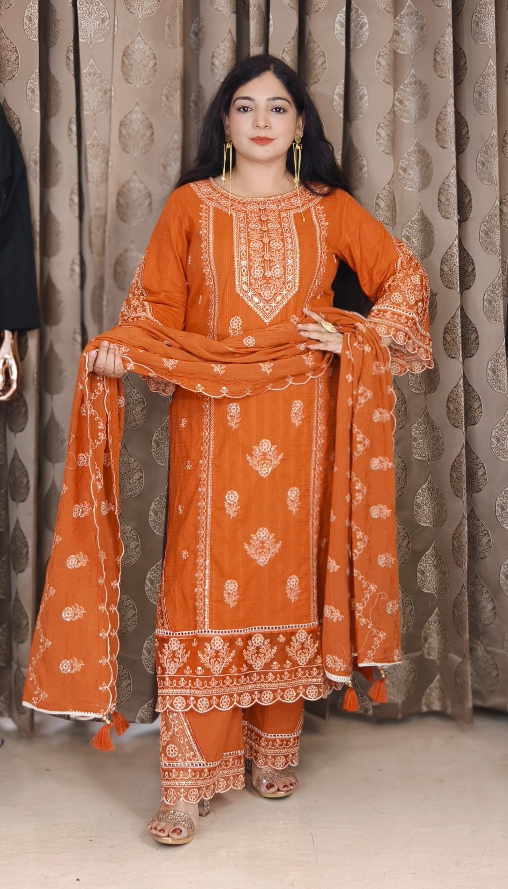 A must have Orange pure Cotton Embroidered suit with cotton lining with plazo Bottom  in your wardrobe. It comes with Printed dupatta.
