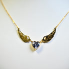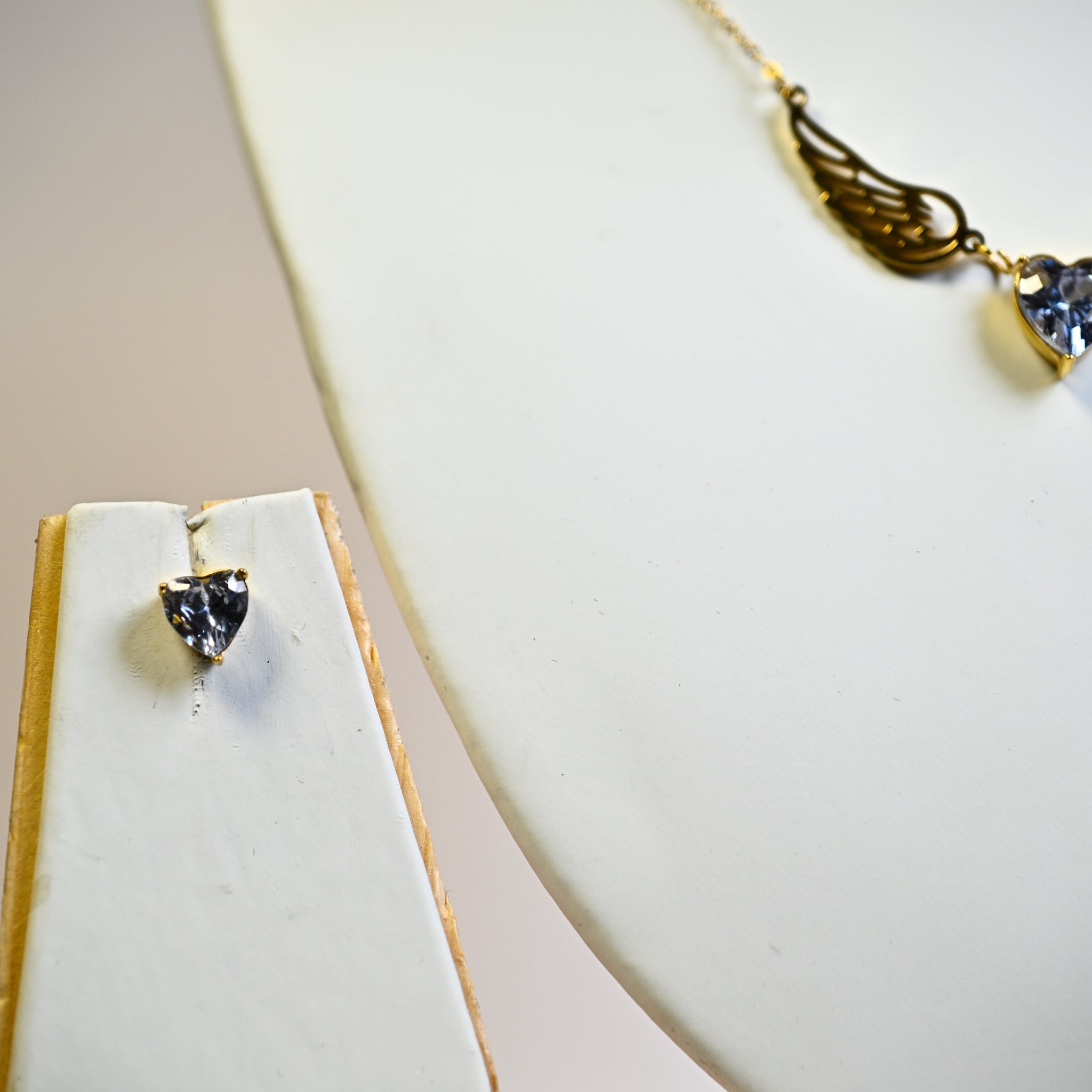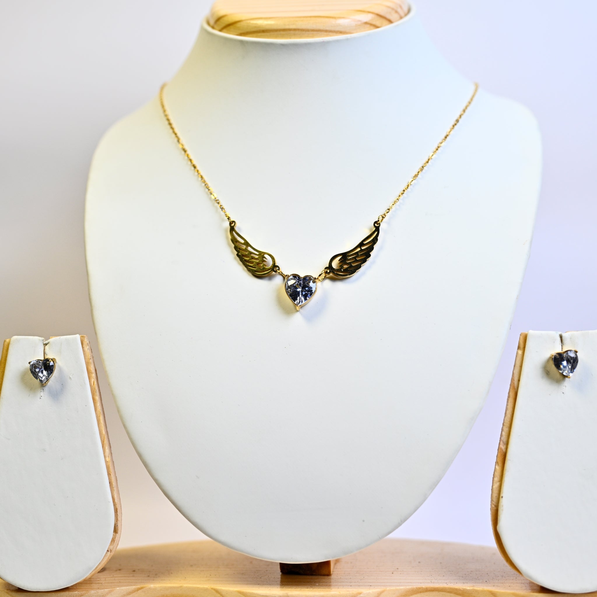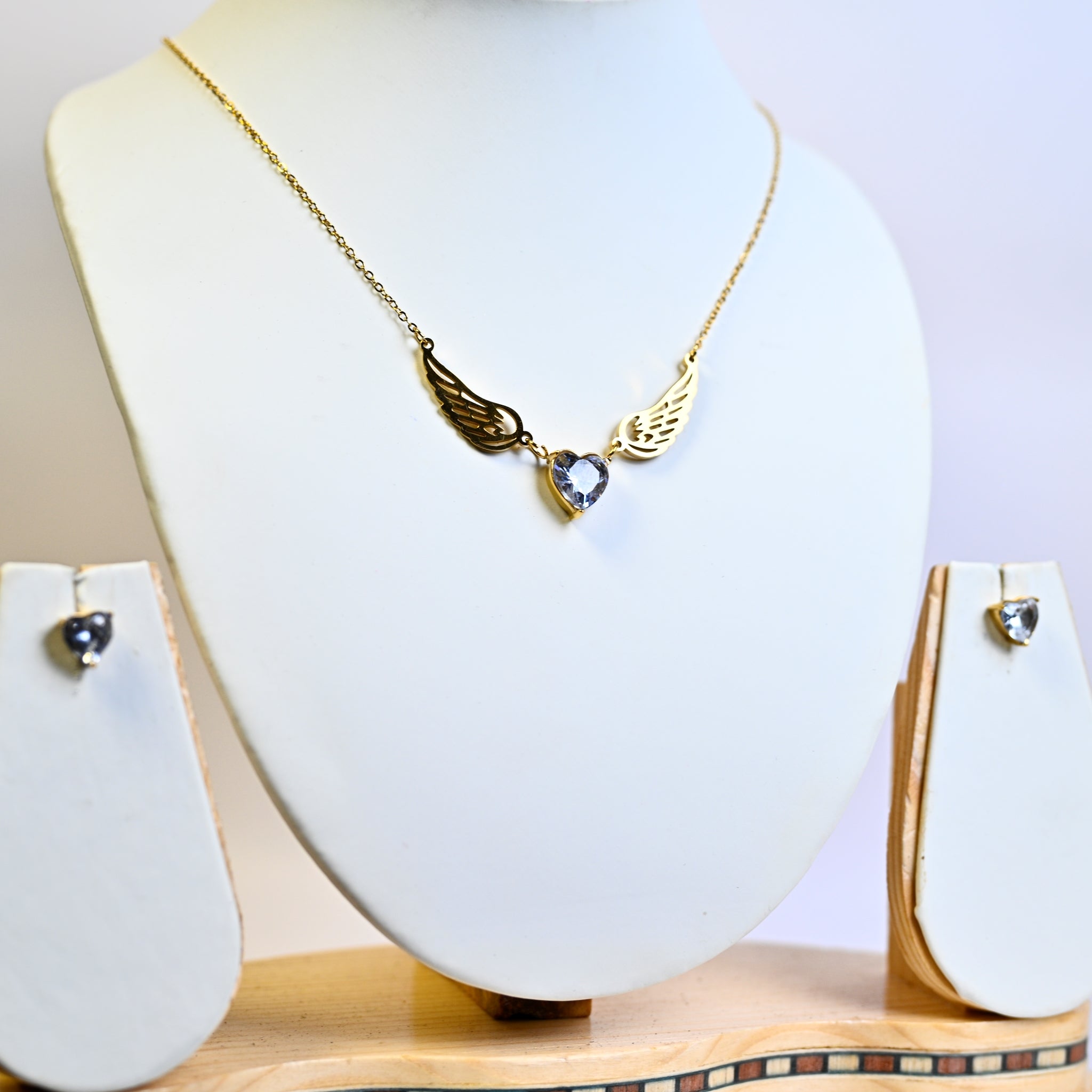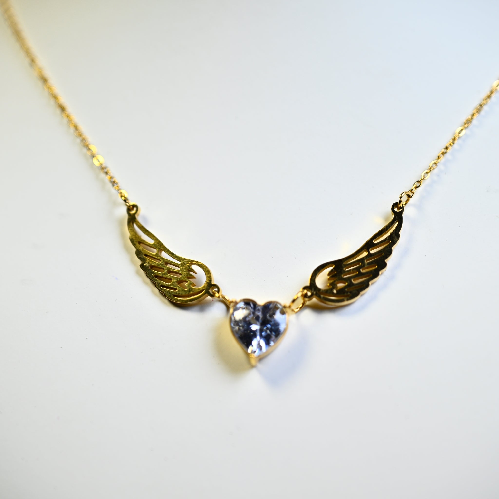Angel Necklace: Stainless featuring a heart pendant with wings adorned in cubic zirconia.