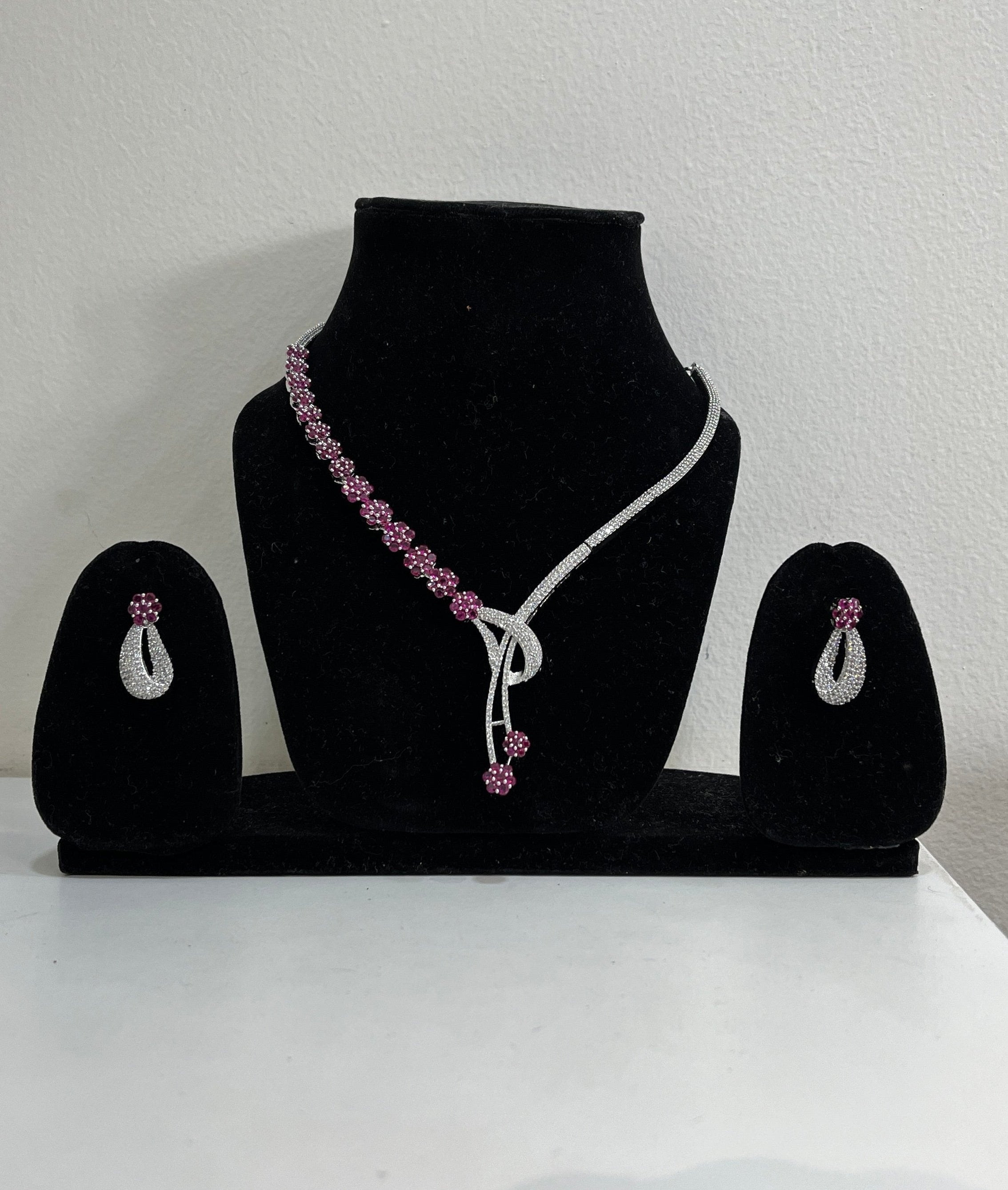 Complementing the necklace, the earrings are designed to match seamlessly, showcasing the same stunning American diamonds that add a touch of brilliance and sparkle to your ensemble. Ideal for special occasions or to add a touch of luxury to everyday wear, this set promises to be a standout addition to your jewelry collection. Embrace the allure of high-quality craftsmanship and undeniable charm with this exquisite necklace and earring set