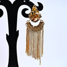 Crafted from high-quality metal alloy, ensuring durability and a polished finish. The earrings feature a unique combination of chain danglers and traditional jhumka design elements. The jhumka typically includes intricate patterns and often adorned with beads or small bells. Designed to dangle gracefully, usually medium-sized to enhance the elegance and movement of the jhumka.