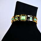 The bracelet features a unique chain design with gemstone accents, showcasing a blend of modern elegance and contemporary style. Adorned with sparkling gemstones, adding a touch of color and brilliance to the bracelet.