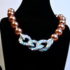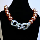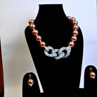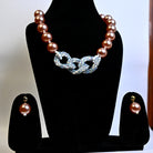A jewelry set featuring a chocolate brown synthetic pearl and glass crystal cluster necklace with matching drop earrings. This type of set is typically designed to add a touch of elegance and sophistication to various outfits, suitable for both formal and casual occasions.