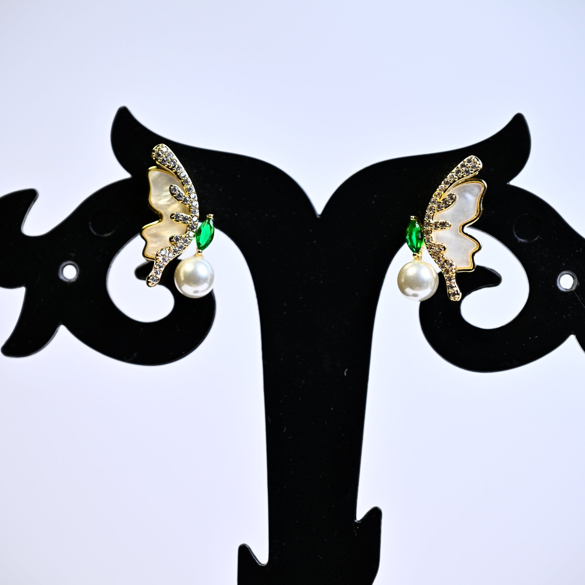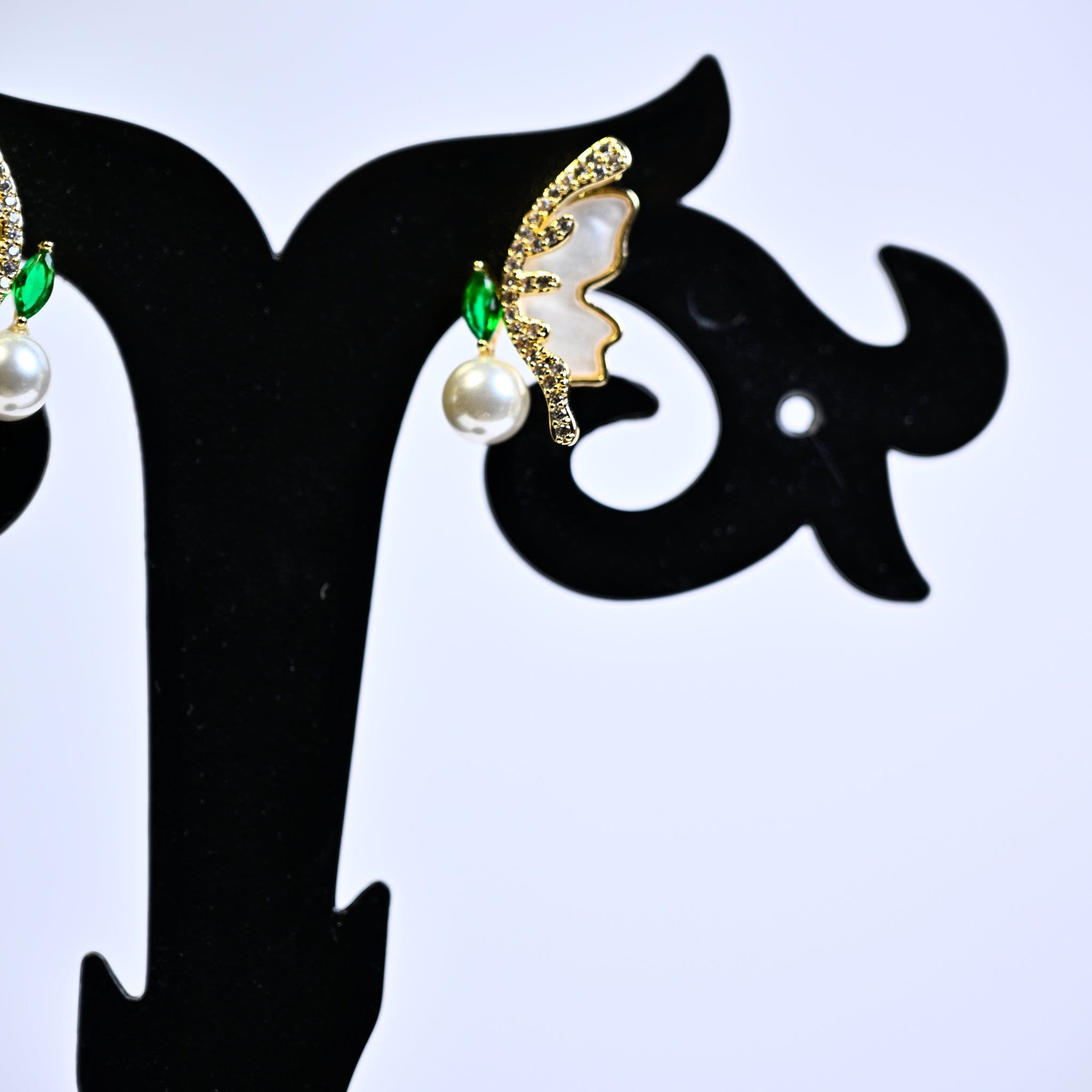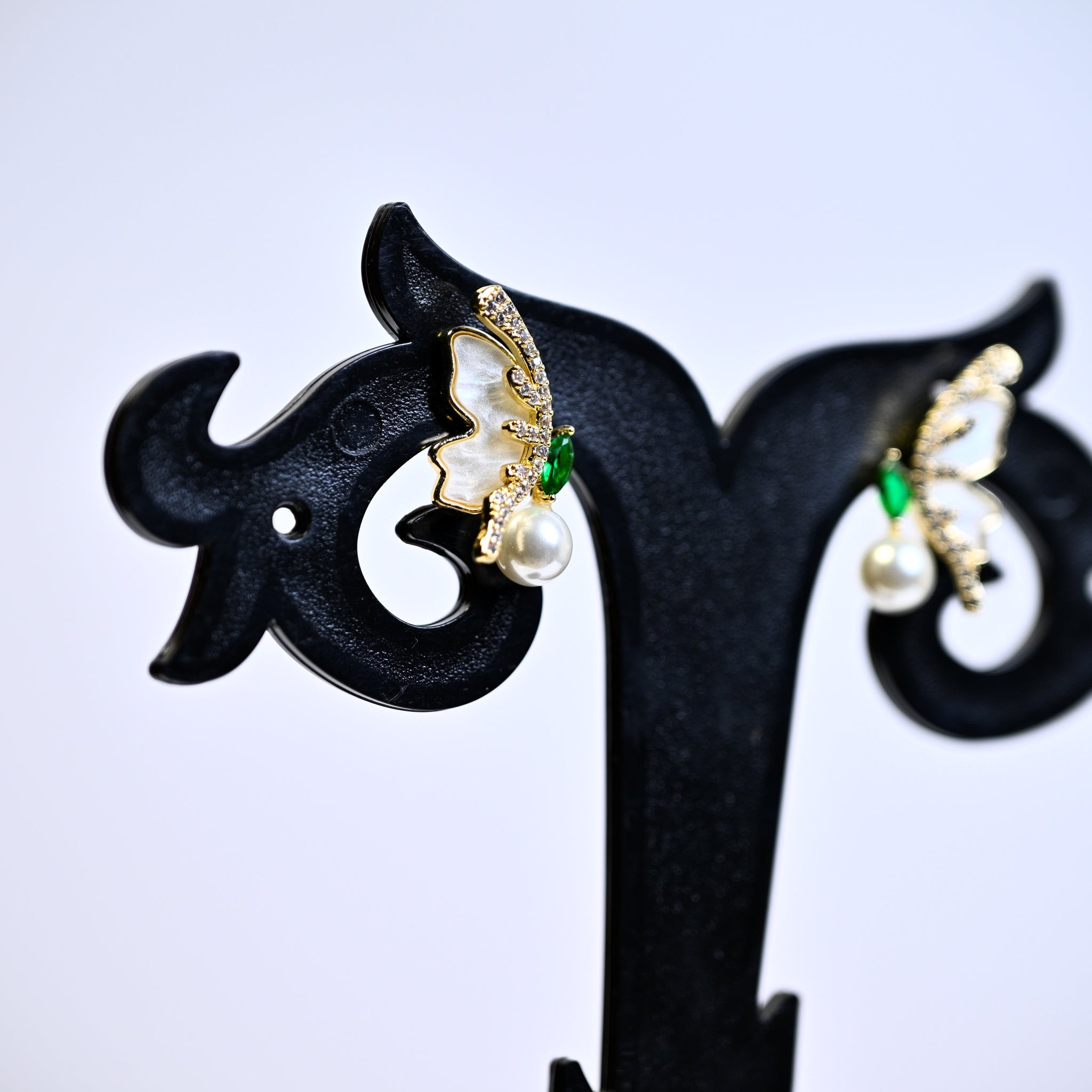 The earrings feature a regal and elegant design, possibly incorporating intricate patterns or motifs that evoke a sense of royalty and sophistication. They are designed to dangle or flutter delicately, adding movement and grace to your look.