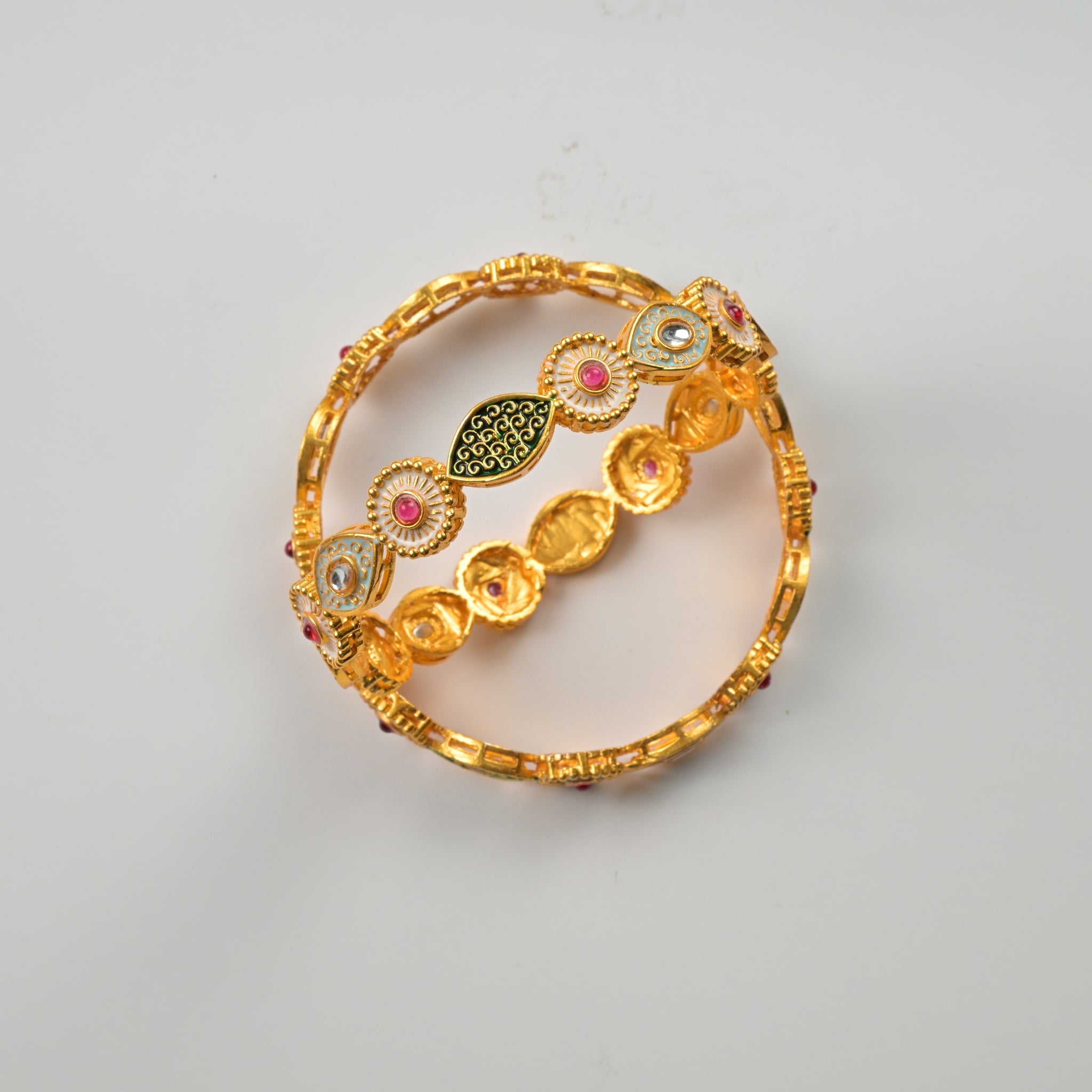 Each bangle is meticulously crafted with vibrant, hand-painted enamel work that adds a pop of color and artistic flair. The rich gold plating enhances the traditional charm, making these bangles perfect for both festive occasions and everyday wear. Combining timeless beauty with contemporary elegance, this set is a stunning addition to any jewelry collection, promising to add a touch of sophistication to your look.