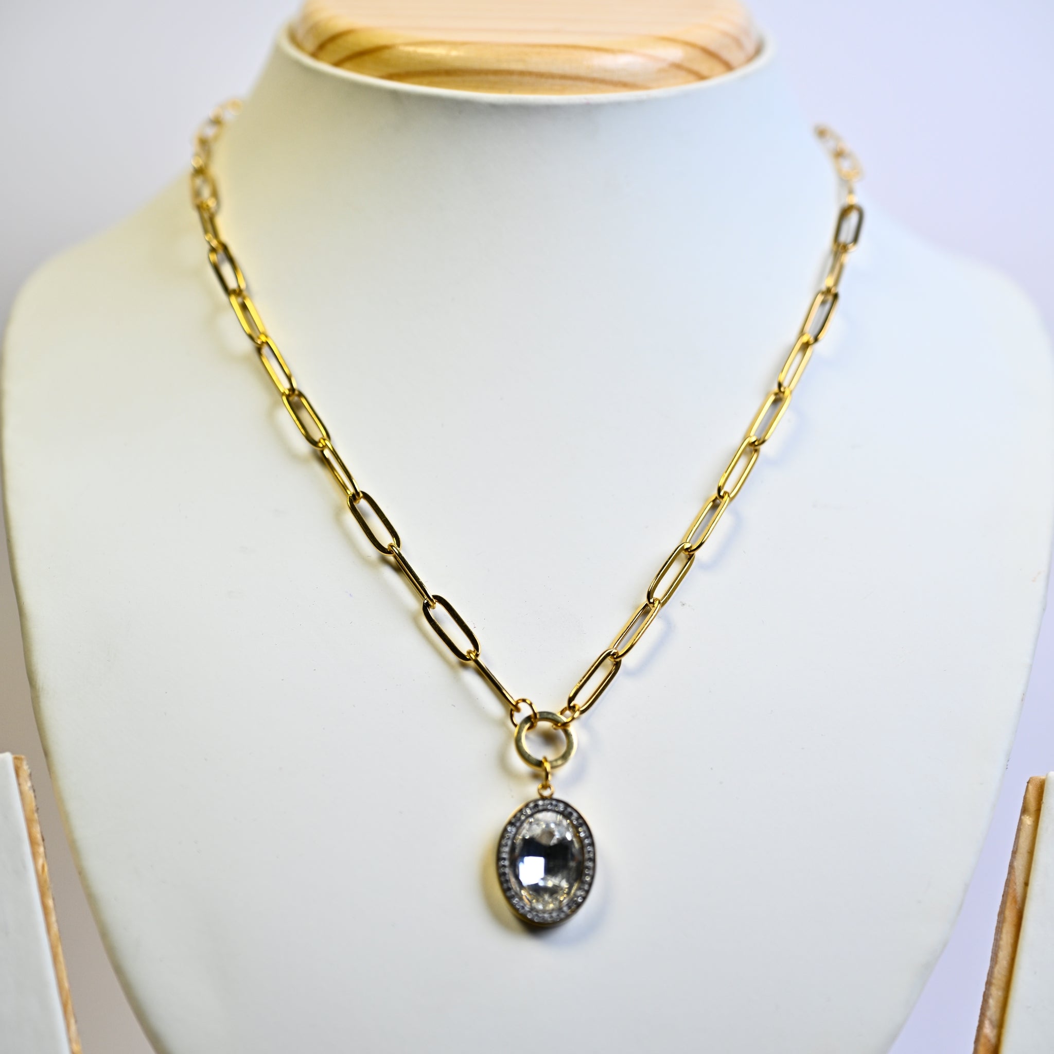 The necklace is crafted from high-quality metal alloy, ensuring durability and a sleek appearance.