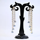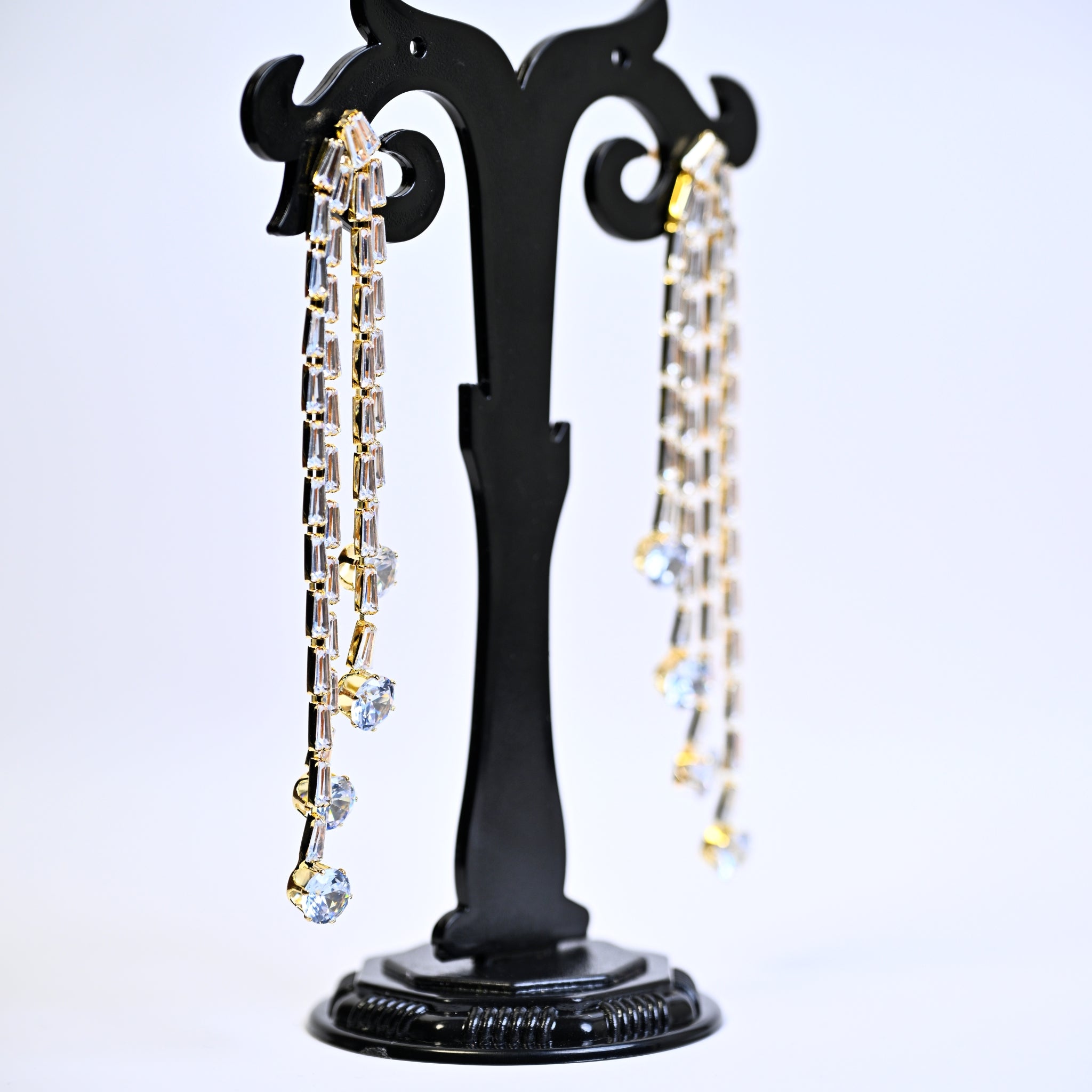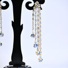 The earrings feature a stud style adorned with rhinestones, adding sparkle and glamour to the design. They also include elegant tassels that dangle delicately, enhancing the overall sophistication. Designed to be medium-sized, striking a balance between subtlety and statement-making.