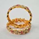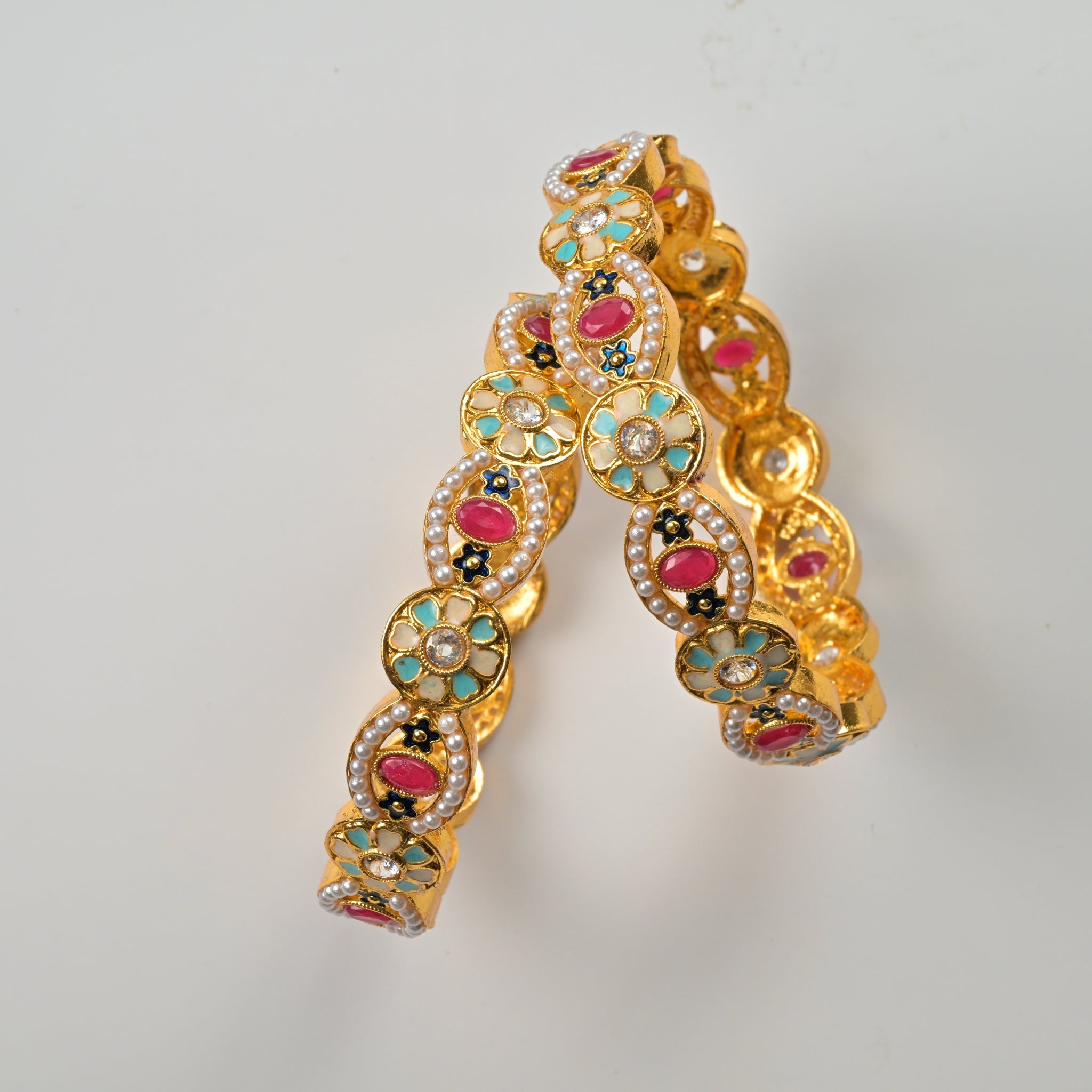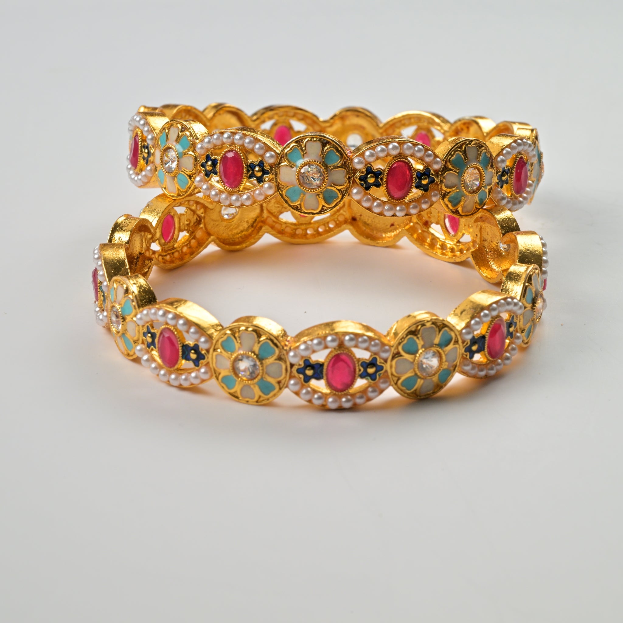 Each piece showcases intricate floral patterns adorned with sparkling Kundan stones, set in a classic design that exudes elegance and grace. The traditional craftsmanship is beautifully complemented by the radiant finish, making these kadas perfect for festive occasions or special events. Elevate your look with this timeless set that blends rich cultural heritage with a touch of contemporary charm.