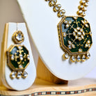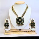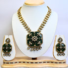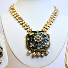 Each piece in this set is crafted with meticulous attention to detail, showcasing the allure of Vaidurya alongside vibrant gemstones that shimmer and catch the light. The necklace features a stunning centerpiece embellished with Vaidurya, surrounded by carefully placed gemstones that enhance its beauty. Matching earrings complement the necklace, completing the ensemble with elegance and grace.