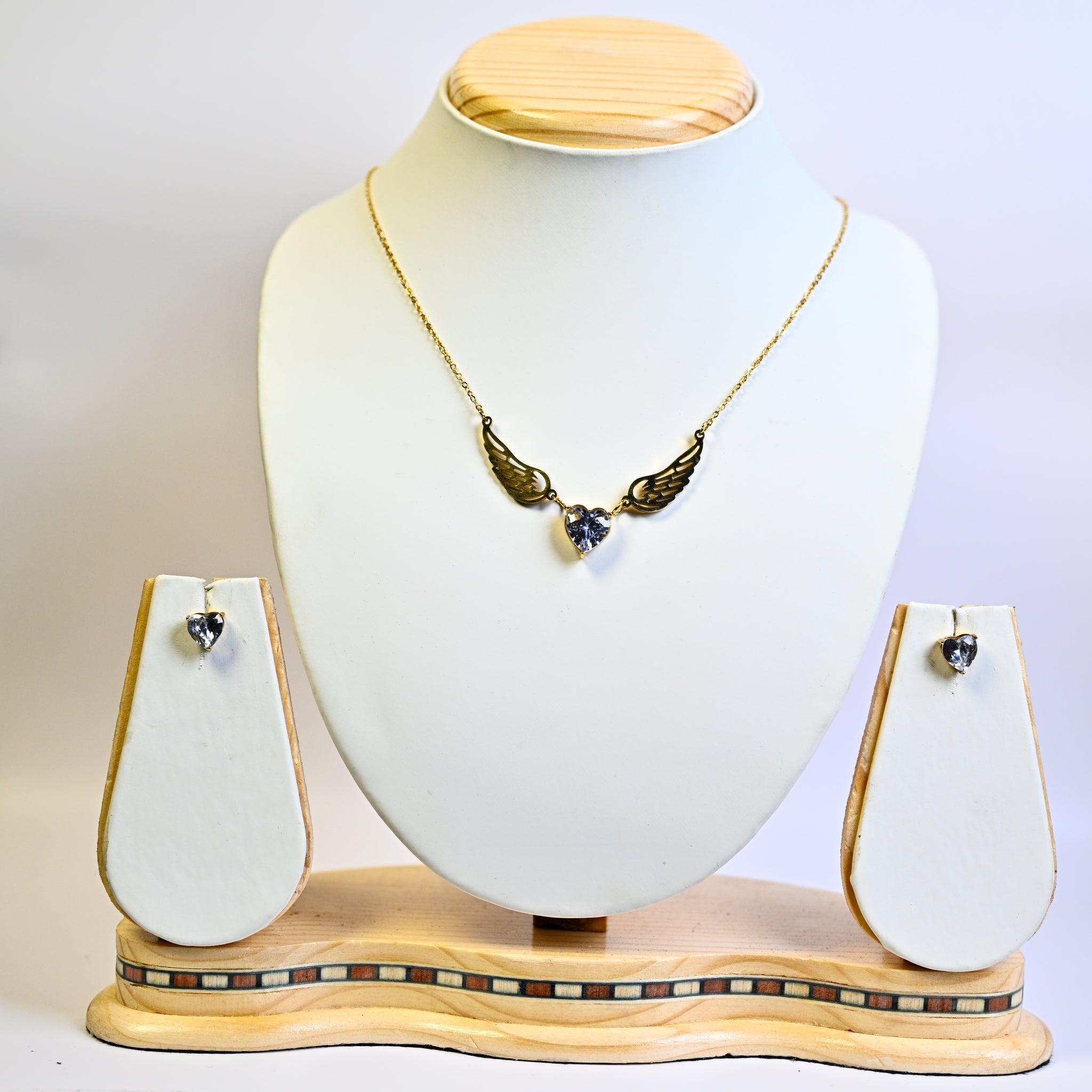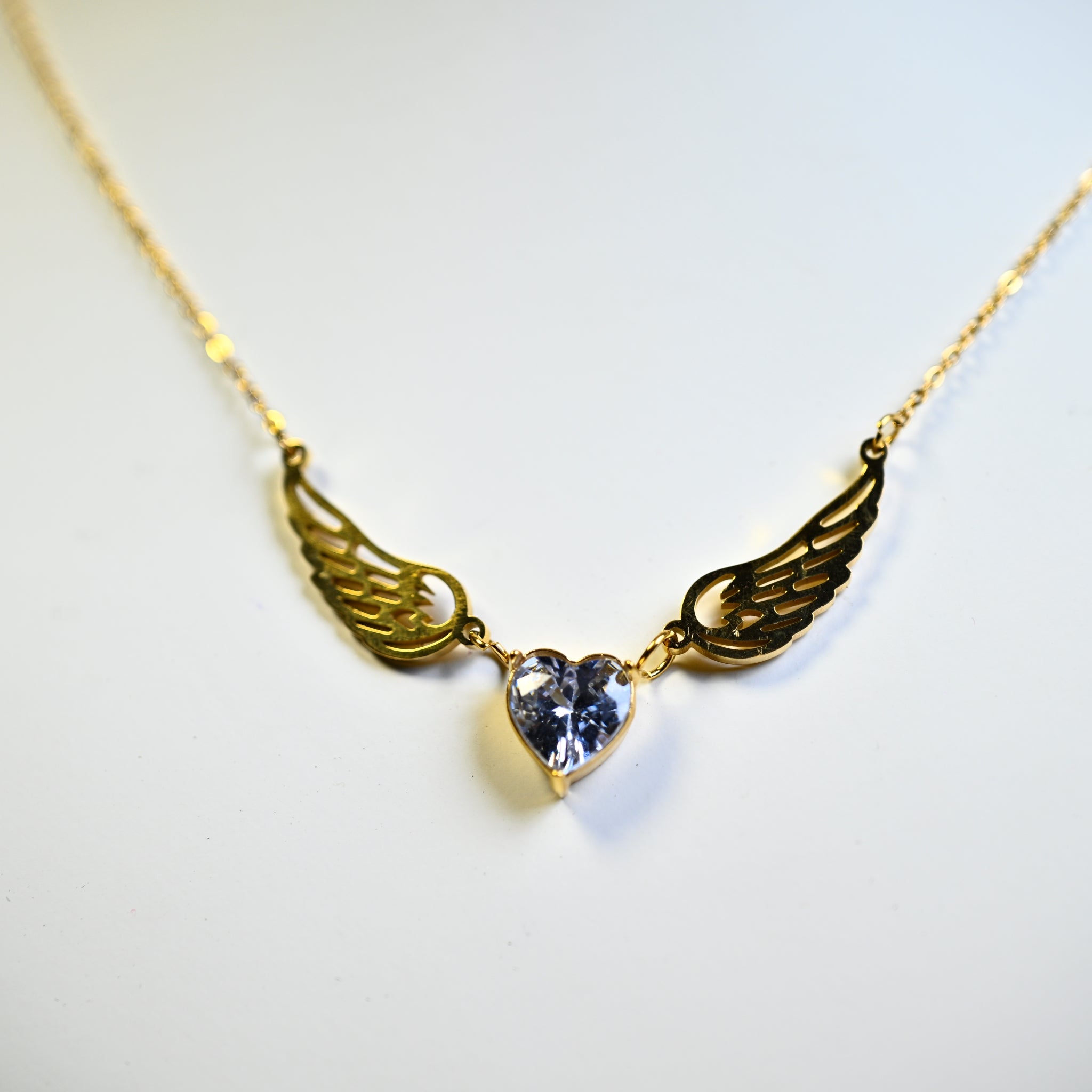 Angel Necklace: Stainless featuring a heart pendant with wings adorned in cubic zirconia.