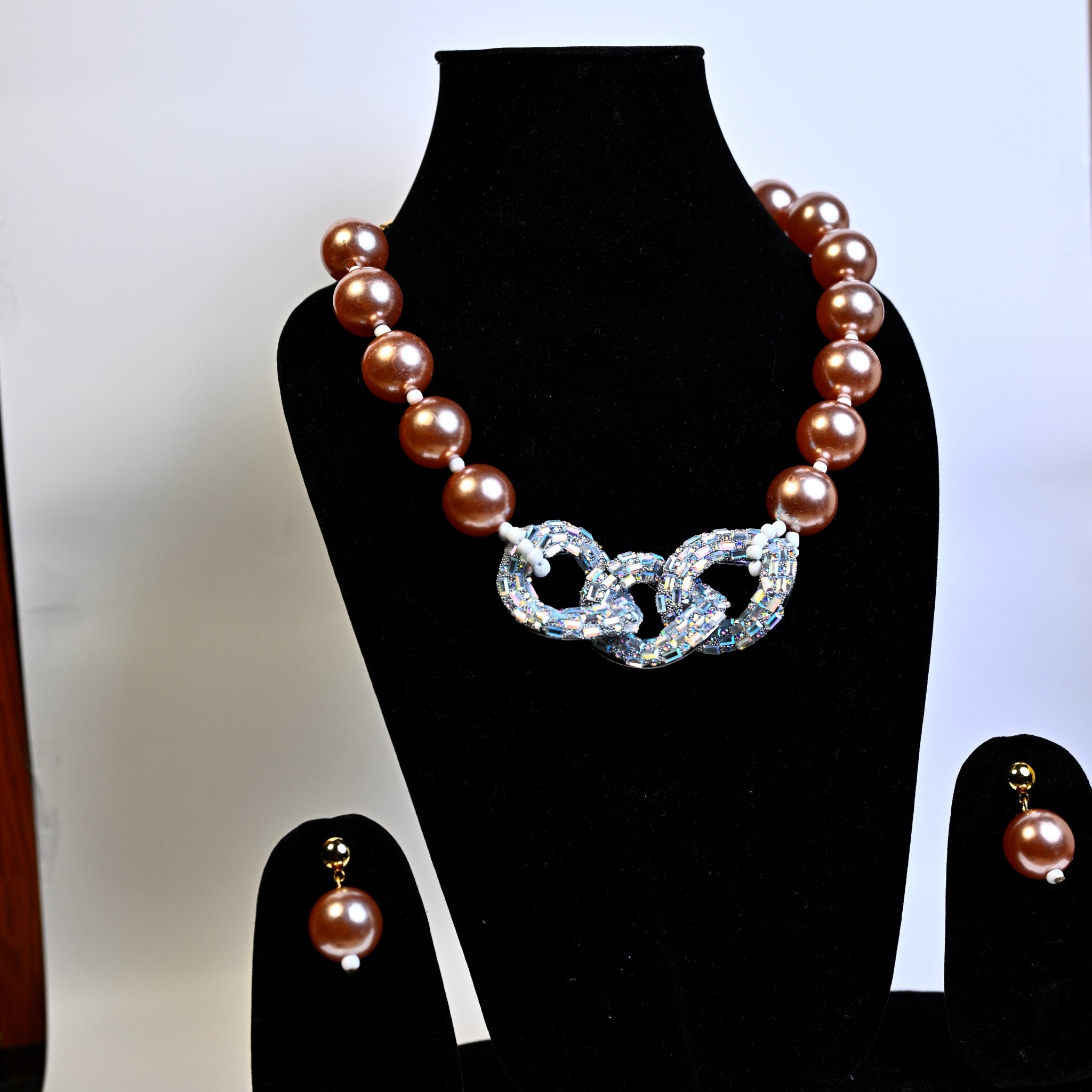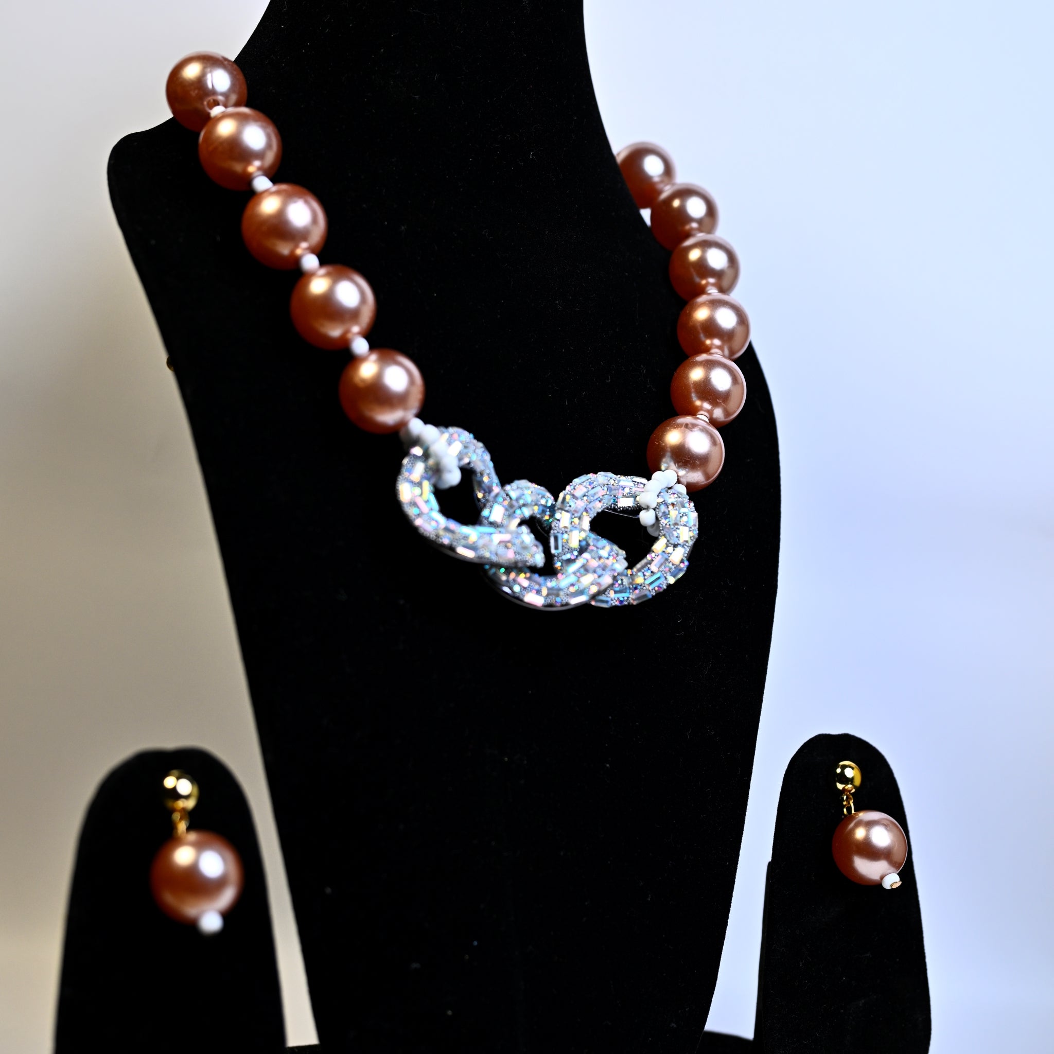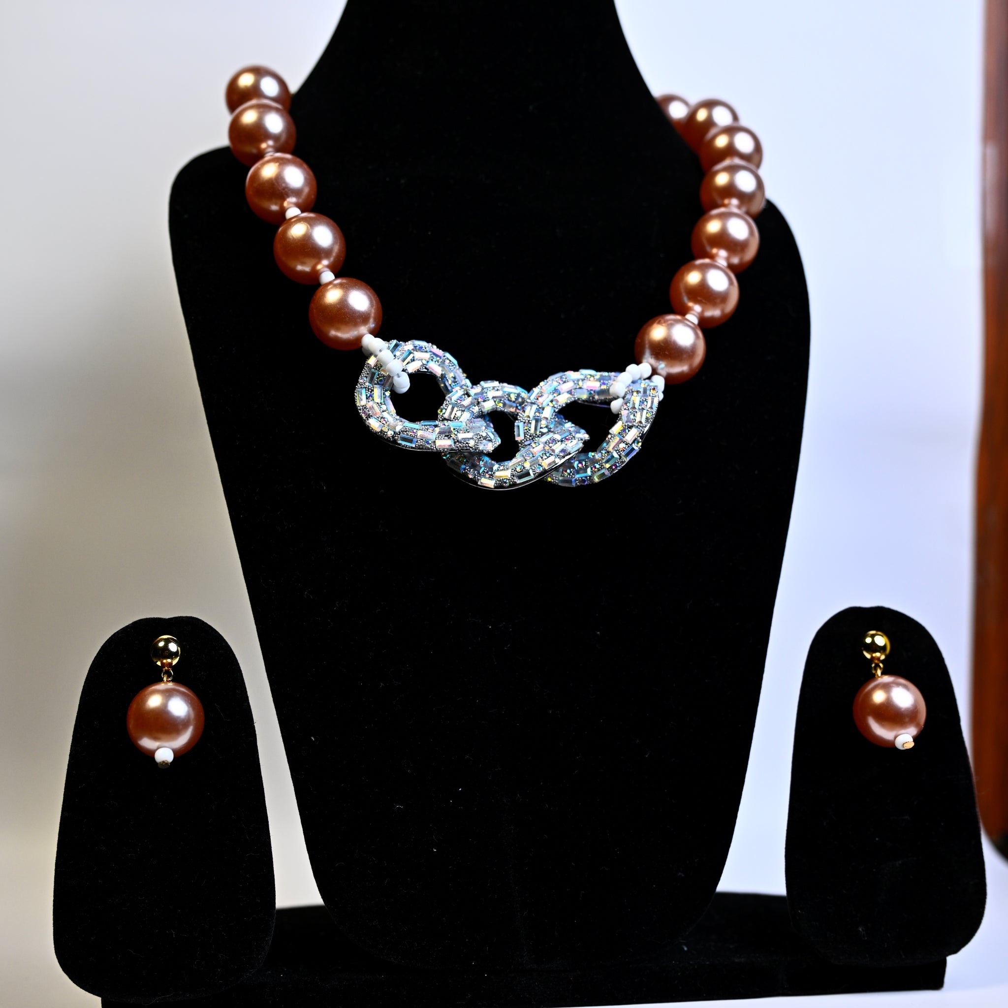 Chocolate Brown Synthetic Pearl/Glass Crystal Cluster Necklace & Drop Earrings Set