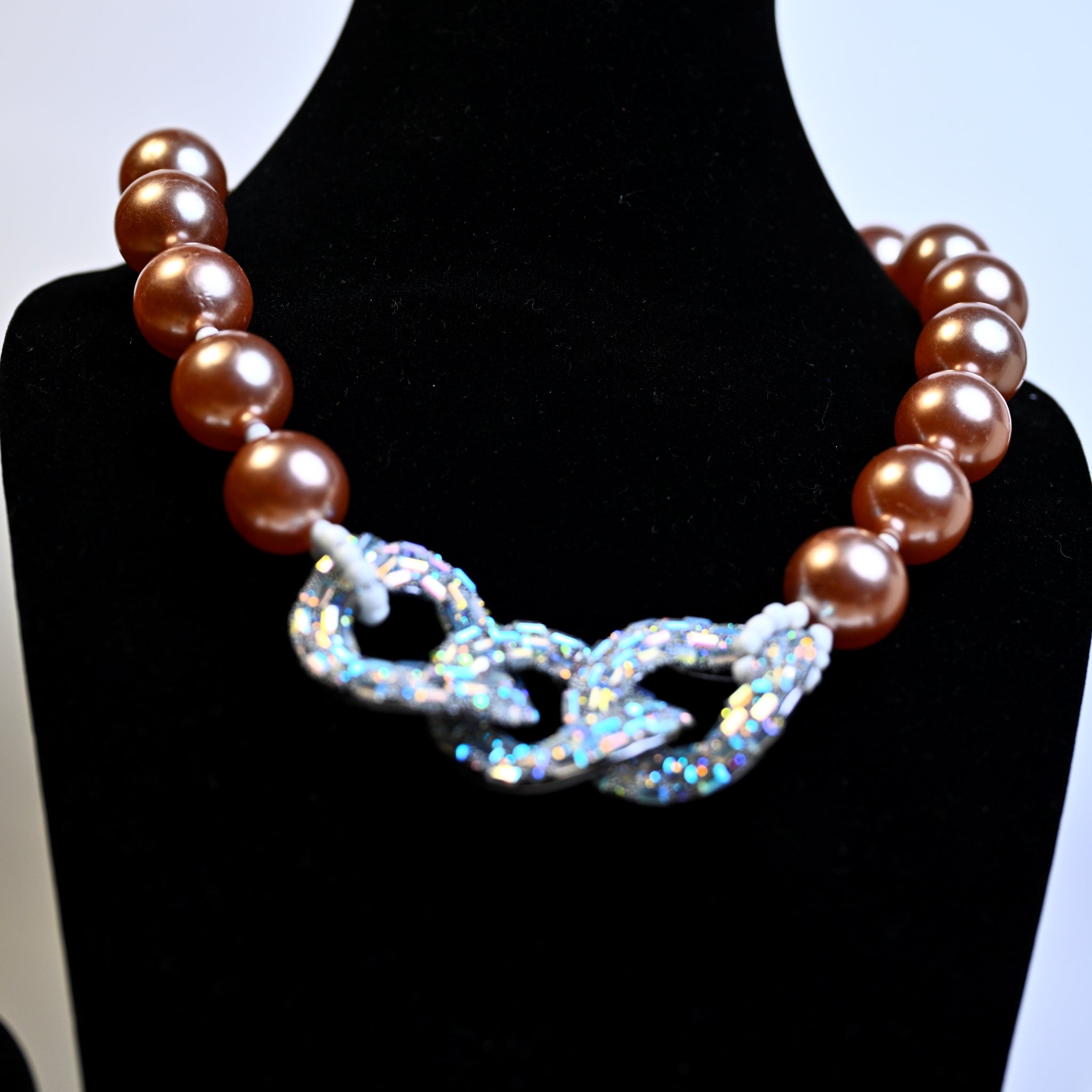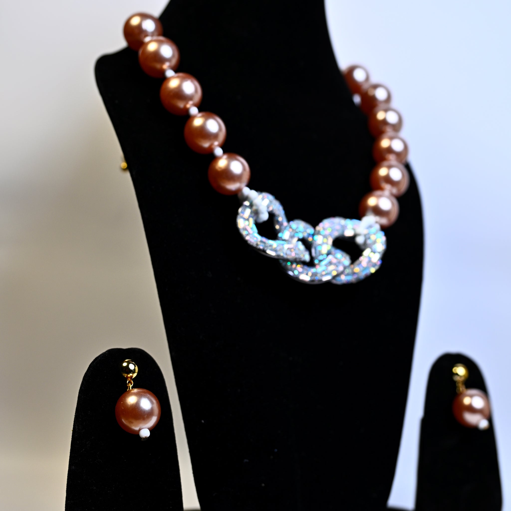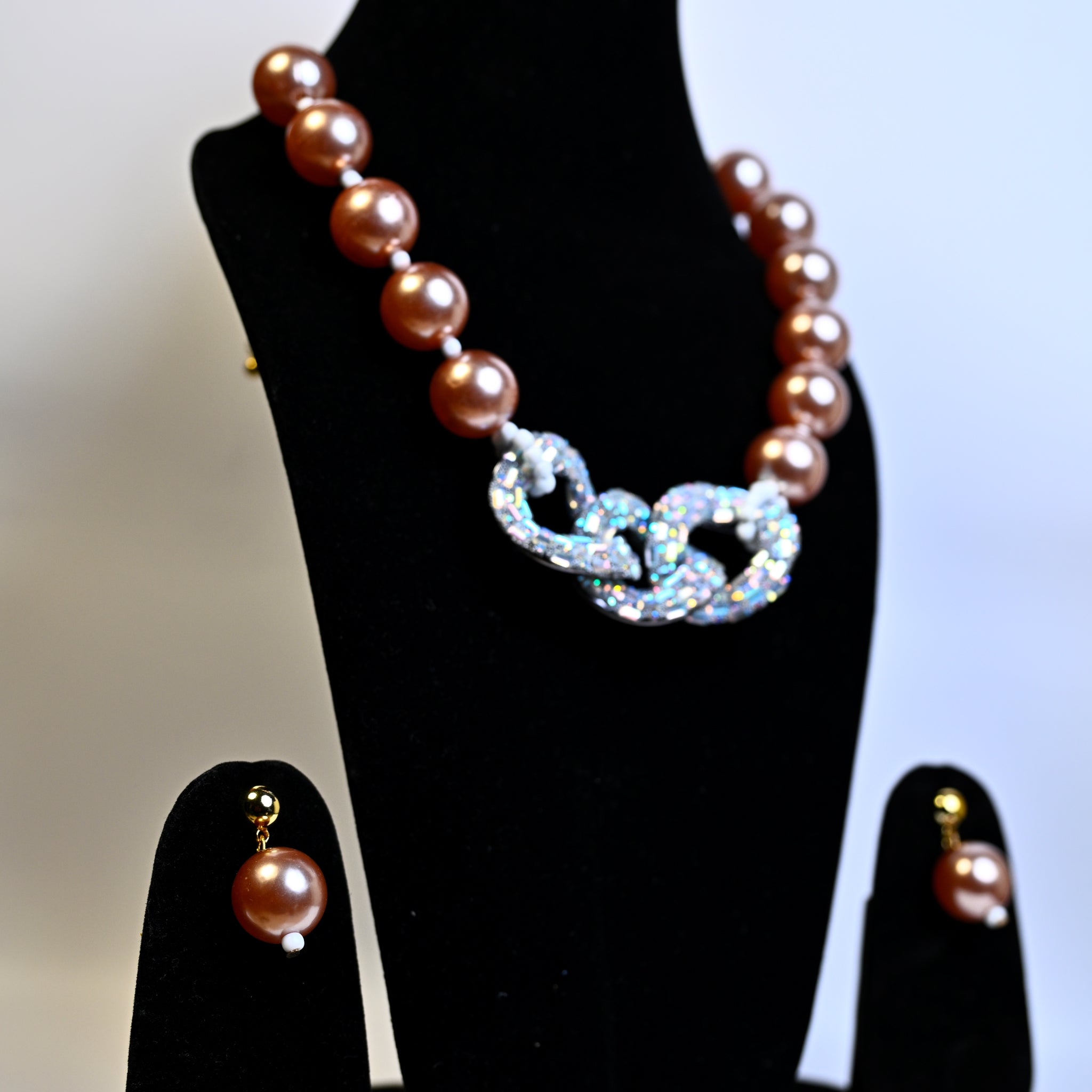 Chocolate Brown Synthetic Pearl/Glass Crystal Cluster Necklace & Drop Earrings Set