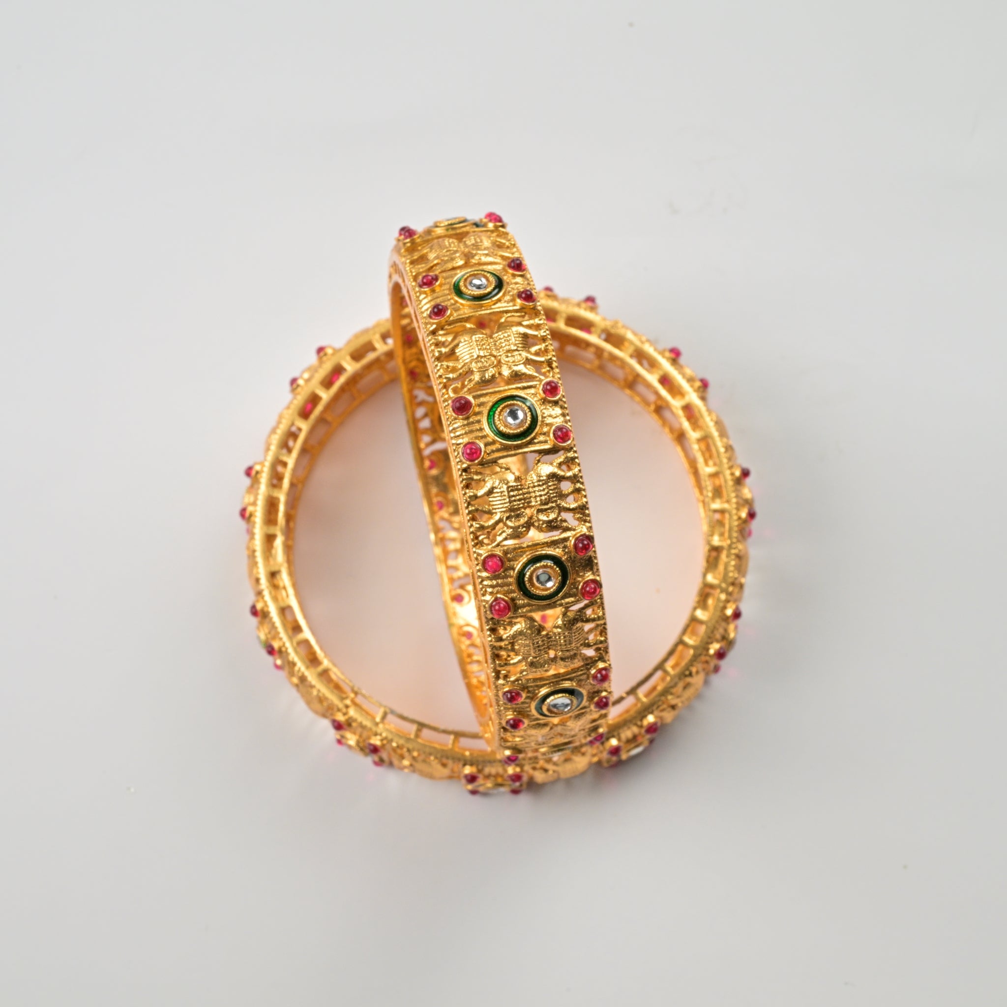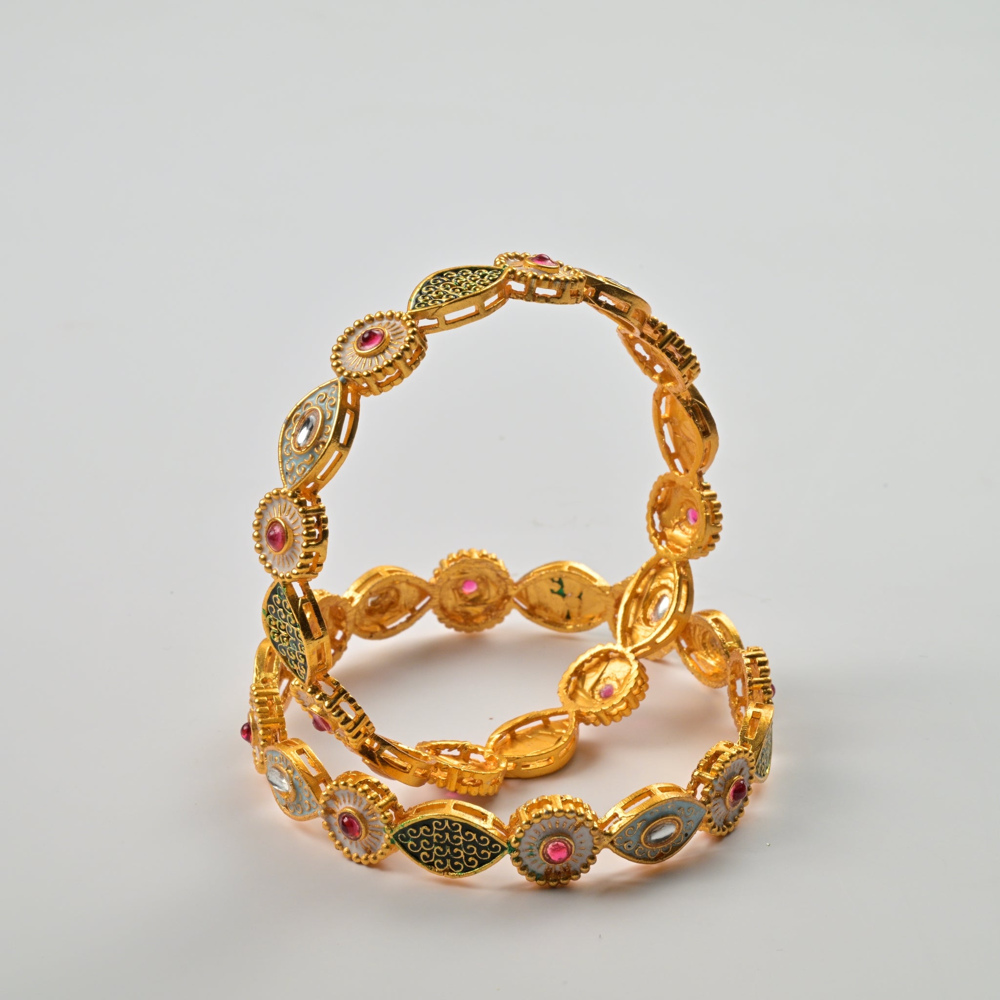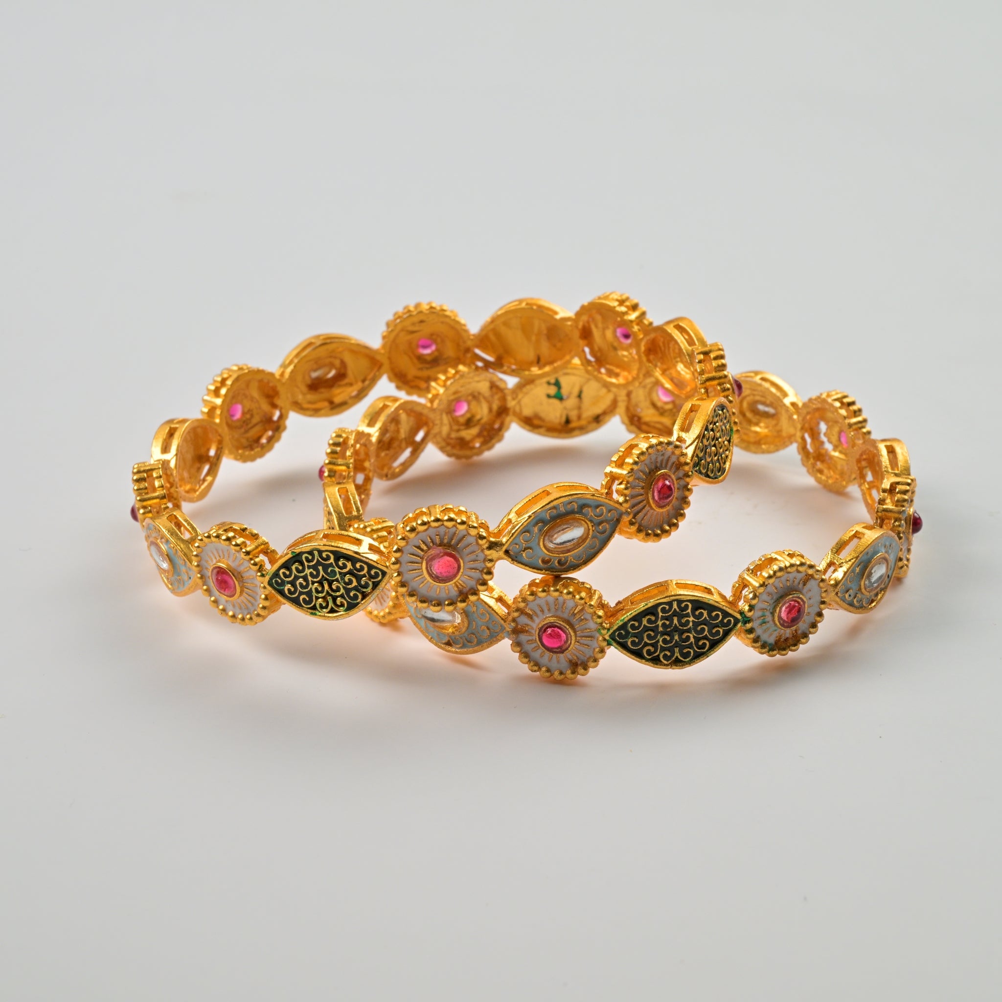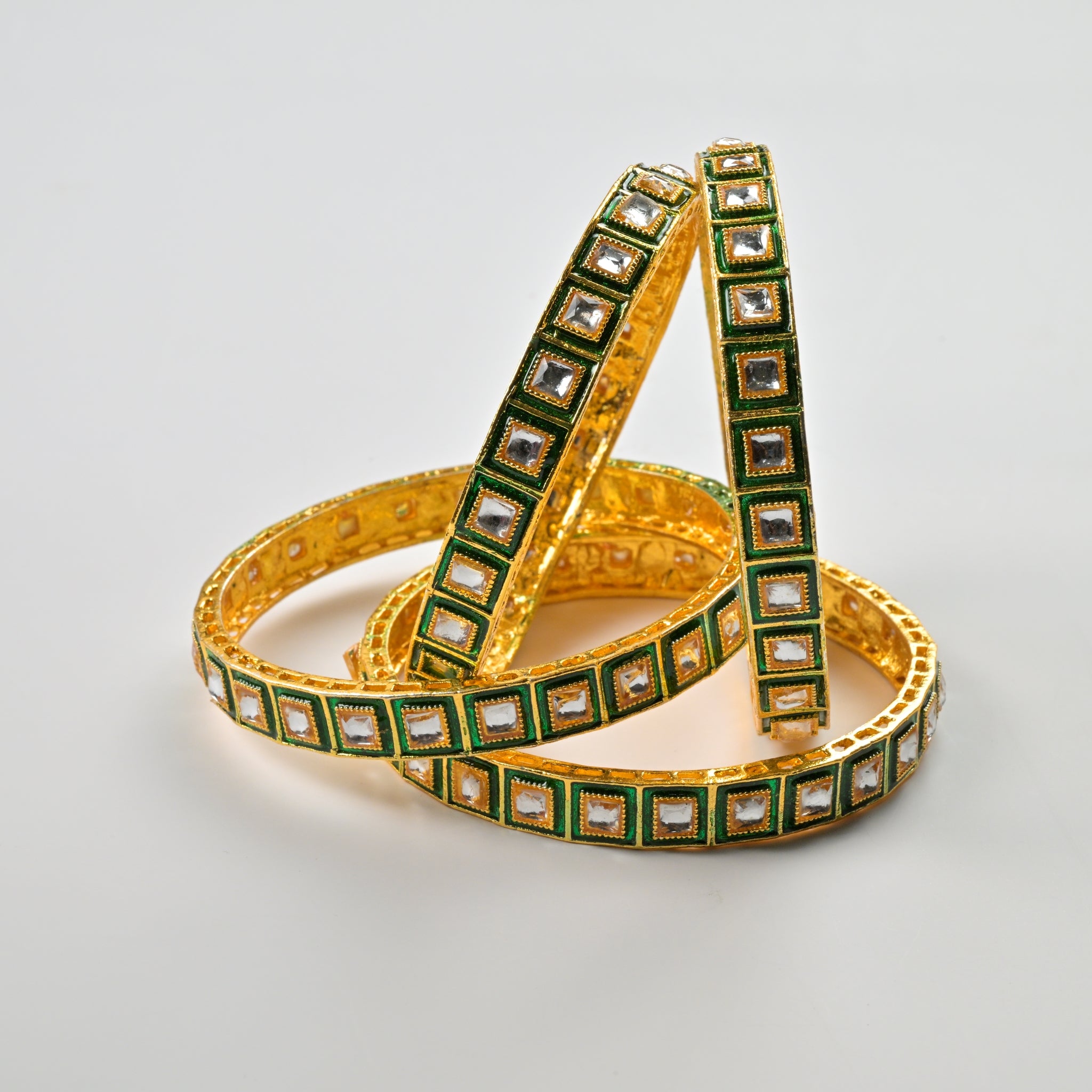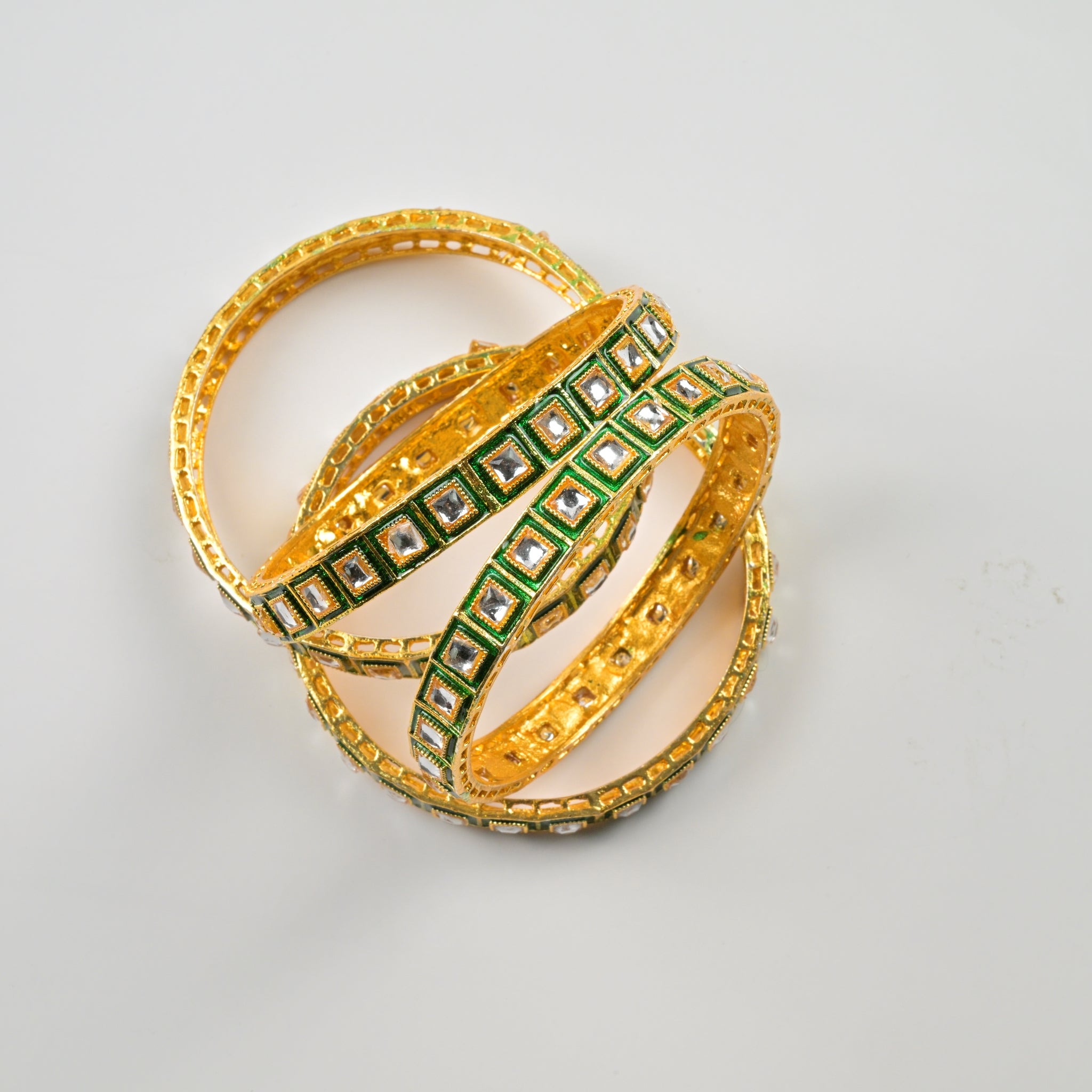 Set of 4 Antique Gold-Plated Bangles with Green Meena and Kundan Work for Women