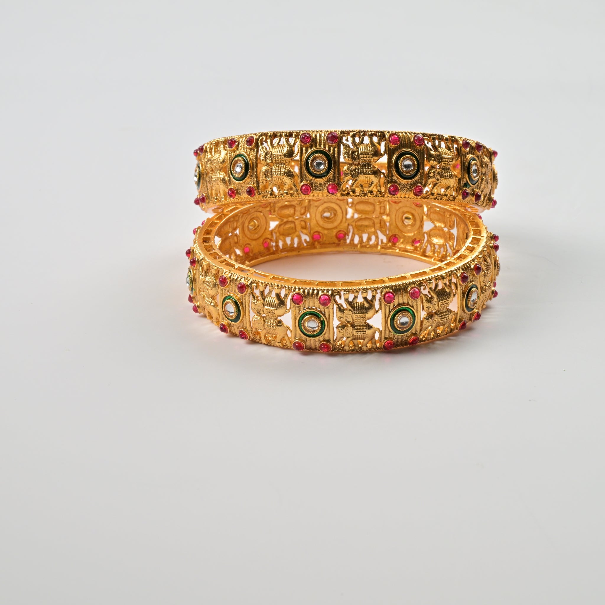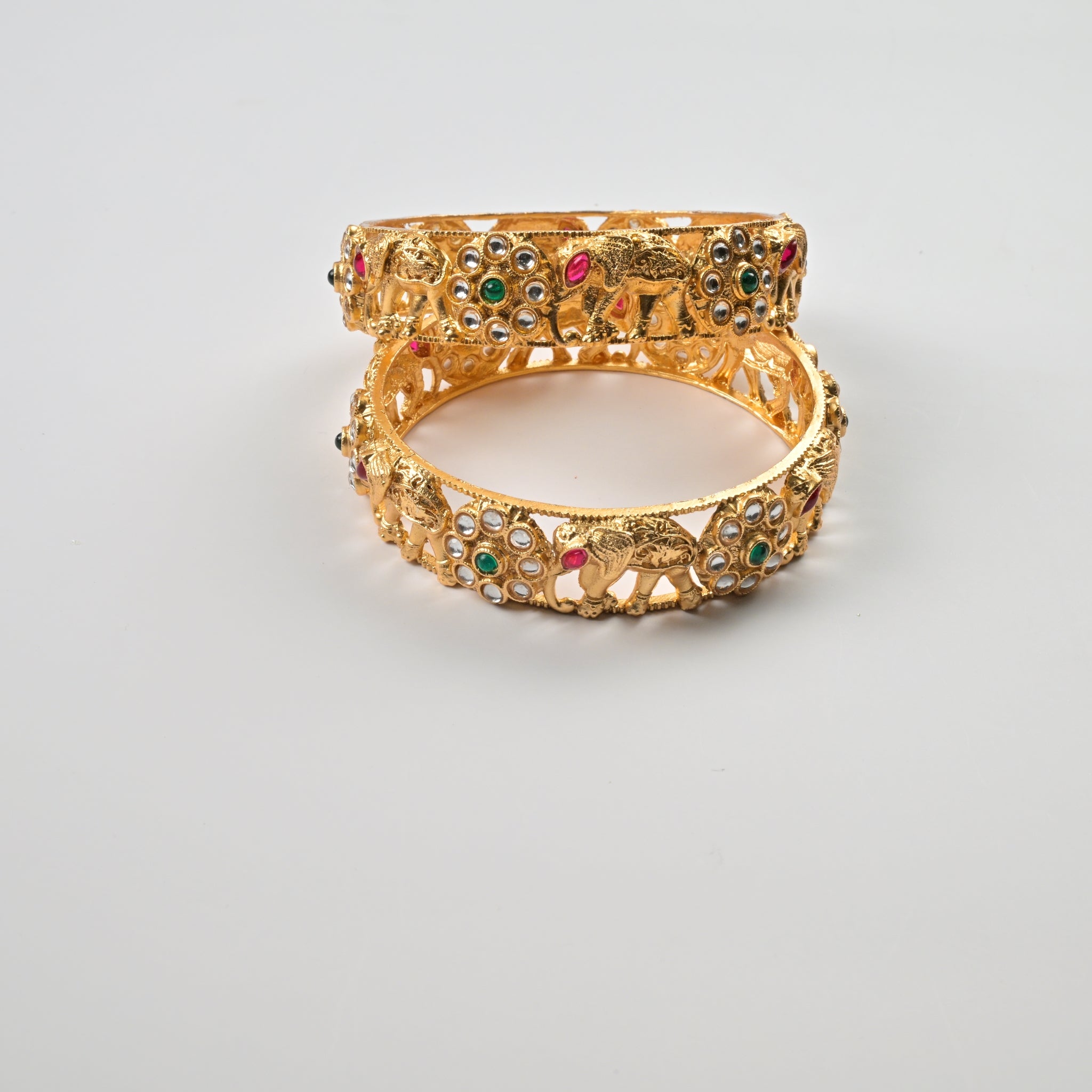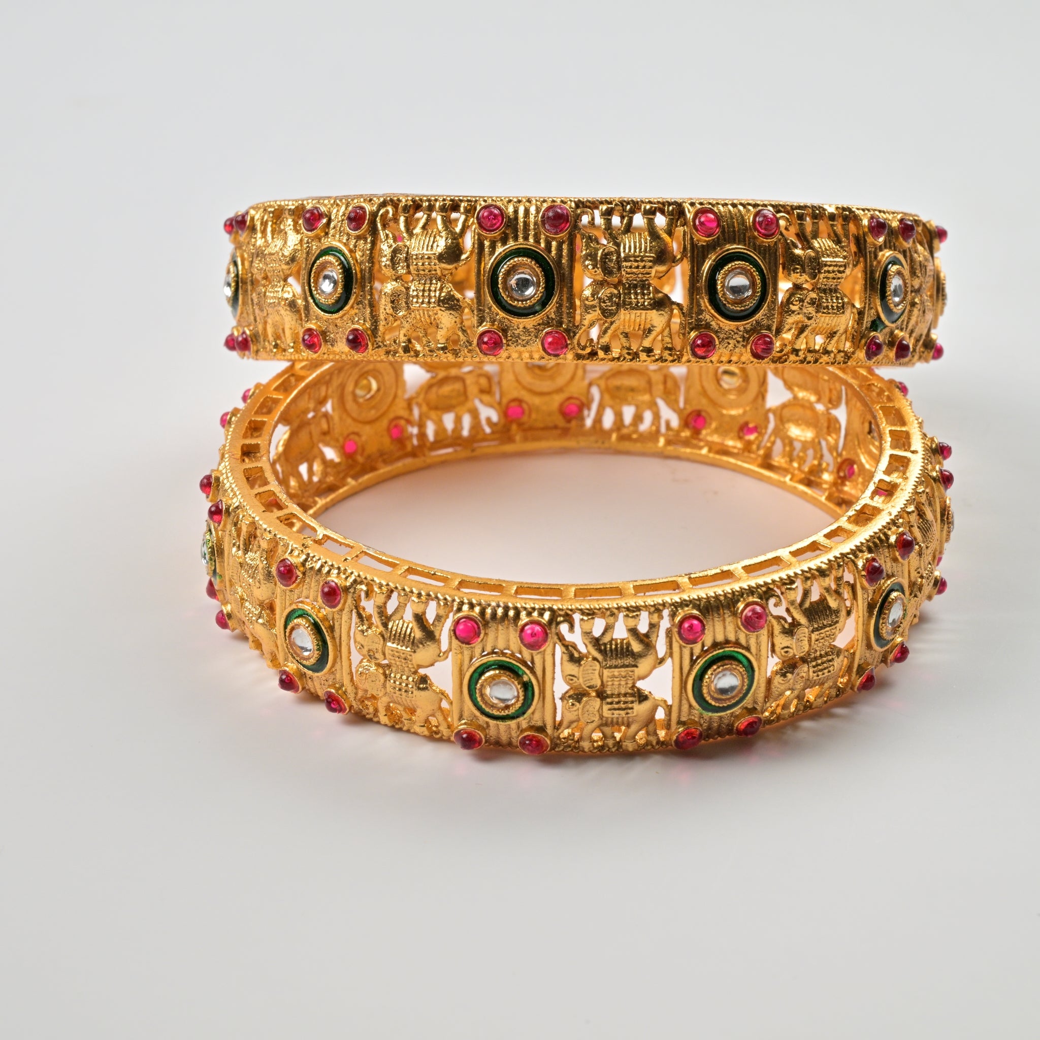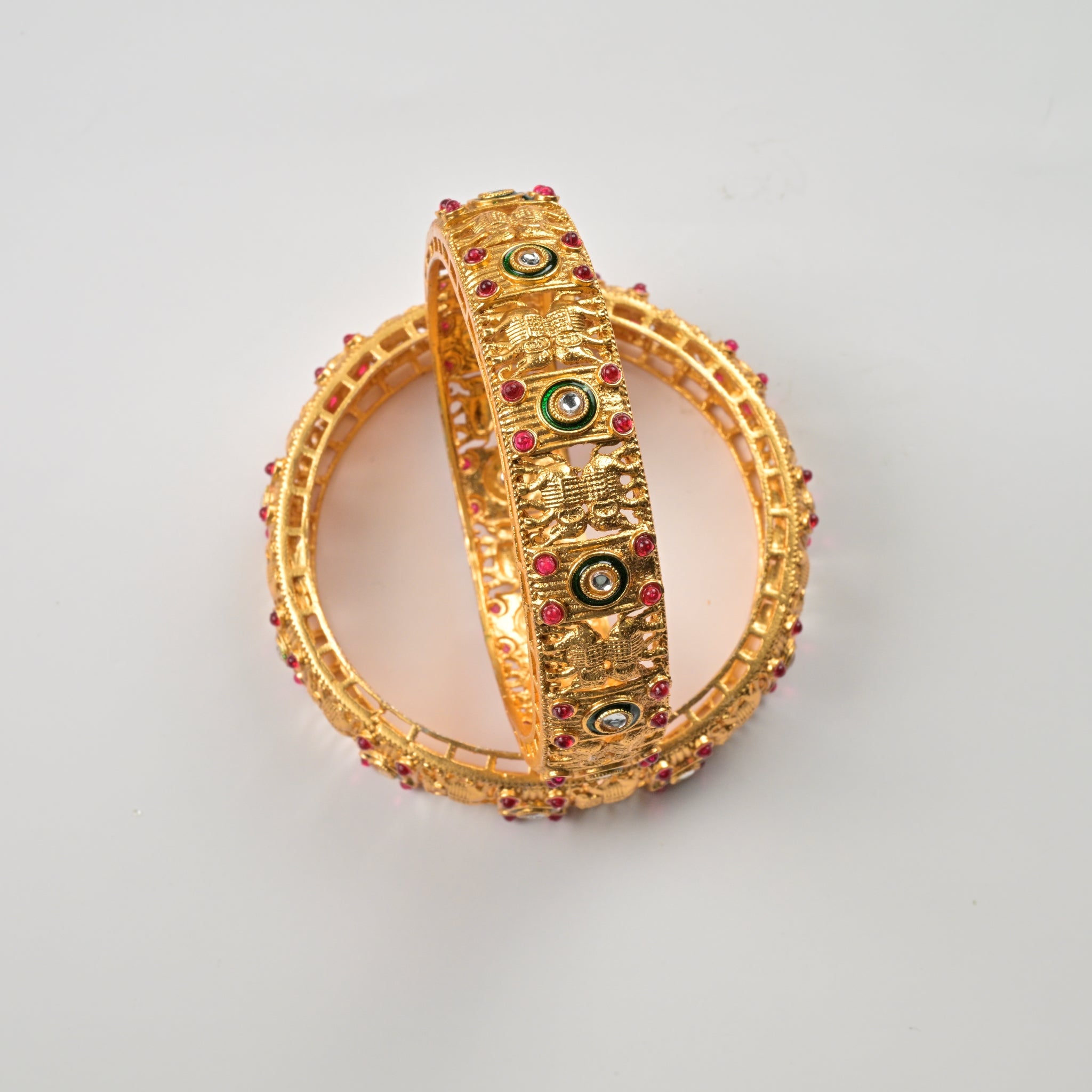 Set of 4 Antique Gold-Plated Bangles with Green Meena and Kundan Work for Women