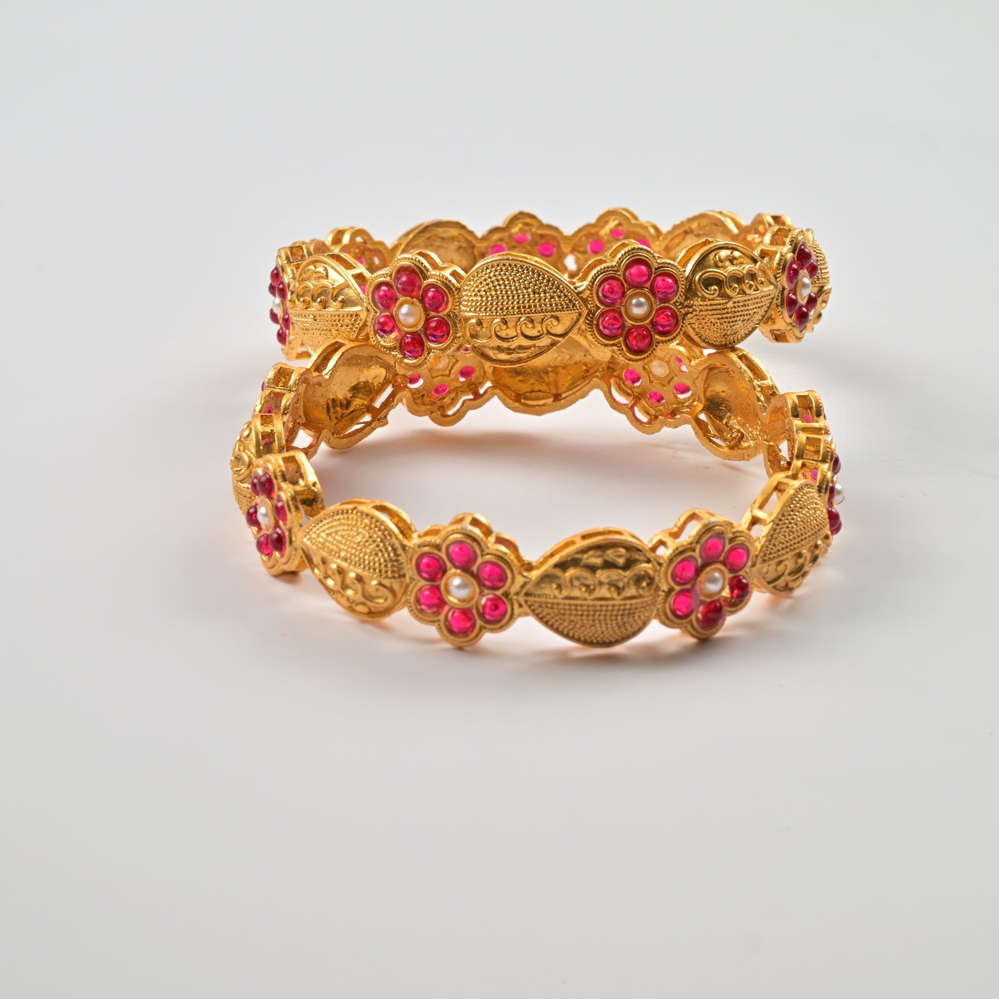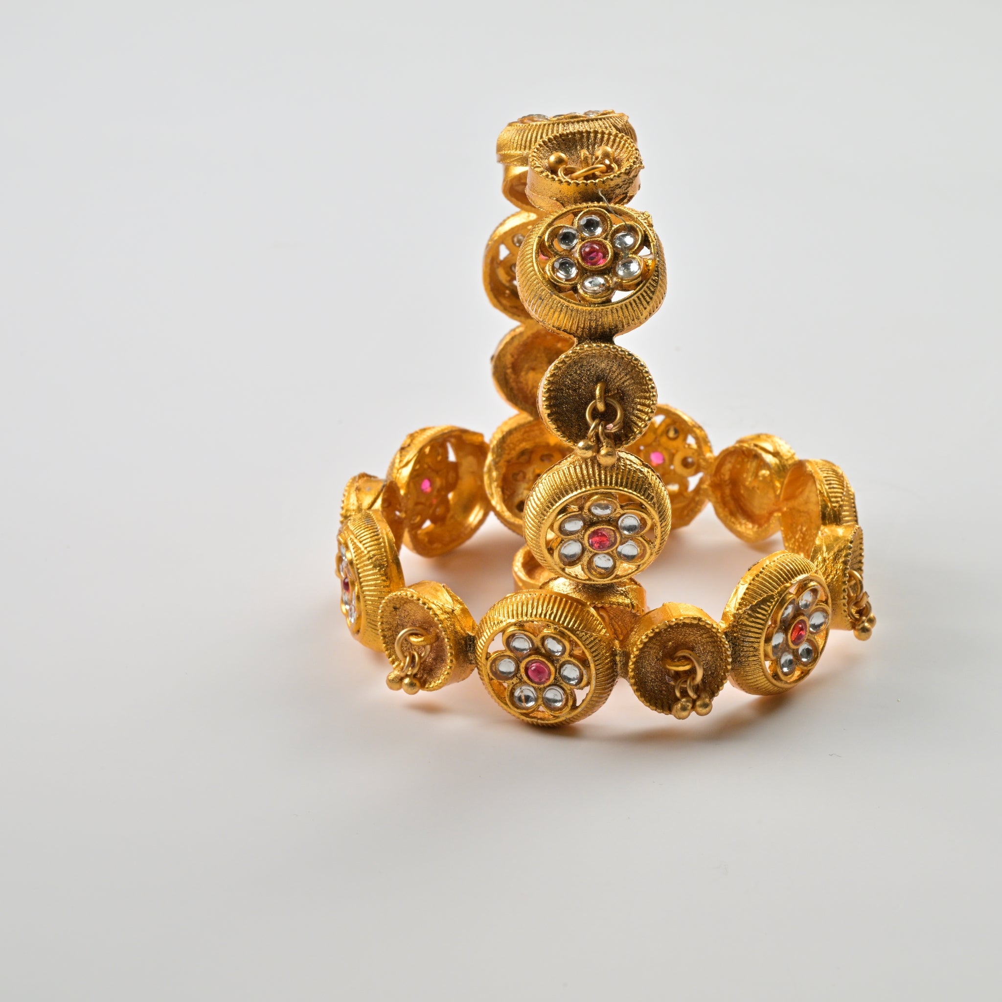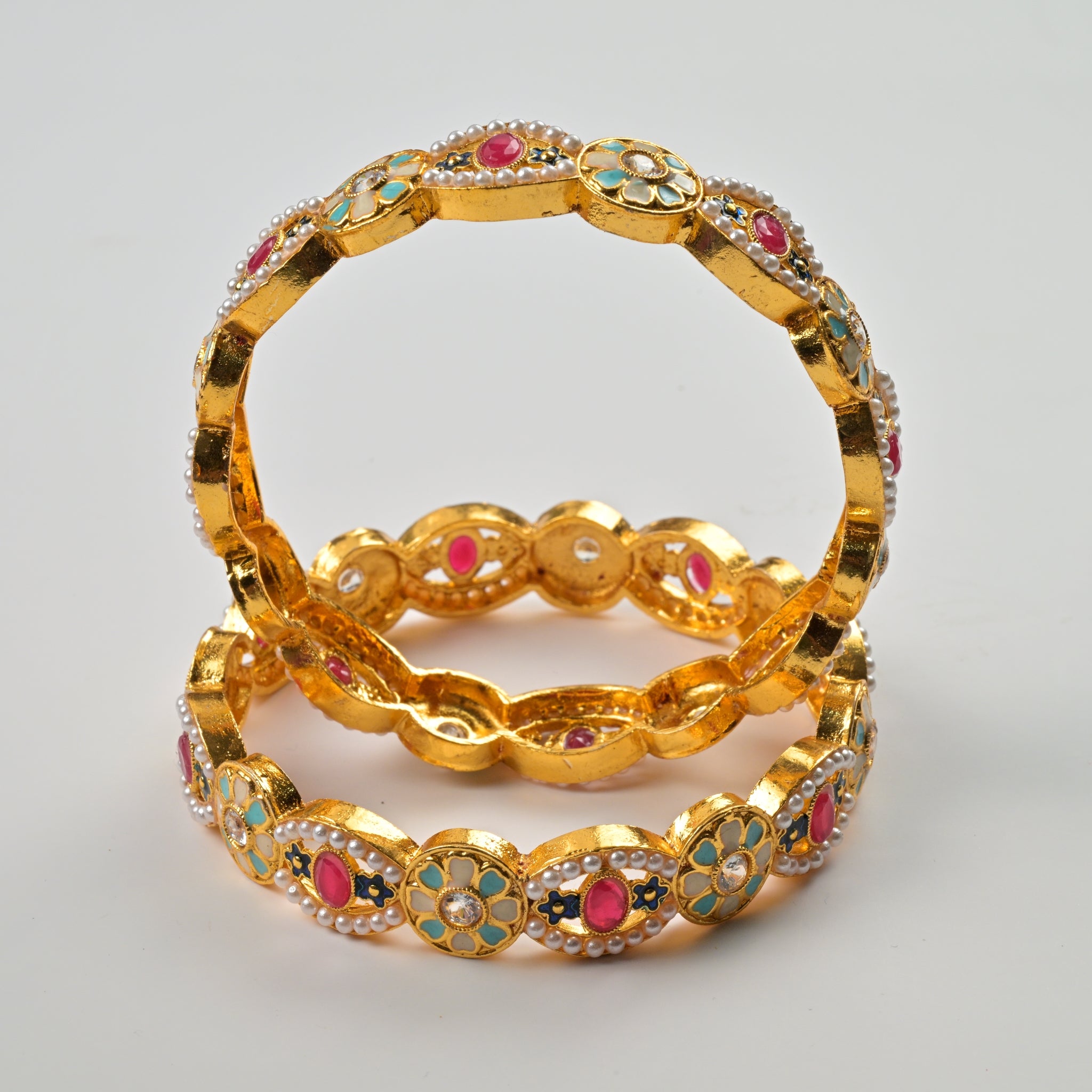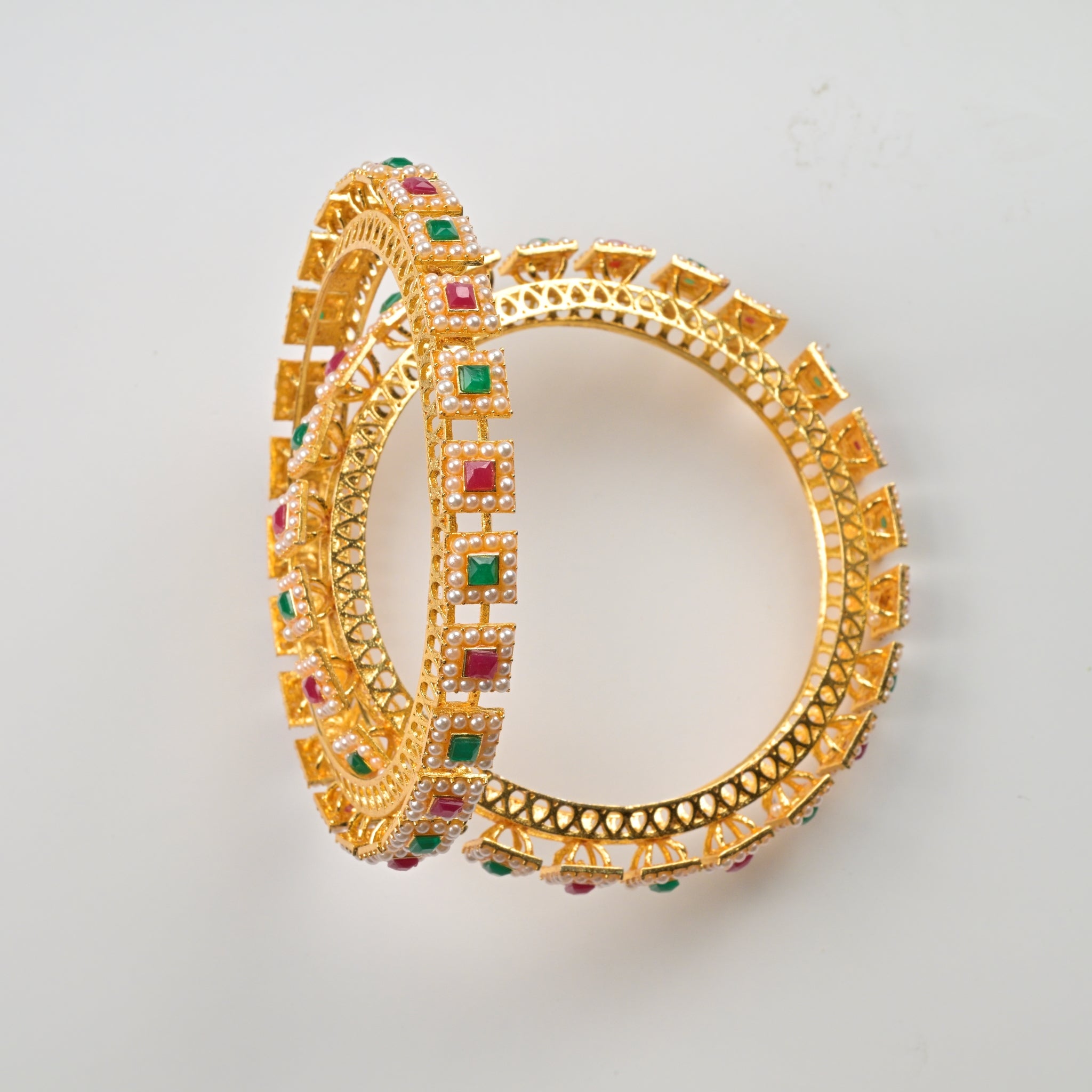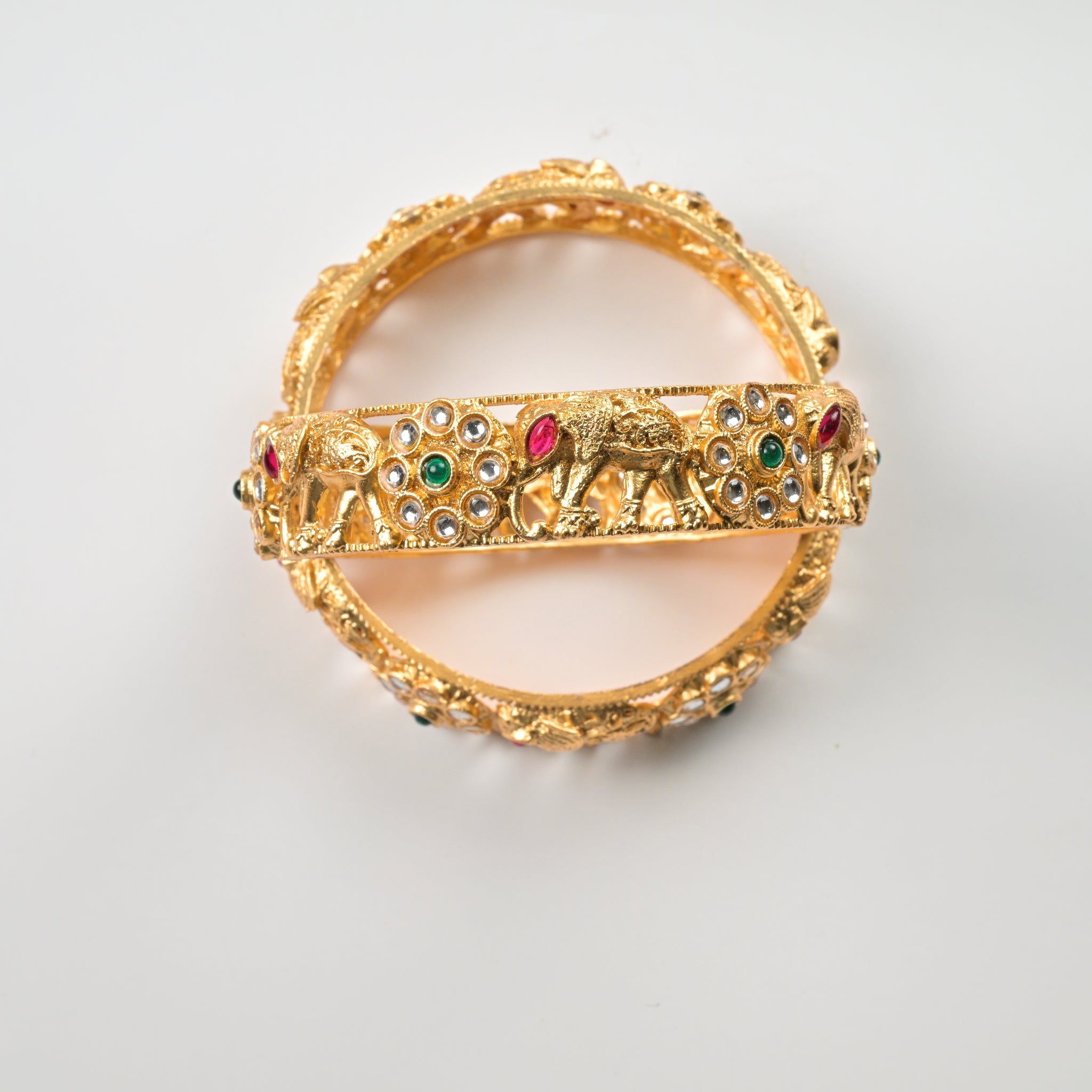 Set of 4 Antique Gold-Plated Bangles with Green Meena and Kundan Work for Women