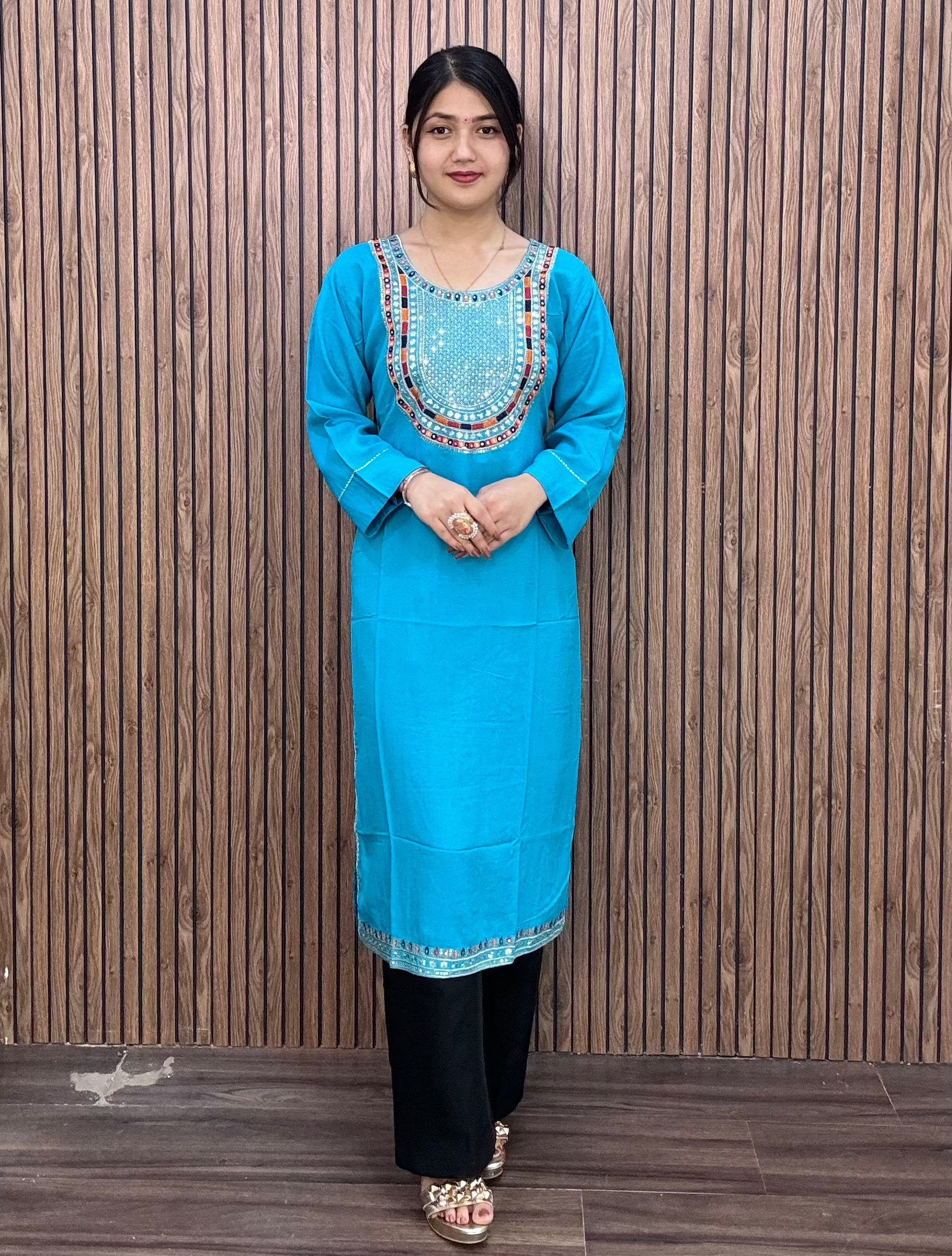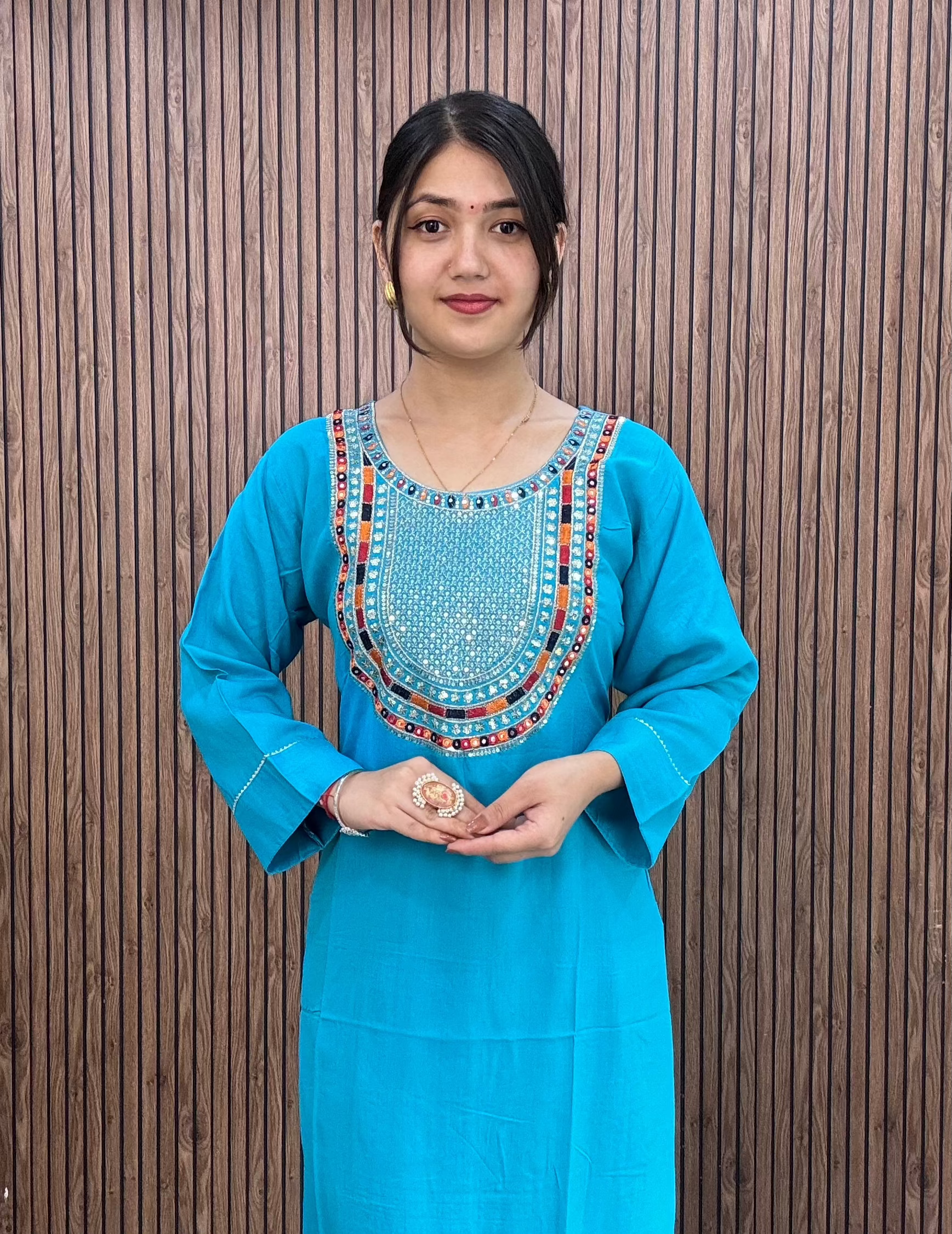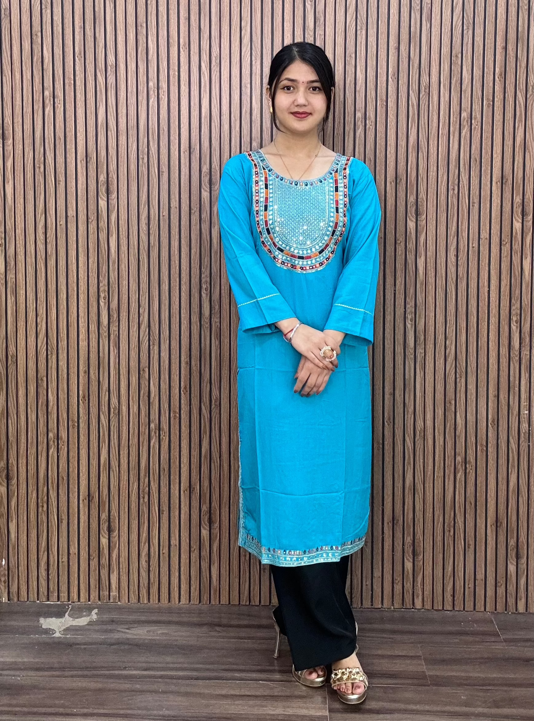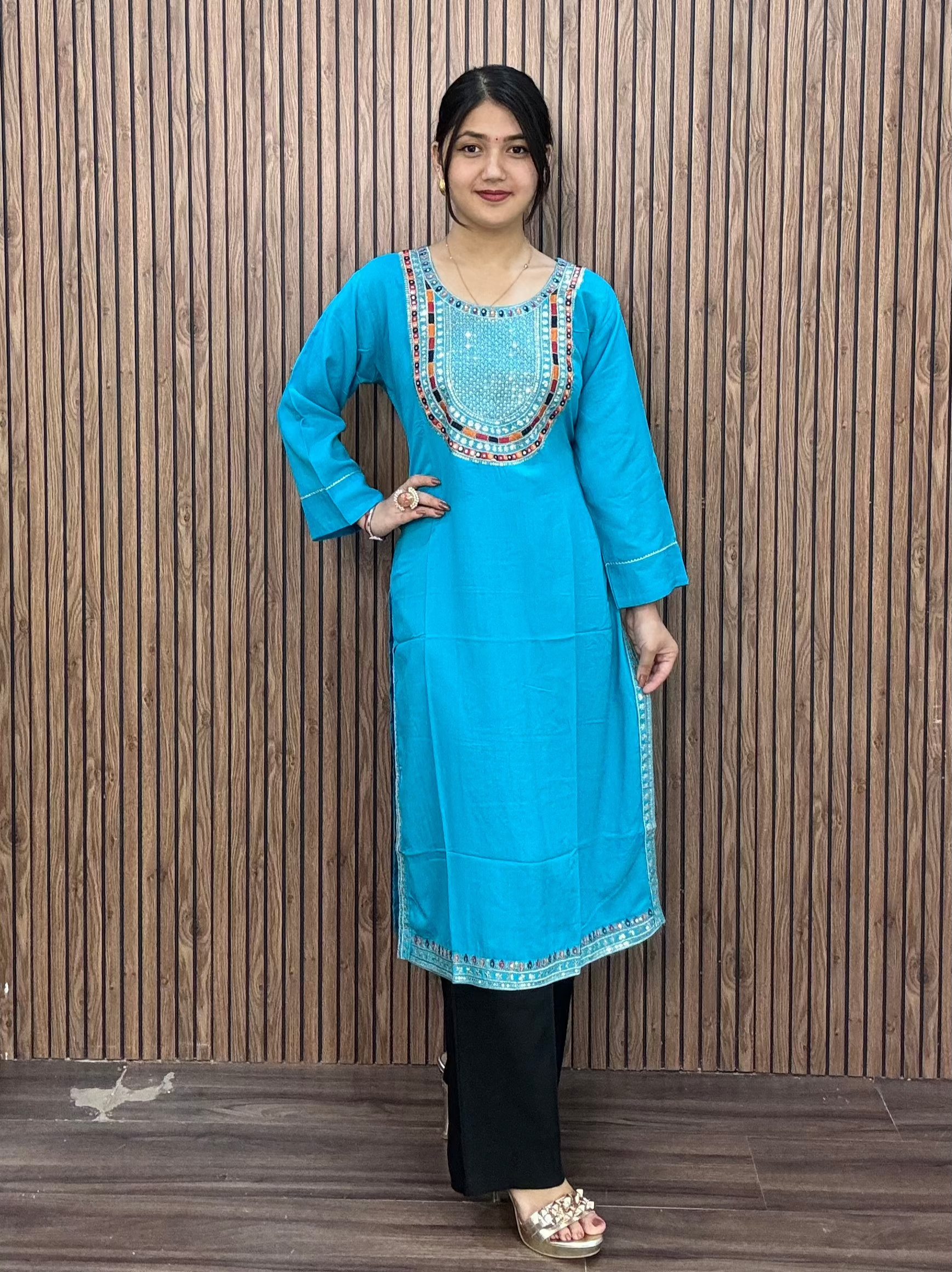 SKY BLUE REYON FABRIC WITH HANDWORK KURTI