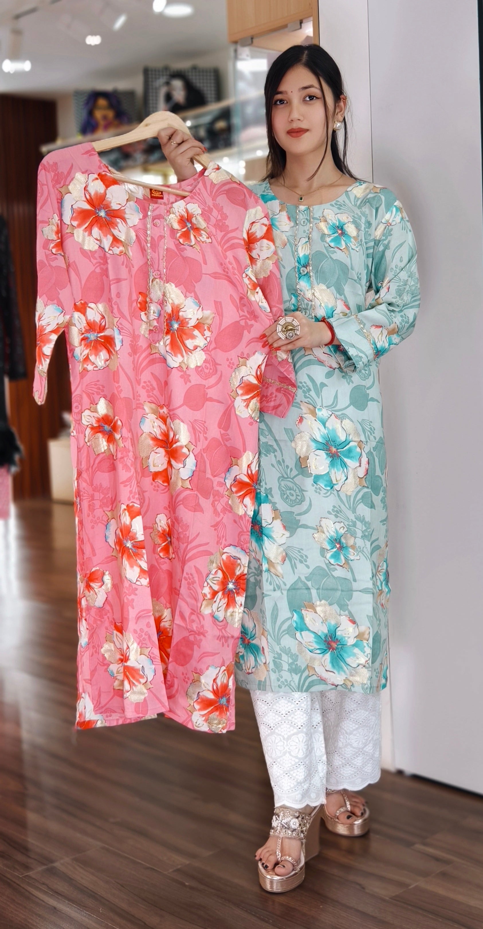 SKY BLUE,PINK AND YELLOW REYON FABRIC WITH FLOWER PRINT KURTI