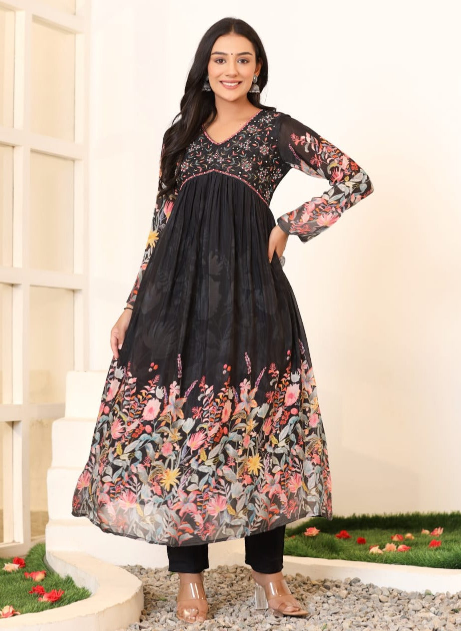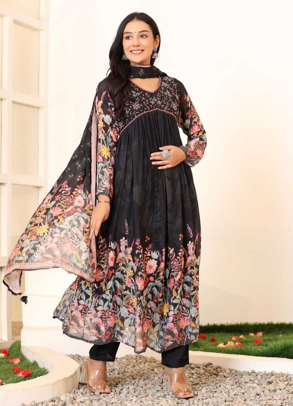 This elegant black printed anarkali suit features intricate floral embroidery, adding a touch of sophistication and charm to your ensemble. Perfect for special occasions or festive events, this outfit exudes grace and style, making you stand out in any crowd. Made with high-quality materials, this anarkali suit is not only fashionable but also comfortable to wear, ensuring you look and feel your best throughout the day or night.