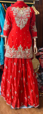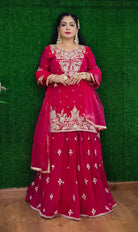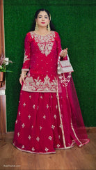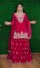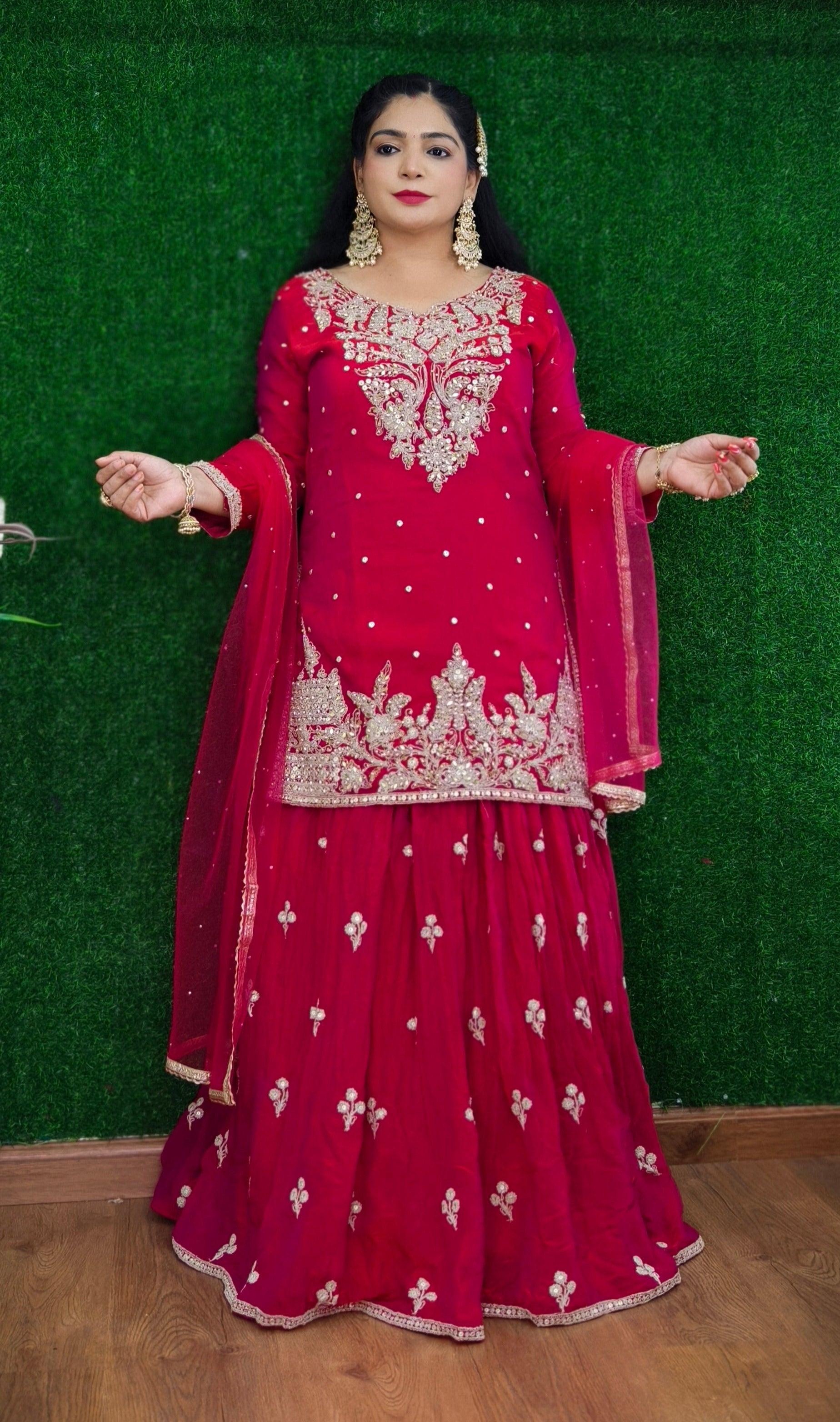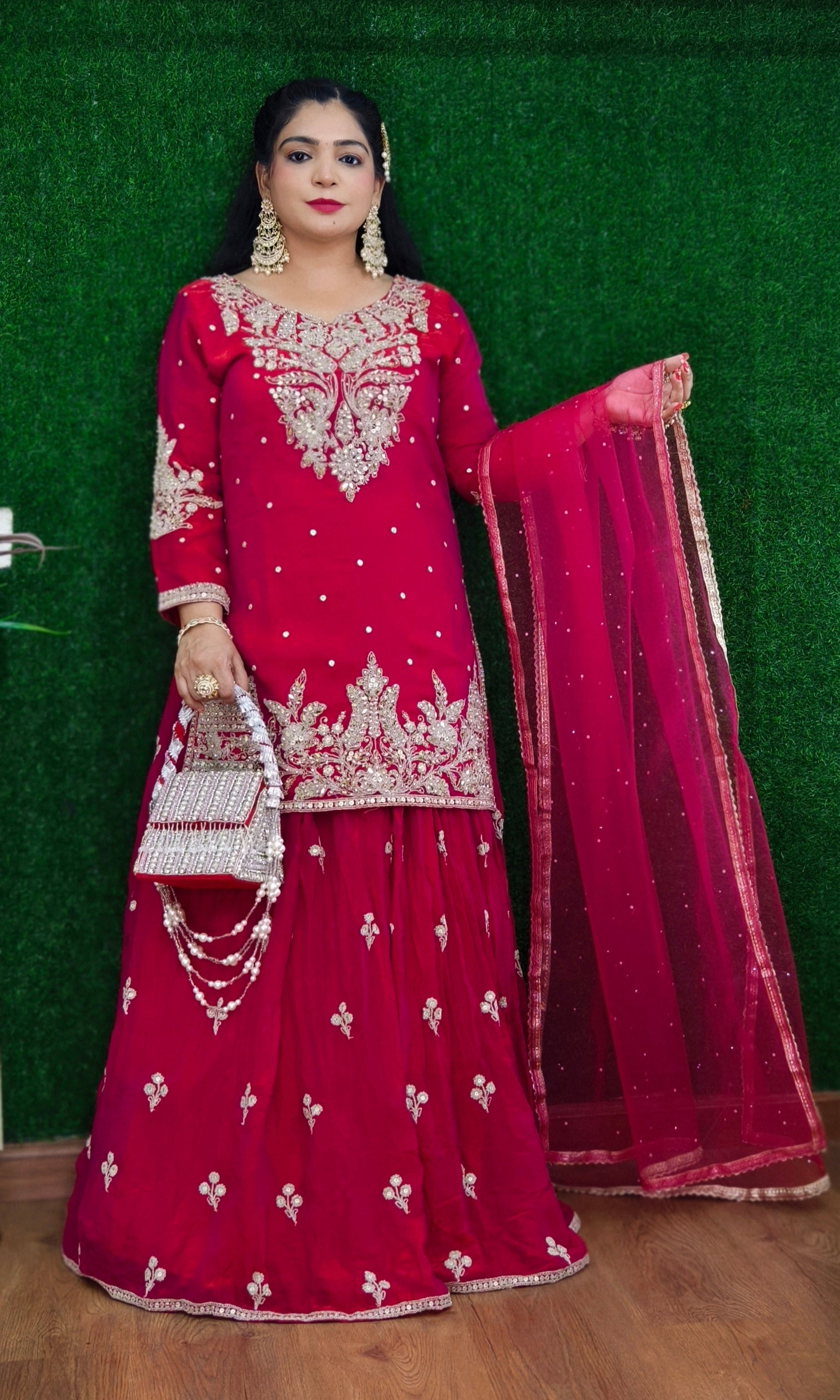PINK AND RED PREMIUM CREPE PARTYWEAR SUIT WITH HEAVY DUPATTA AND SKIRT