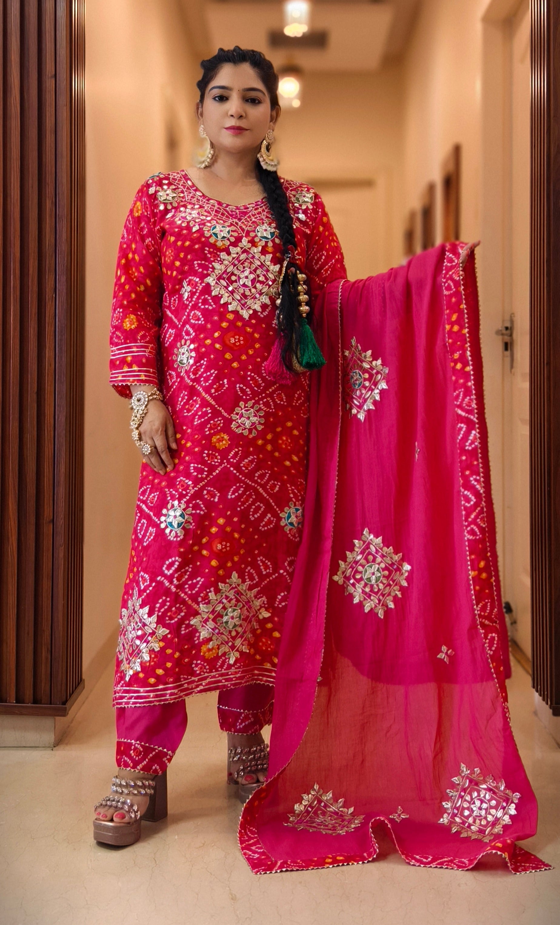 This elegant PINK PREMIUM REYON BANDHNI SUIT WITH HANDWORK AND SIFFON DUPATTA is the perfect addition to your wardrobe. The intricate embroidery and delicate detailing make it a timeless and sophisticated choice for any special occasion. Made with high-quality fabric, this suit is not only stylish but also comfortable to wear. Whether you're attending a wedding, a party, or a festive celebration, this suit is sure to make you stand out in the crowd.