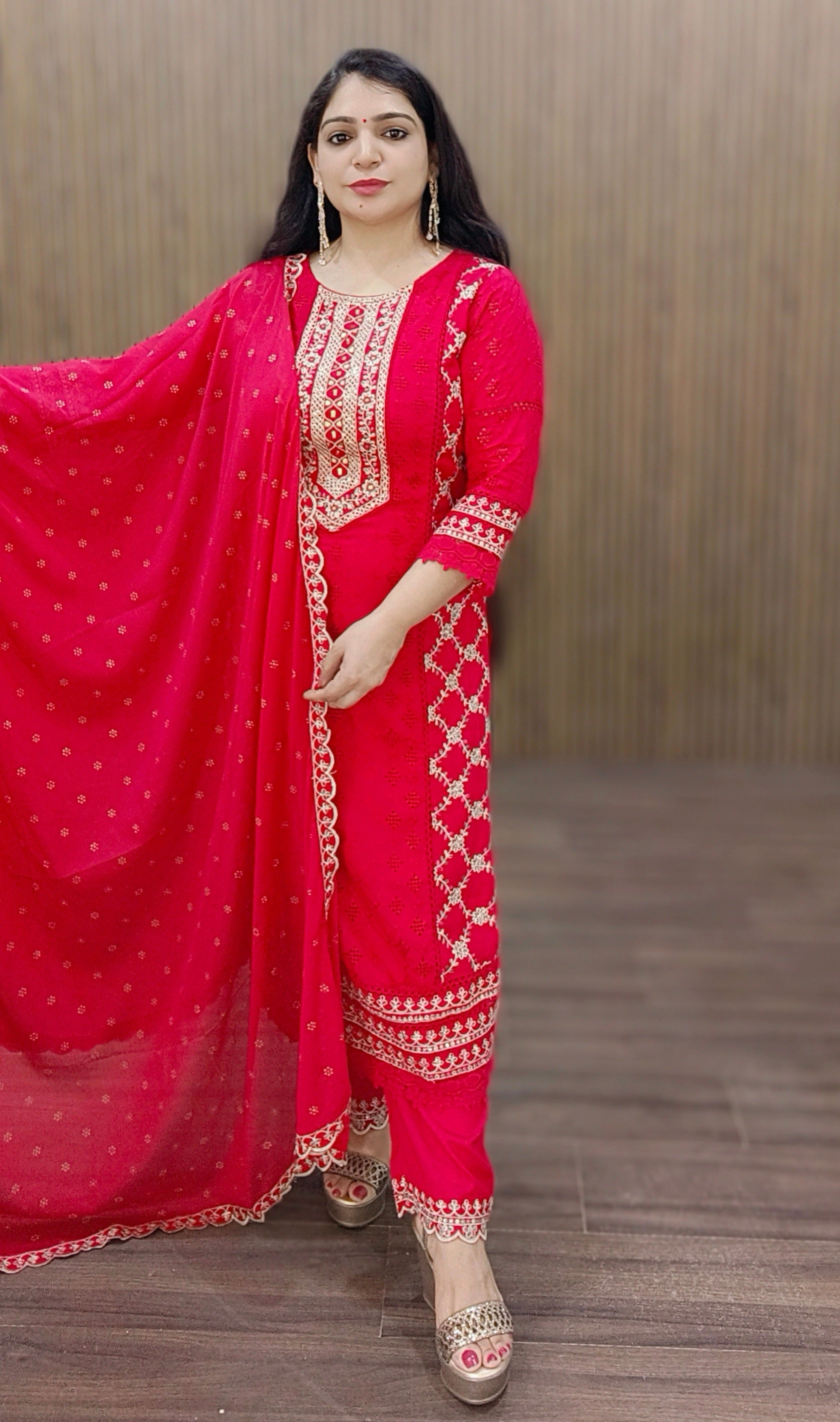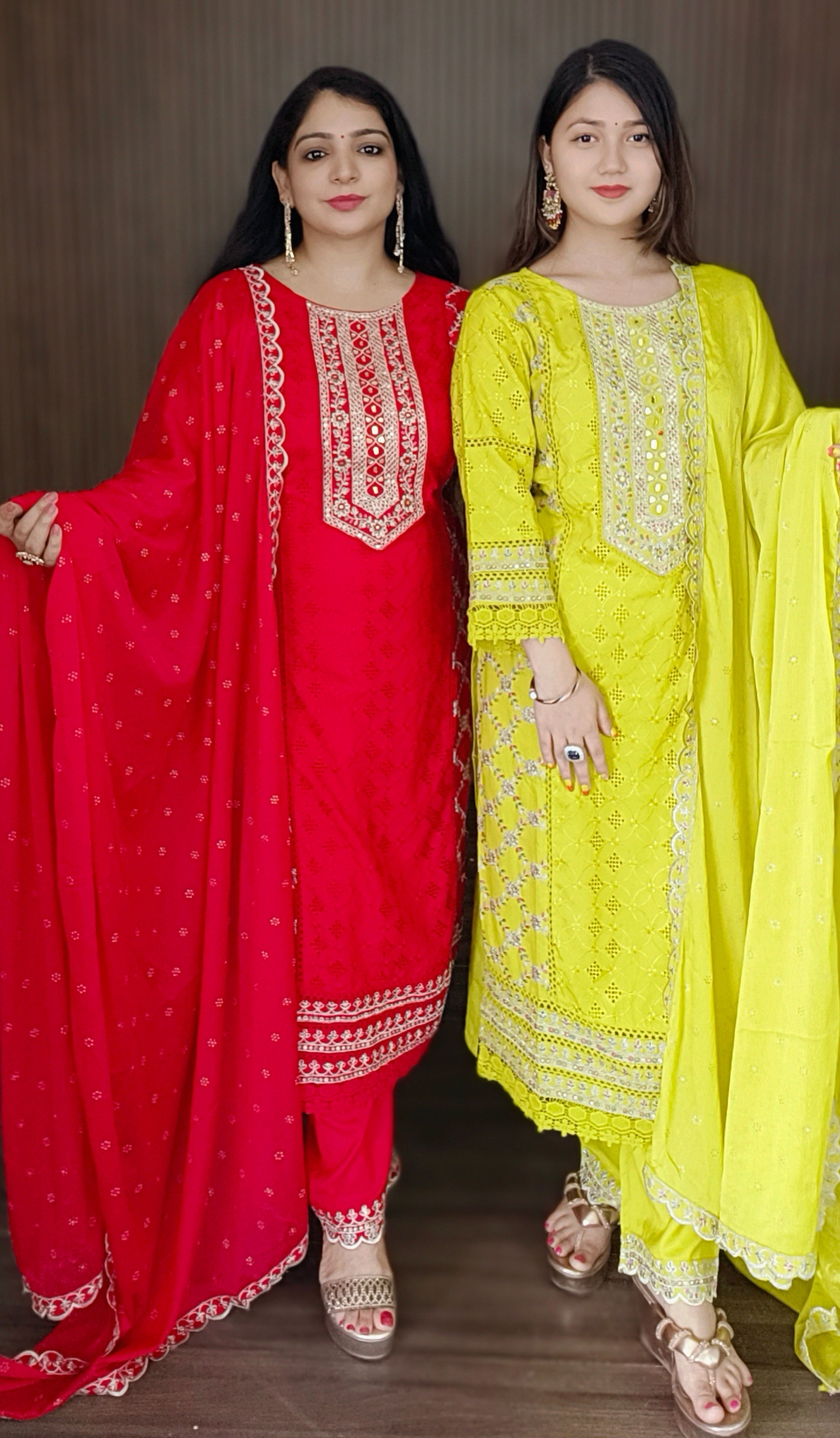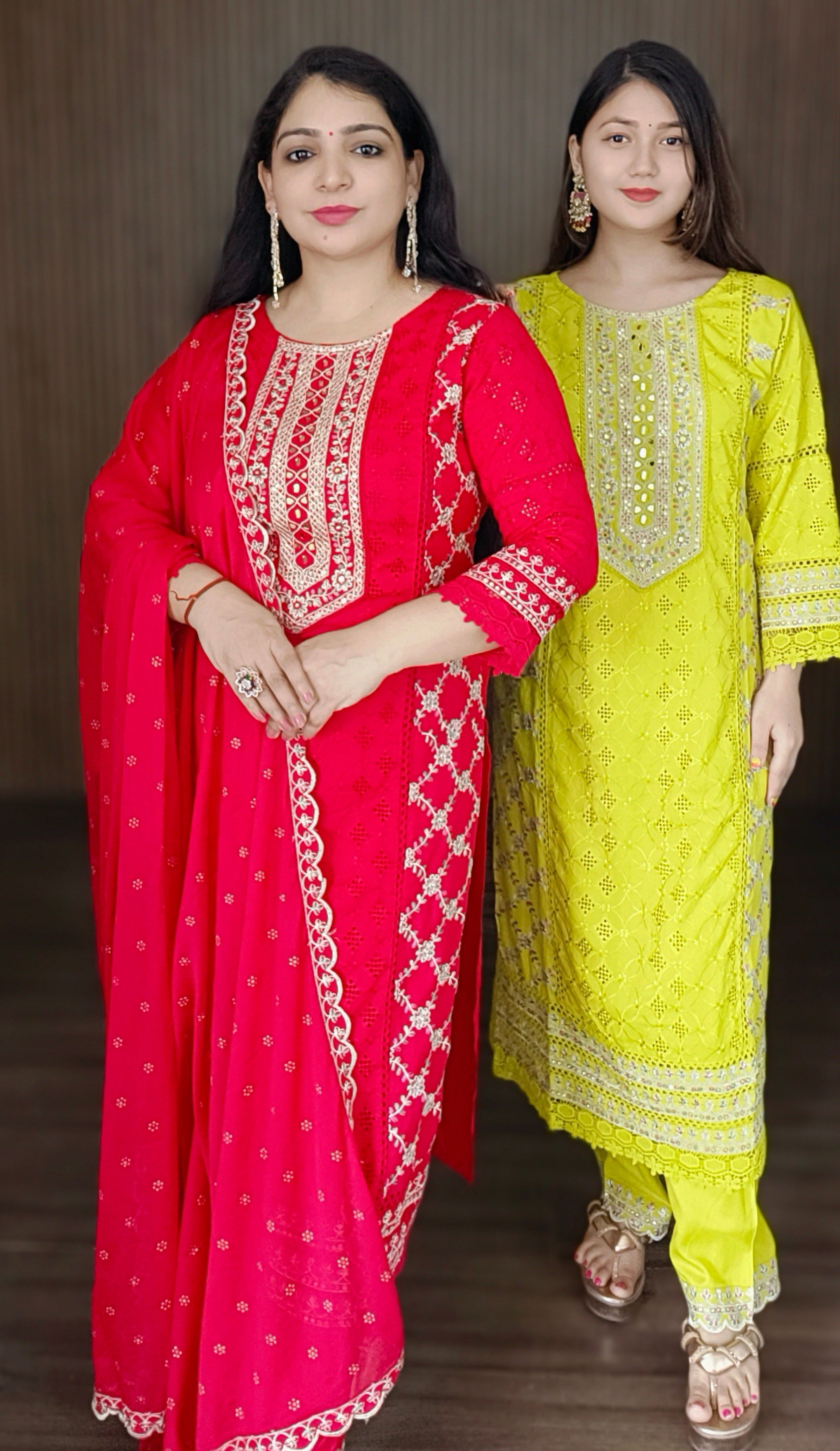 A must have RANI PINK AND YELLOW COTTON EMBROIDERED SUIT WITH CHINON DUPATTA in your wardrobe.