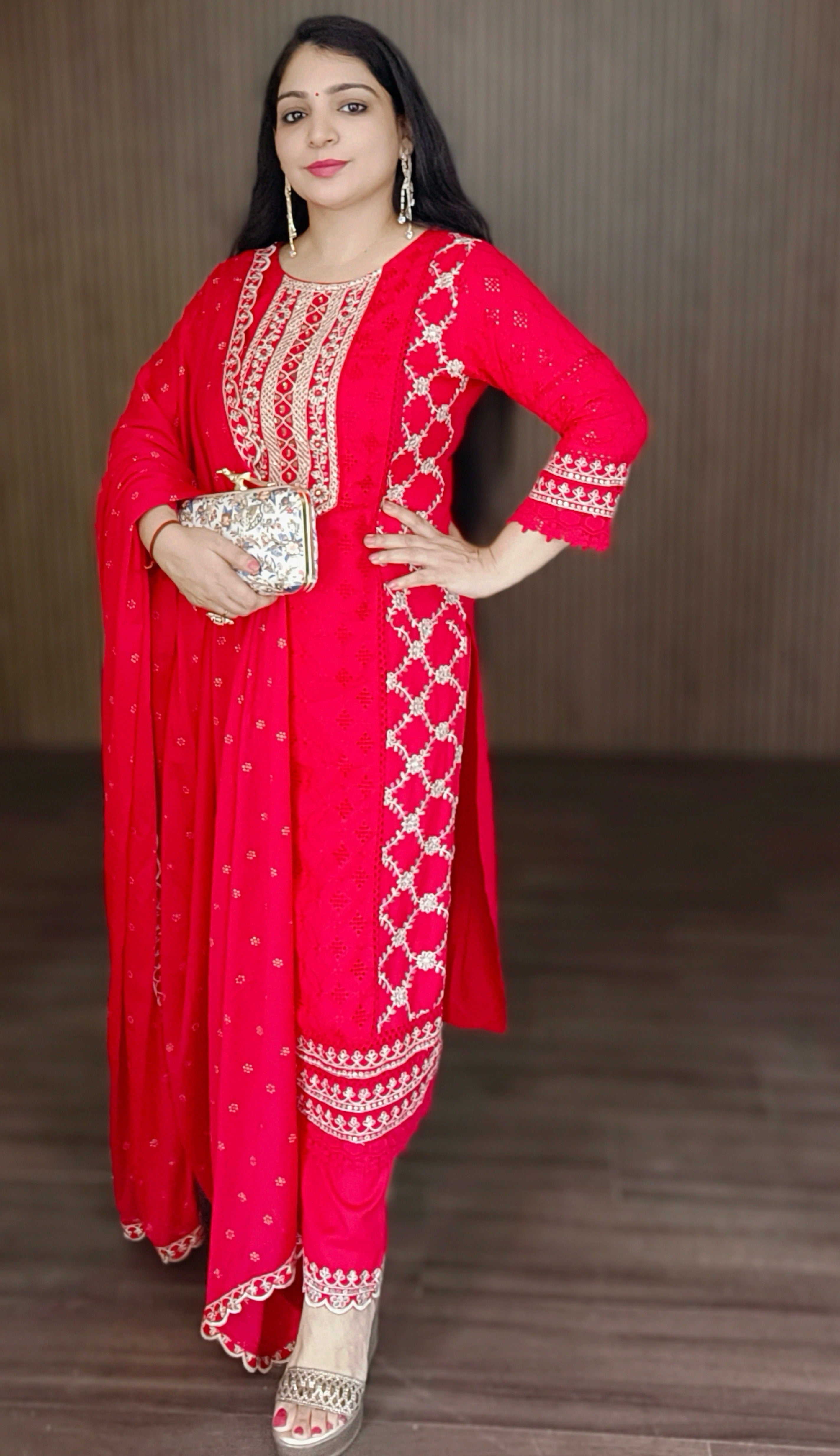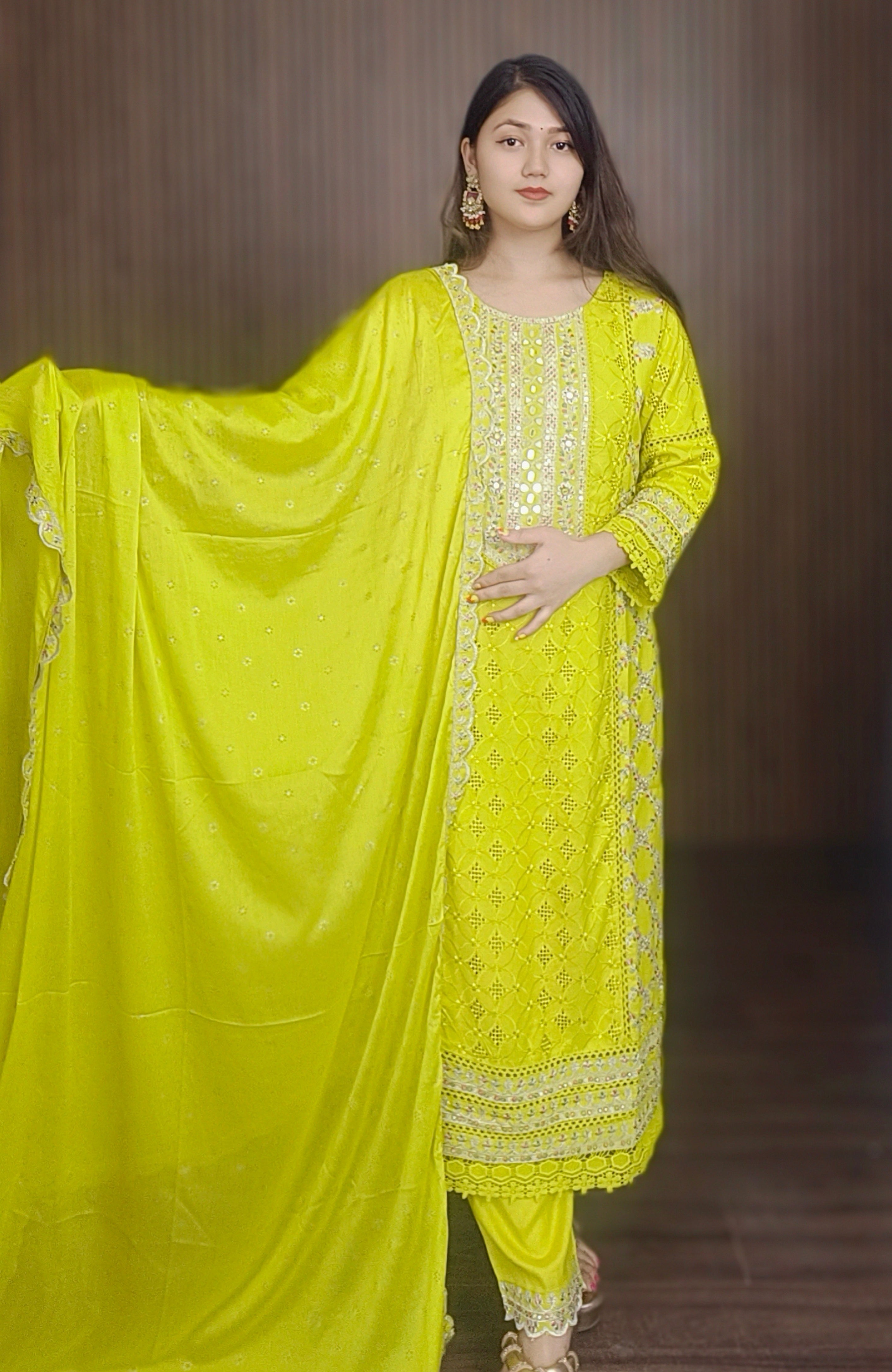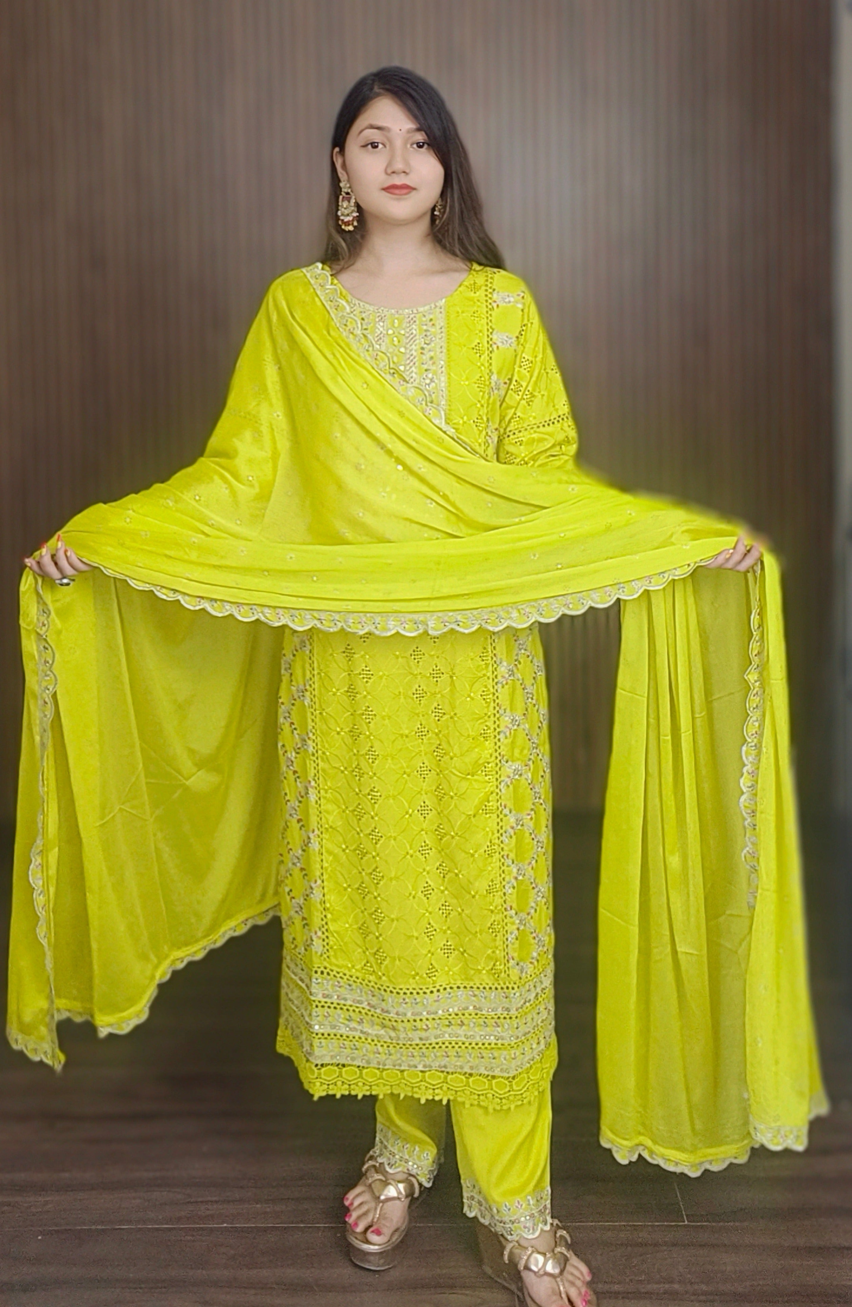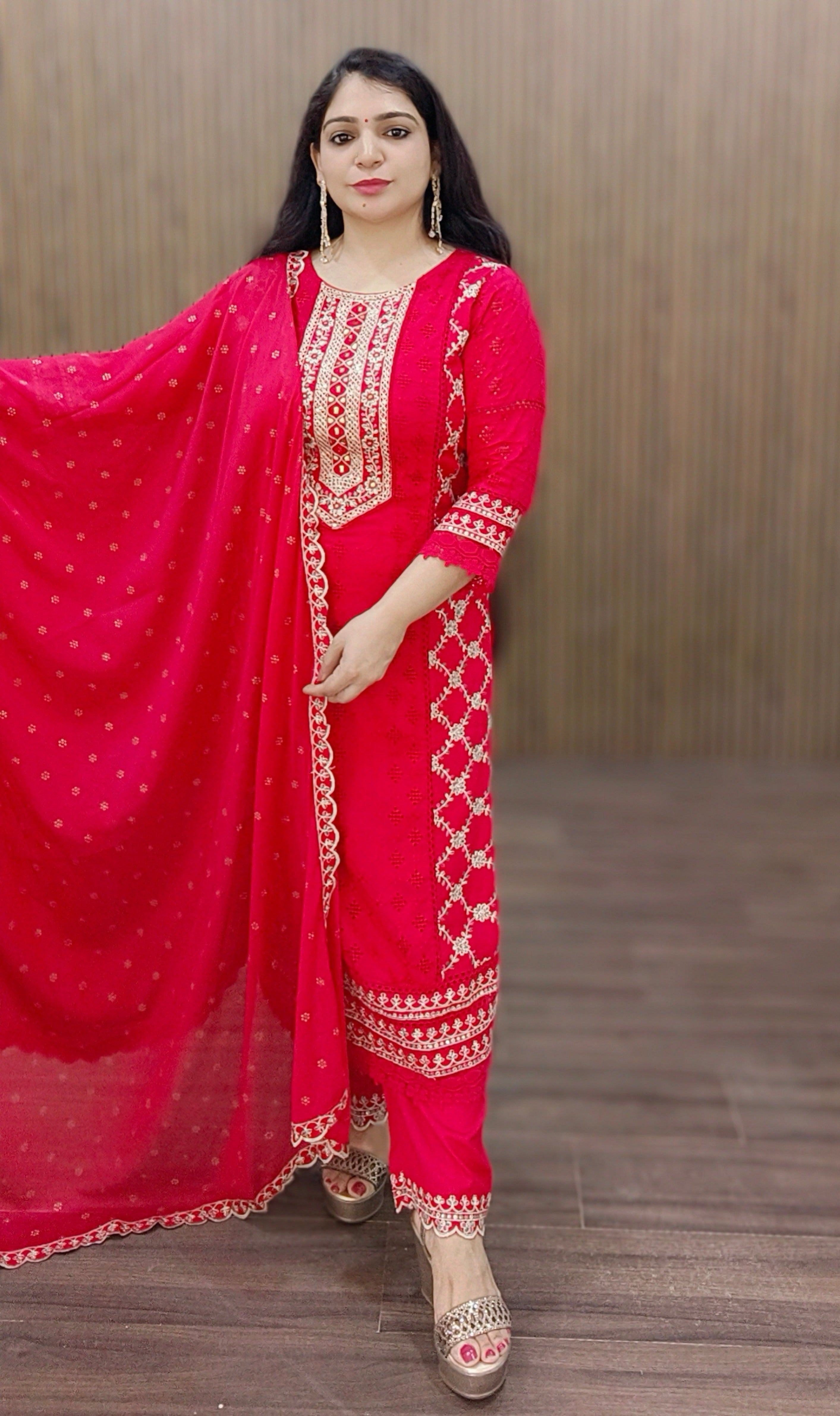 A must have RANI PINK AND YELLOW COTTON EMBROIDERED SUIT WITH CHINON DUPATTA in your wardrobe.