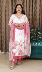 This elegant ensemble features a Chinon Top, designed with intricate all-over handwork that adds a touch of sophistication. The top is adorned with exquisite delicate lace detailing, enhancing its visual appeal. It is paired with a Premium Shantoon Bottom, offering both comfort and style. Perfect for special occasions, this outfit exudes timeless charm and elegance.