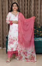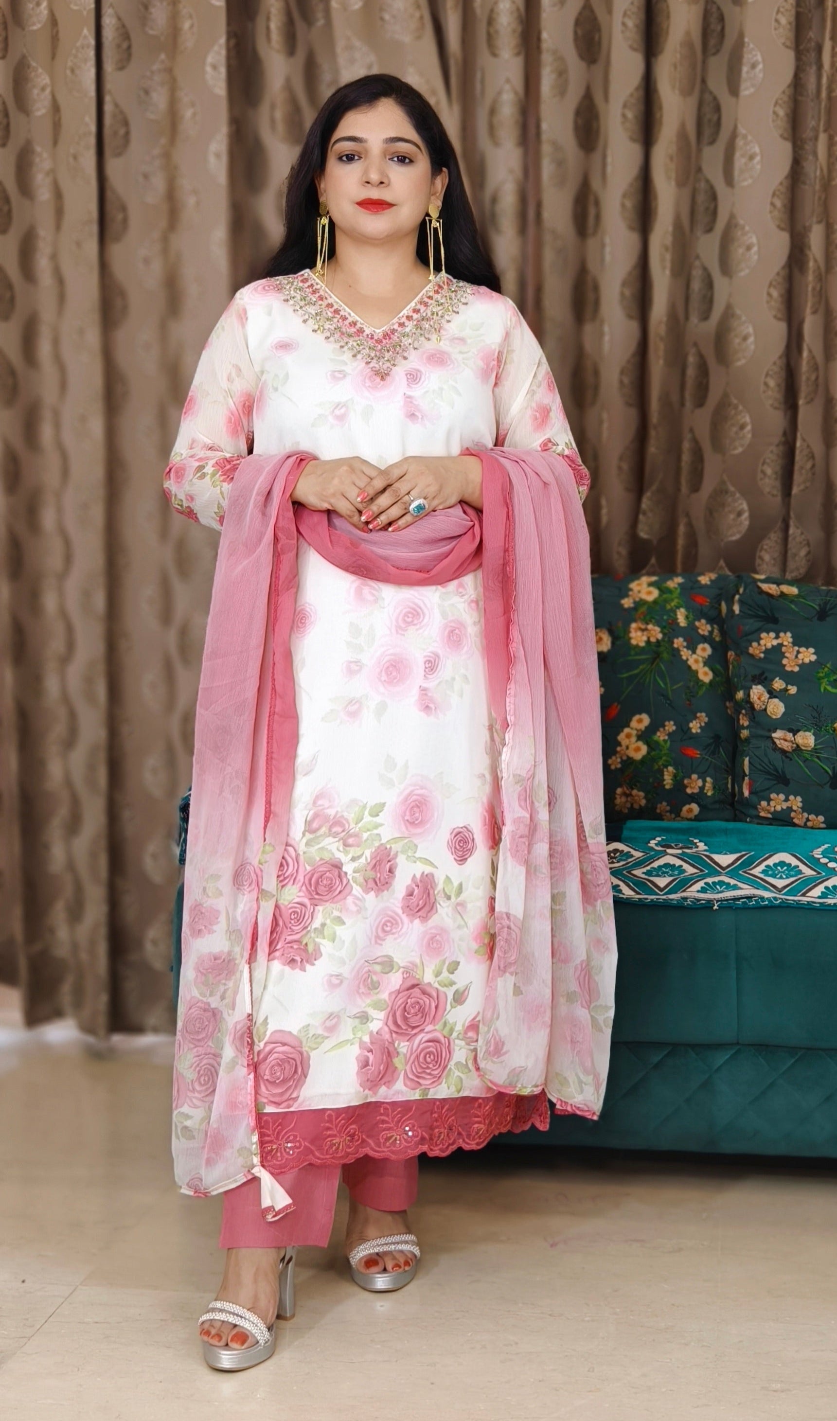 WHITE/PINK CHINON TOP FEATURING INTRICATE ALL-OVER HANDWORK,AND DELICATE LACE DETAILING, PAIRED